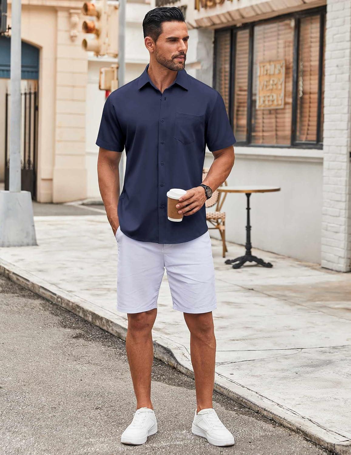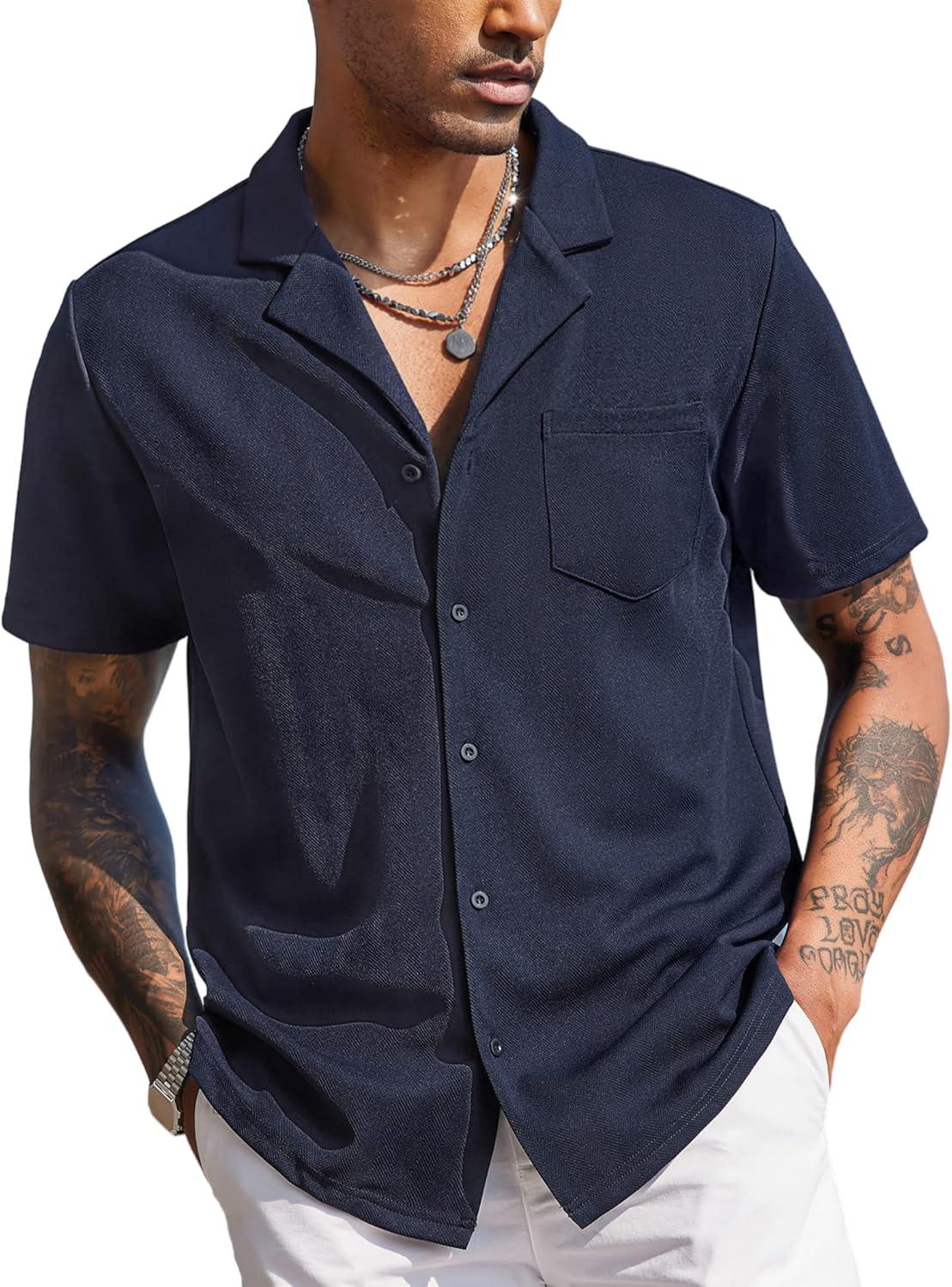 COOFANDY Button Down Shirt for Men Short Sleeve Casual Shirt Summer Beach Vacation Shirt with Pocket(Dark Blue)