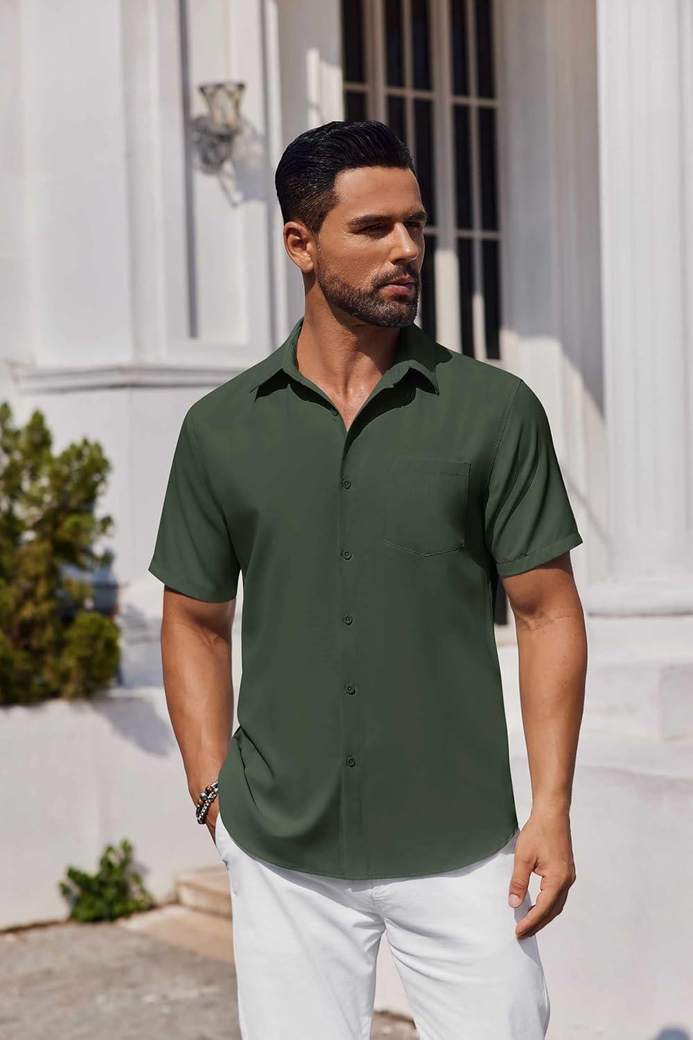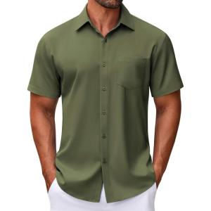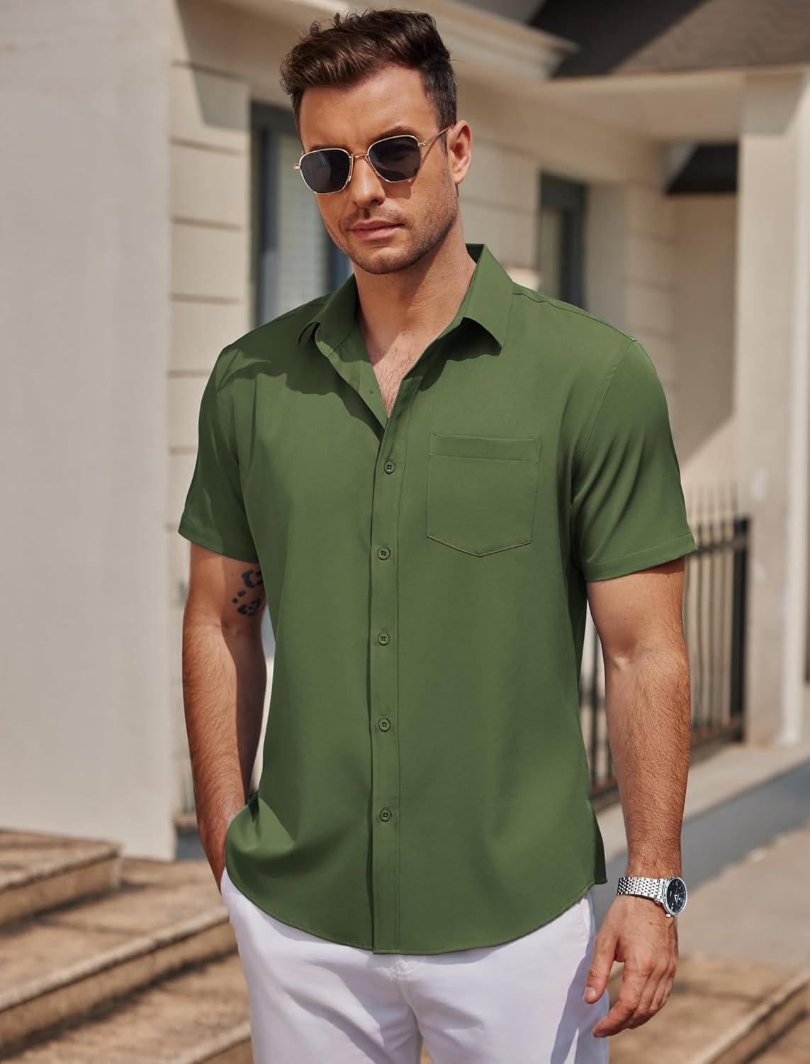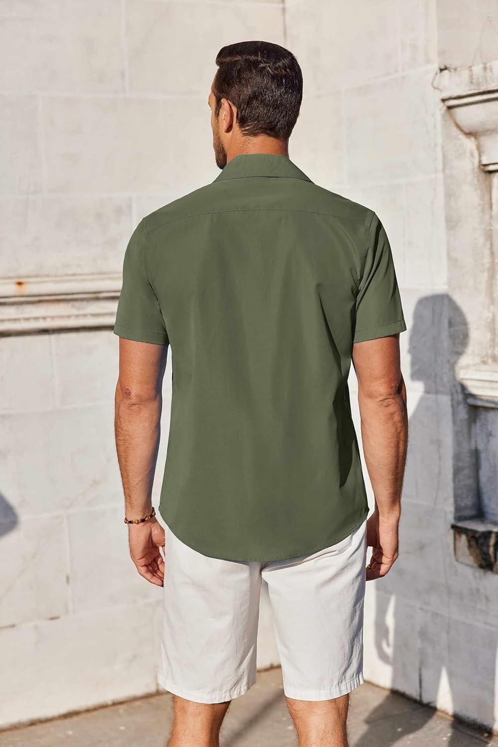 COOFANDY Mens Short Sleeve Button Down Shirt Wrinkle Free Dress Shirts Casual Summer Untucked Shirt(Army Green)