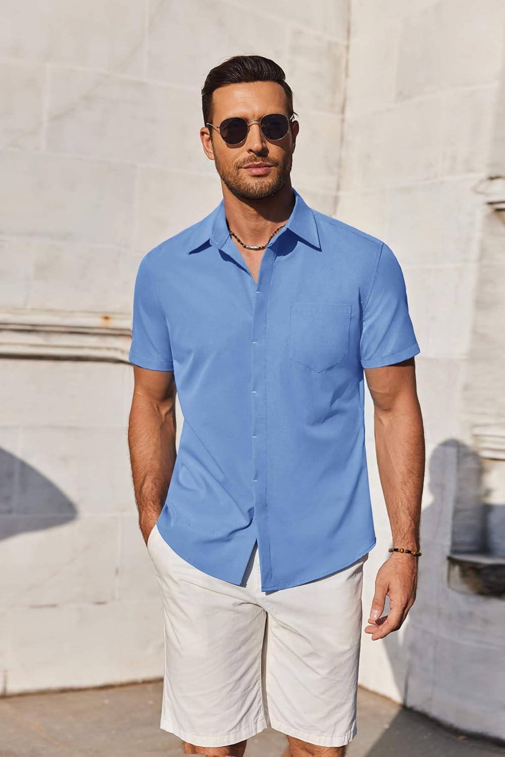 COOFANDY Button Down Shirt for Men Short Sleeve Casual Shirt Summer Beach Vacation Shirt with Pocket(Light Blue)