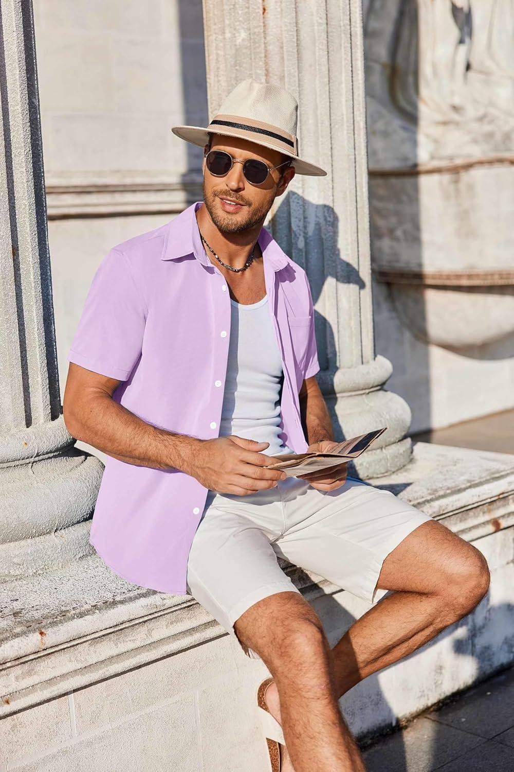 COOFANDY Button Down Shirt for Men Short Sleeve Casual Shirt Summer Beach Vacation Shirt with Pocket(Lavender)