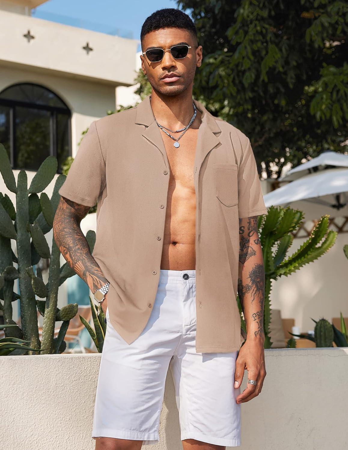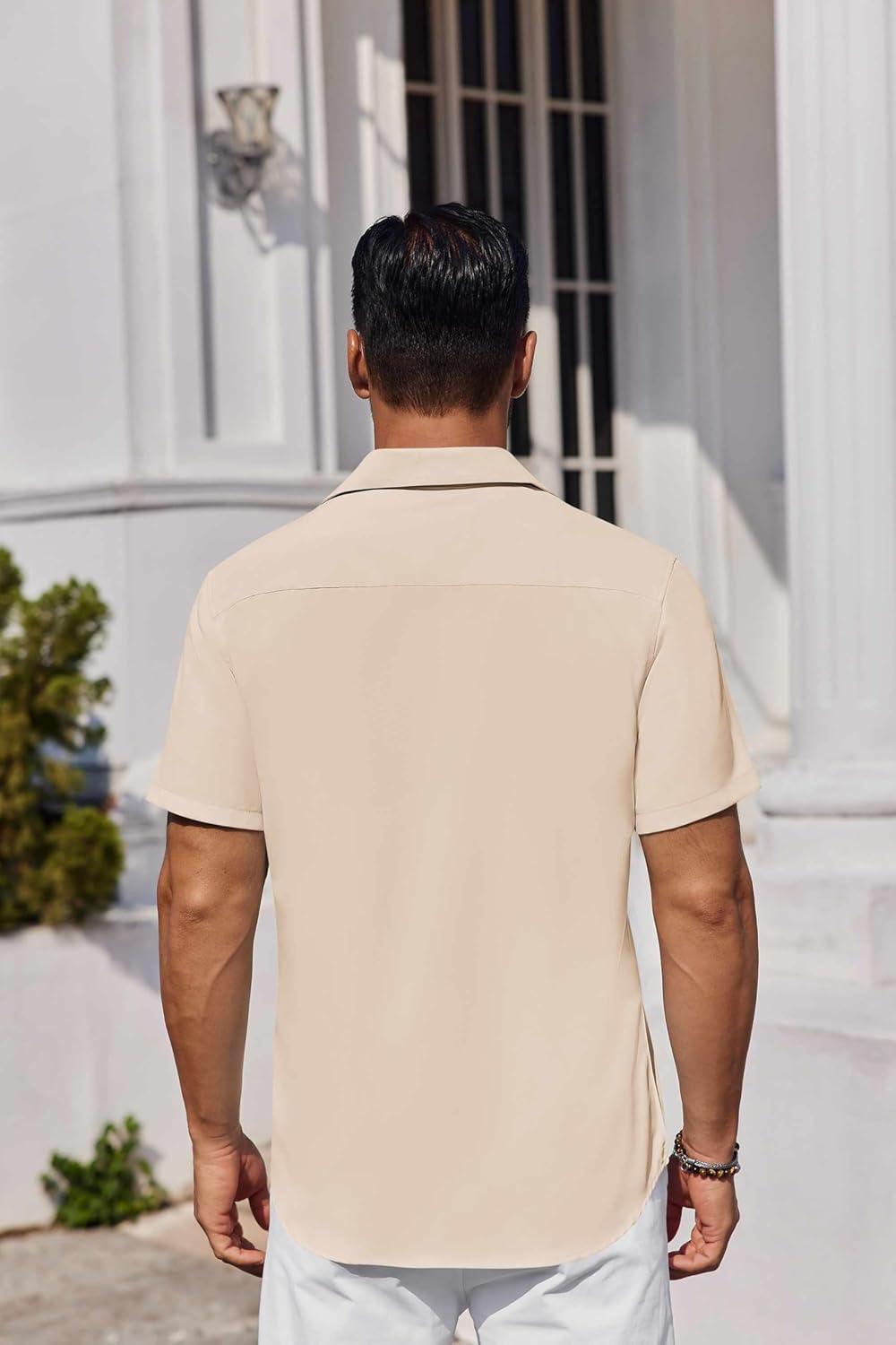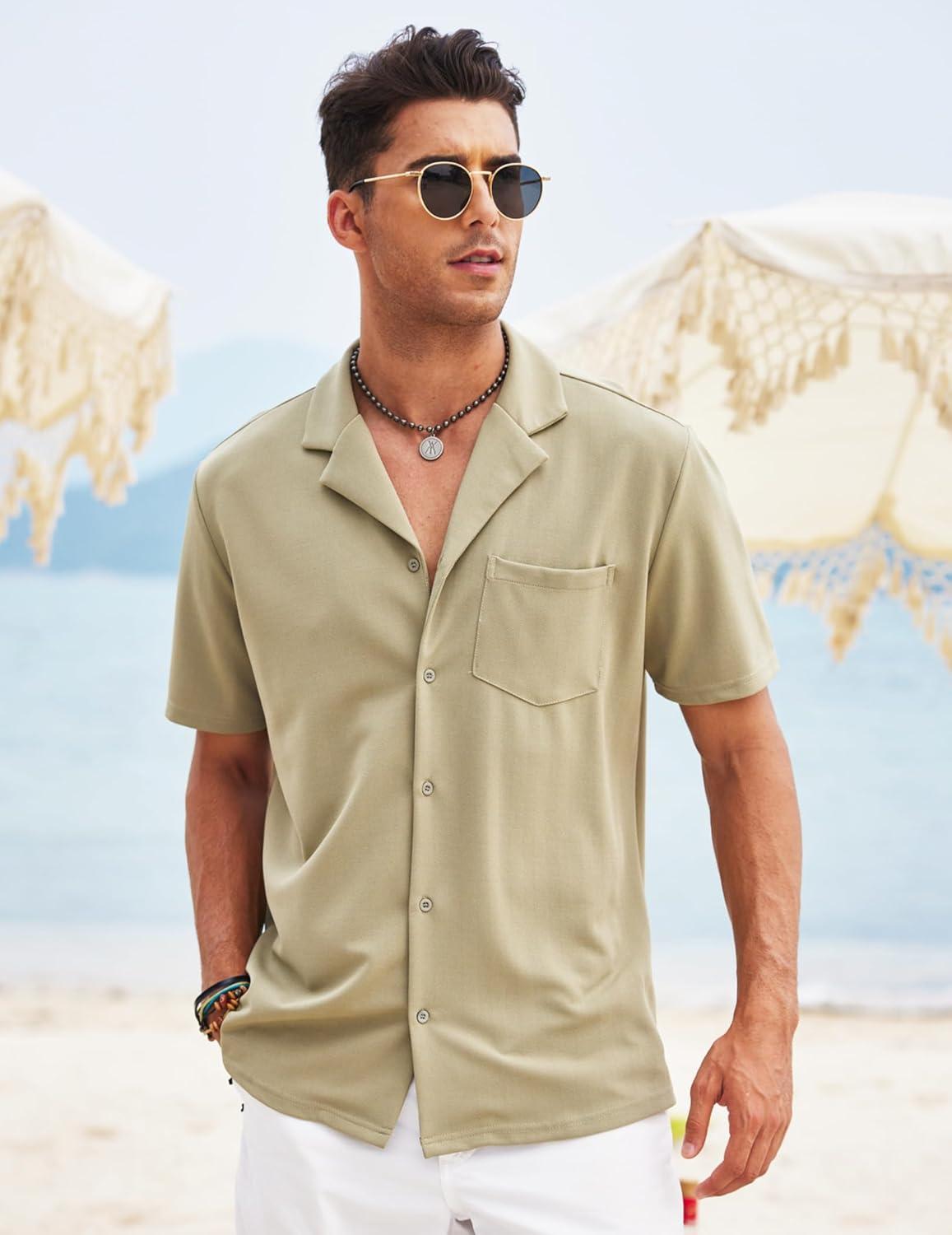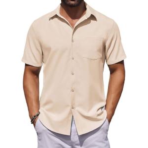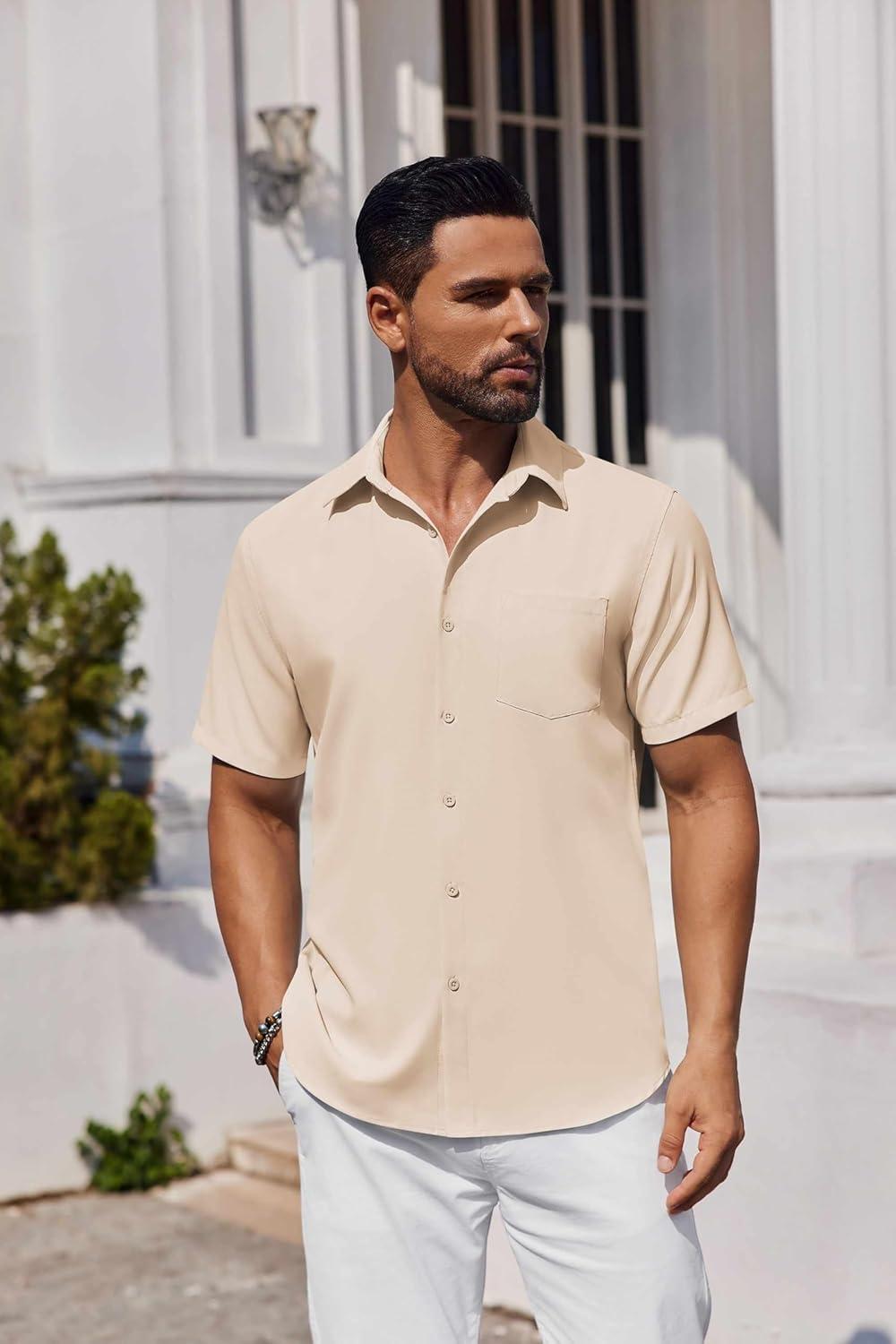 COOFANDY Button Down Shirt for Men Short Sleeve Casual Shirt Summer Beach Vacation Shirt with Pocket(Light Khaki)