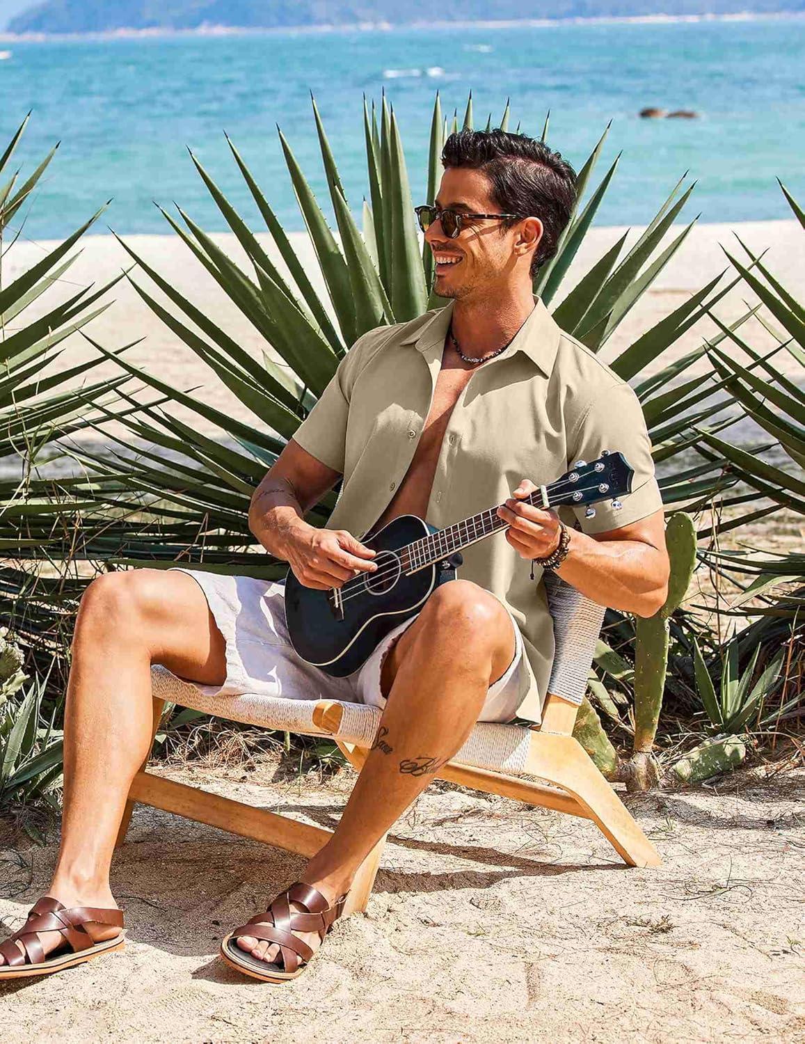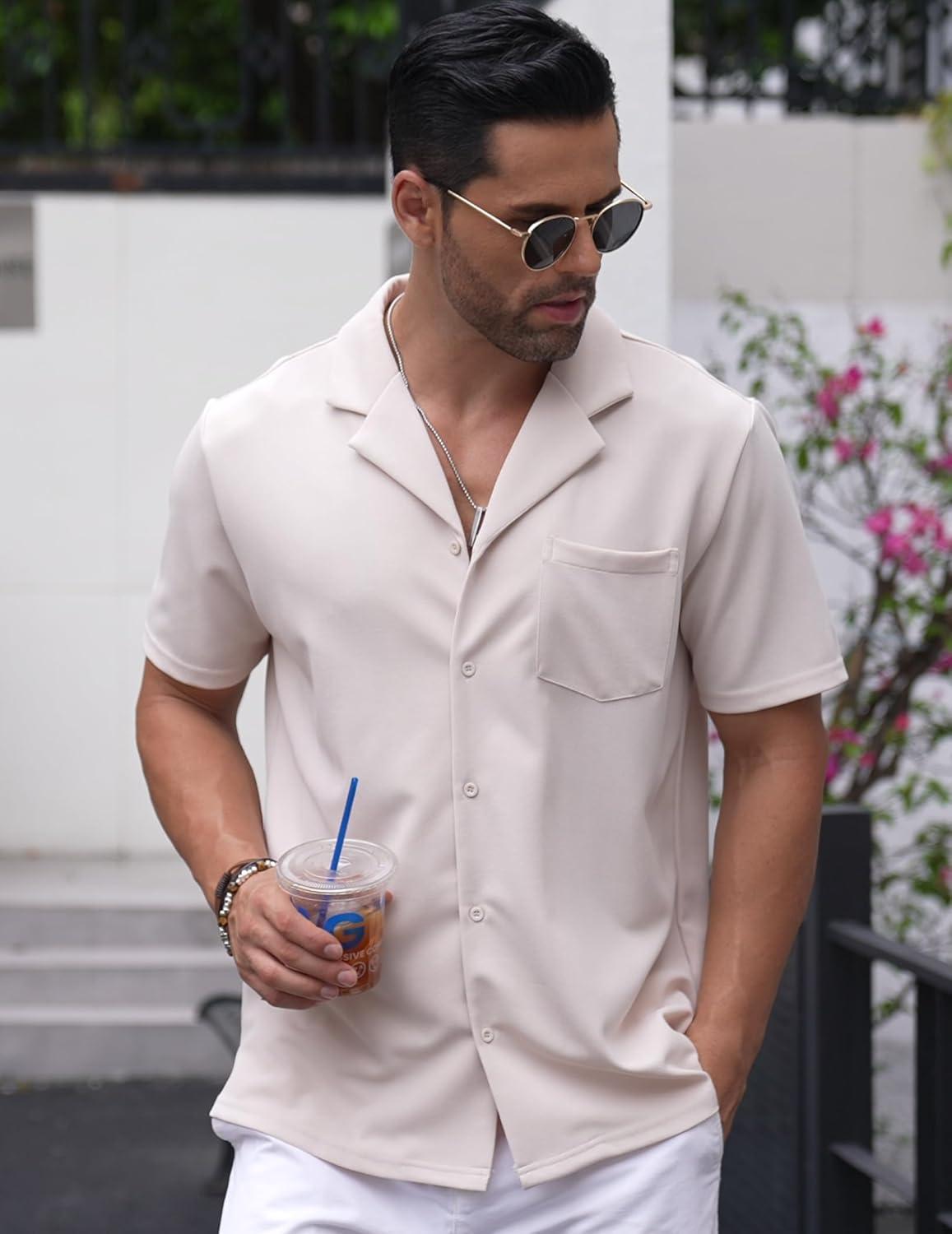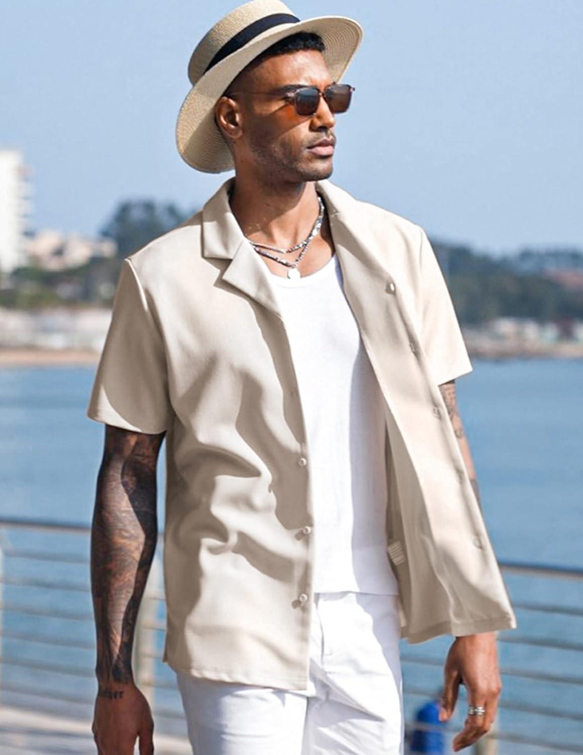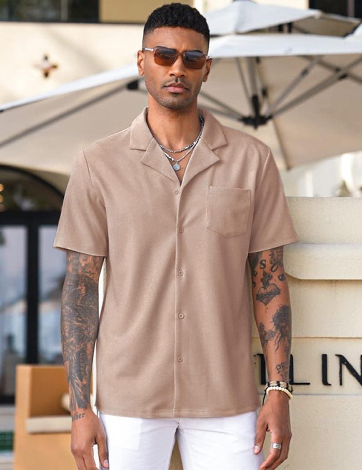 COOFANDY Button Down Shirt for Men Short Sleeve Casual Shirt Summer Beach Vacation Shirt with Pocket(Light Khaki)