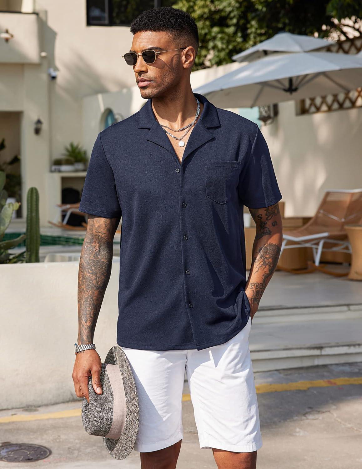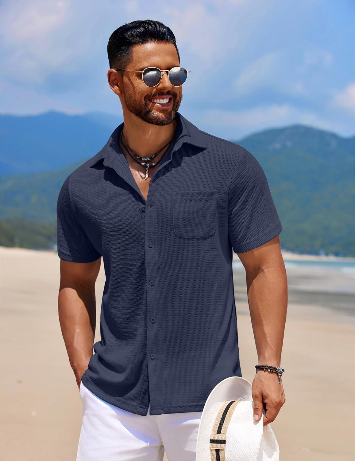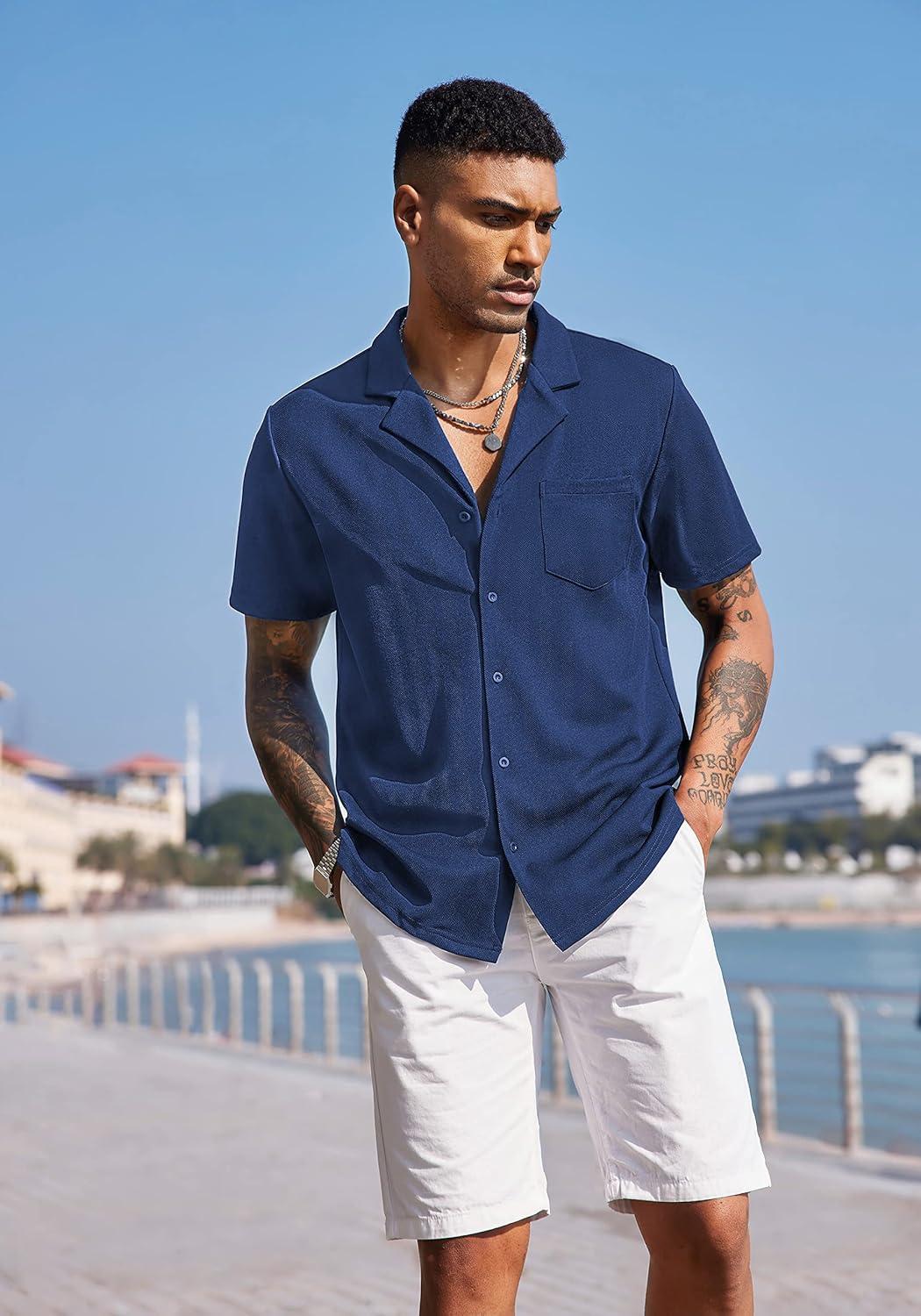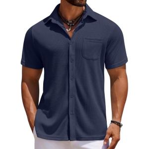 COOFANDY Mens 2025 Fashion Textured Shirts Short Sleeve Summer Beach Shirt Casual Button Down Shirts(Navy Blue)