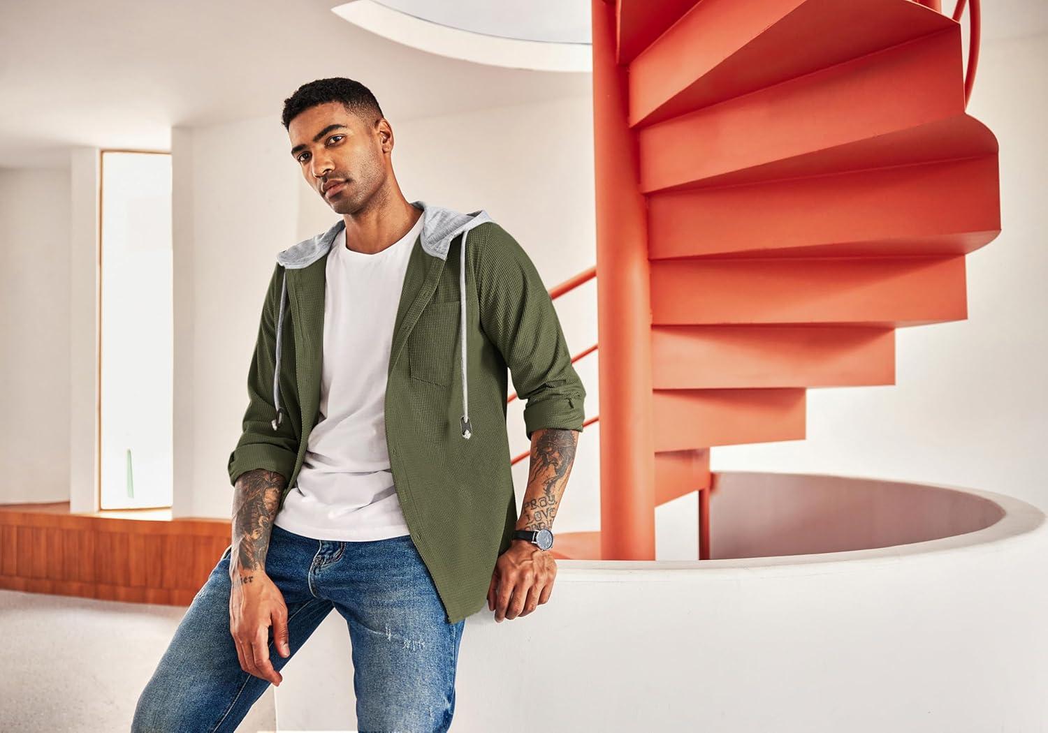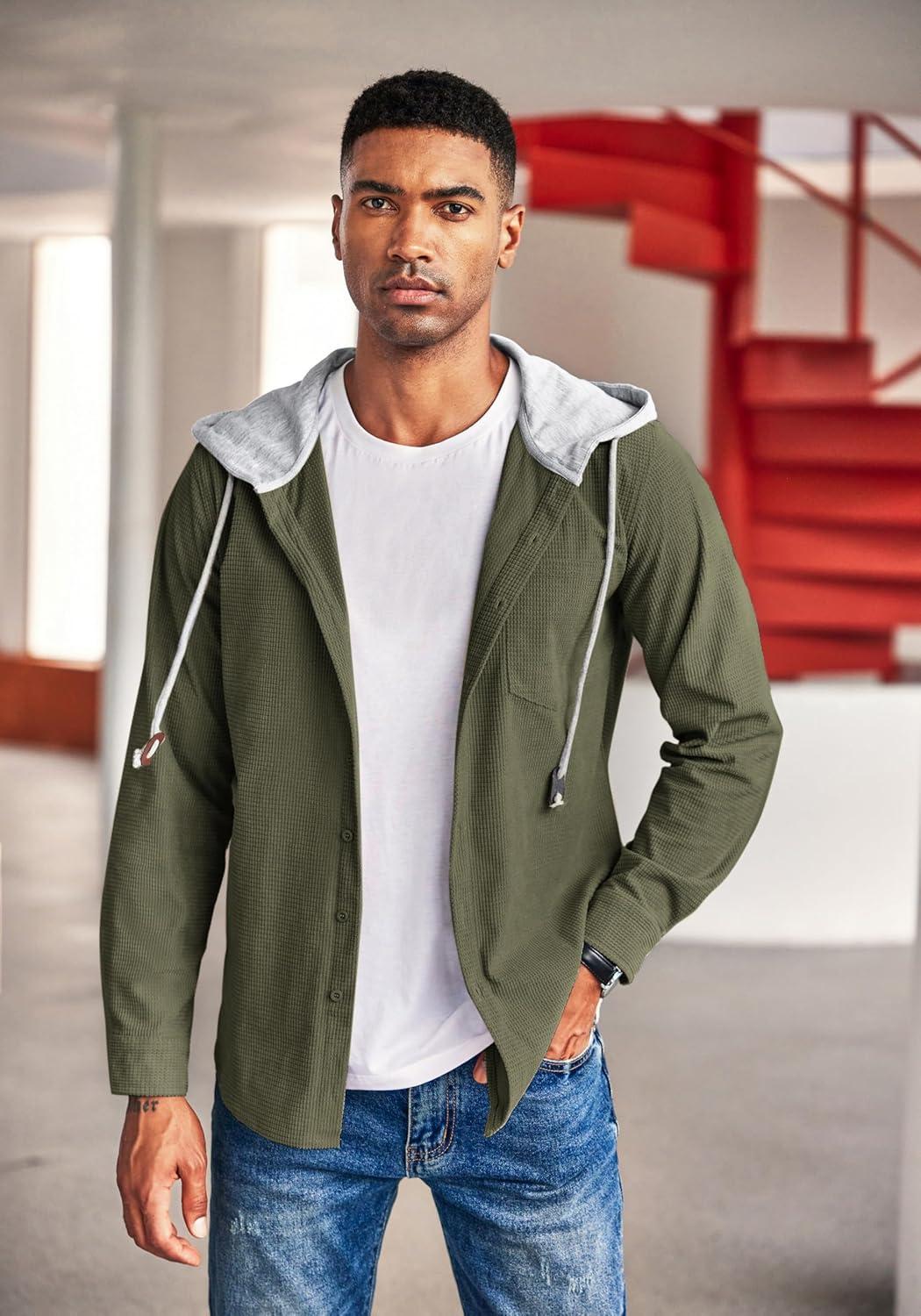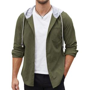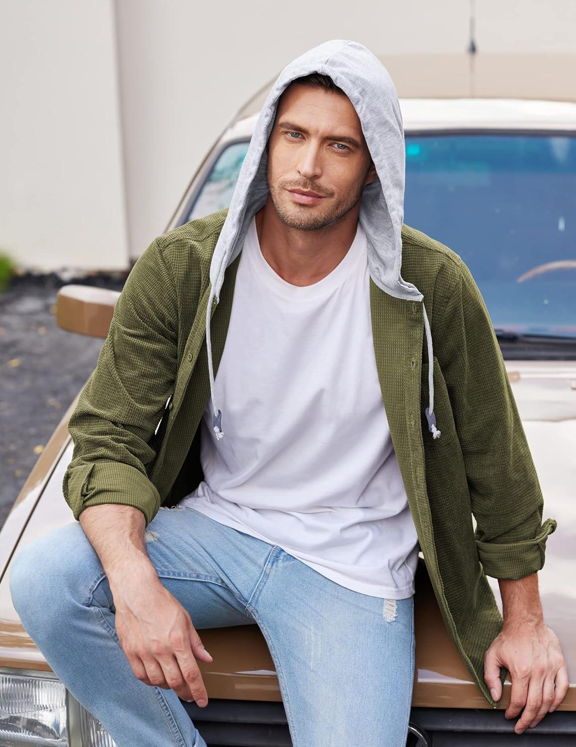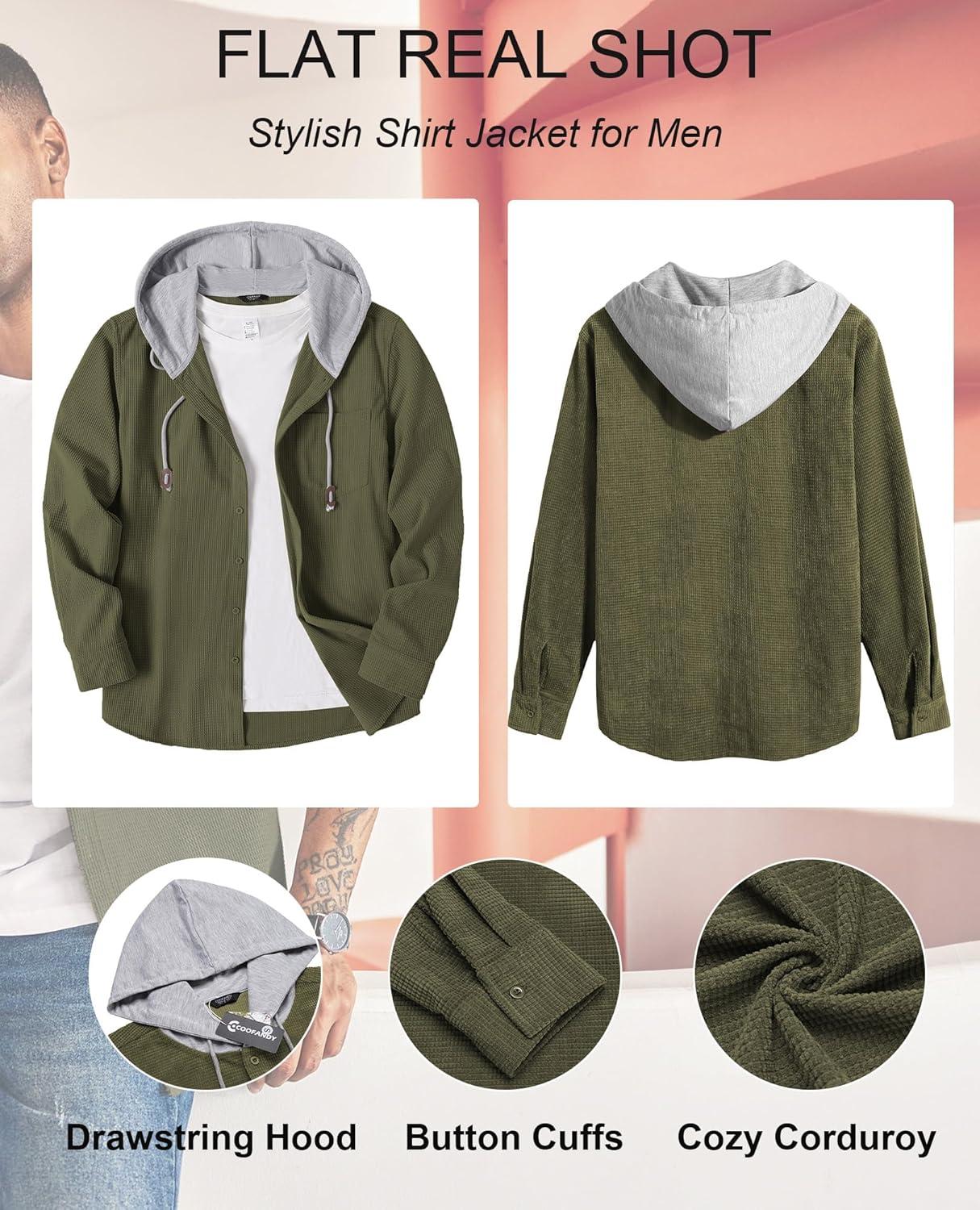 COOFANDY Men’s Corduroy Shirt Jackets Long Sleeve Button Down Casual Stylish Hooded Shacket Jacket with Pocket(Army Green)