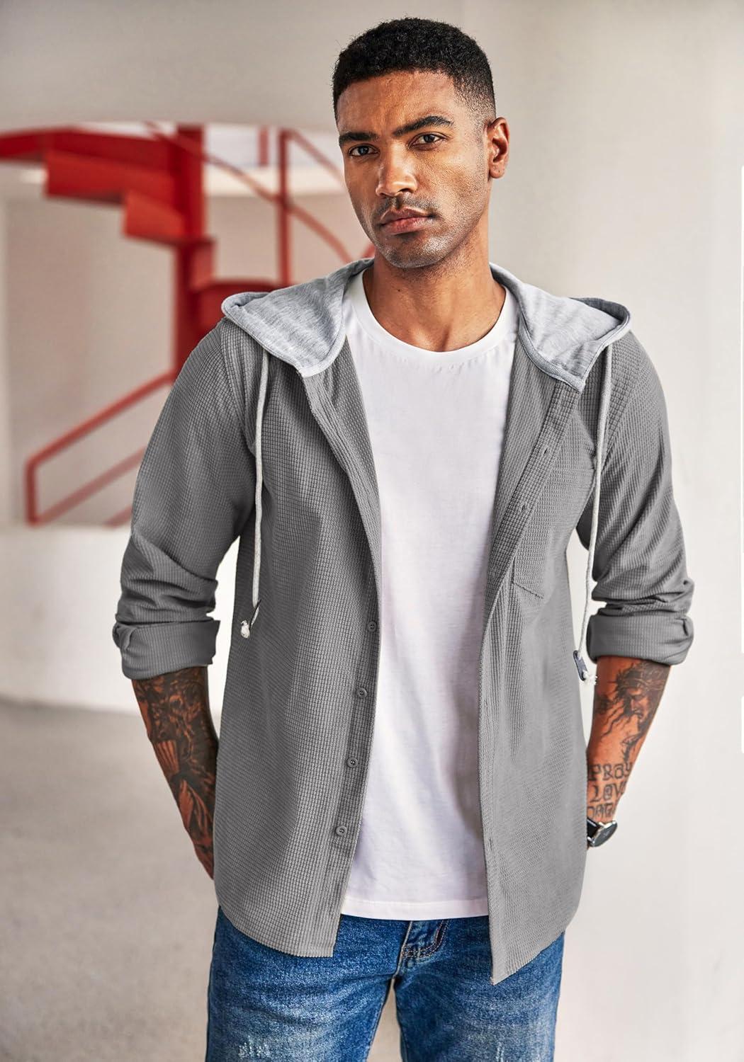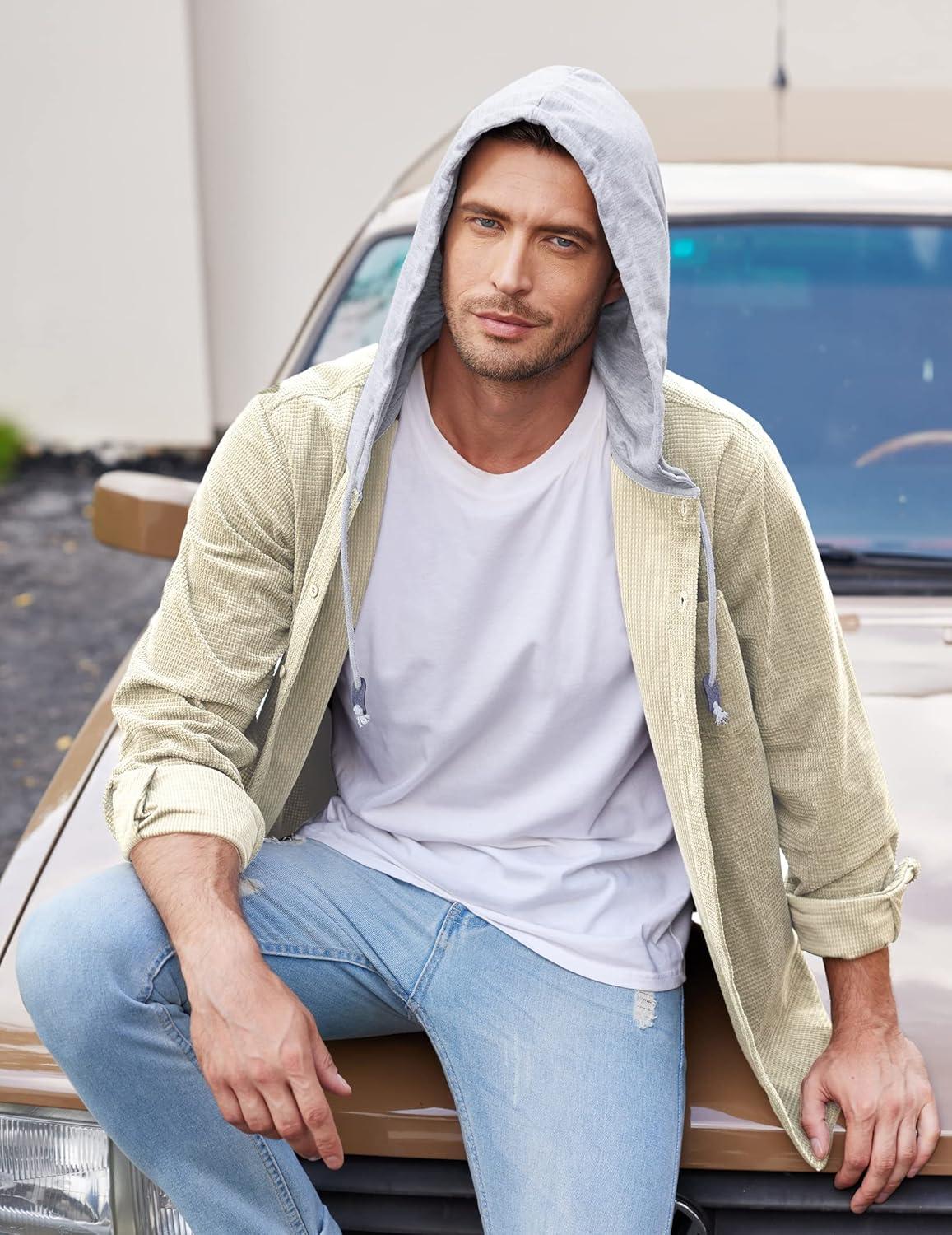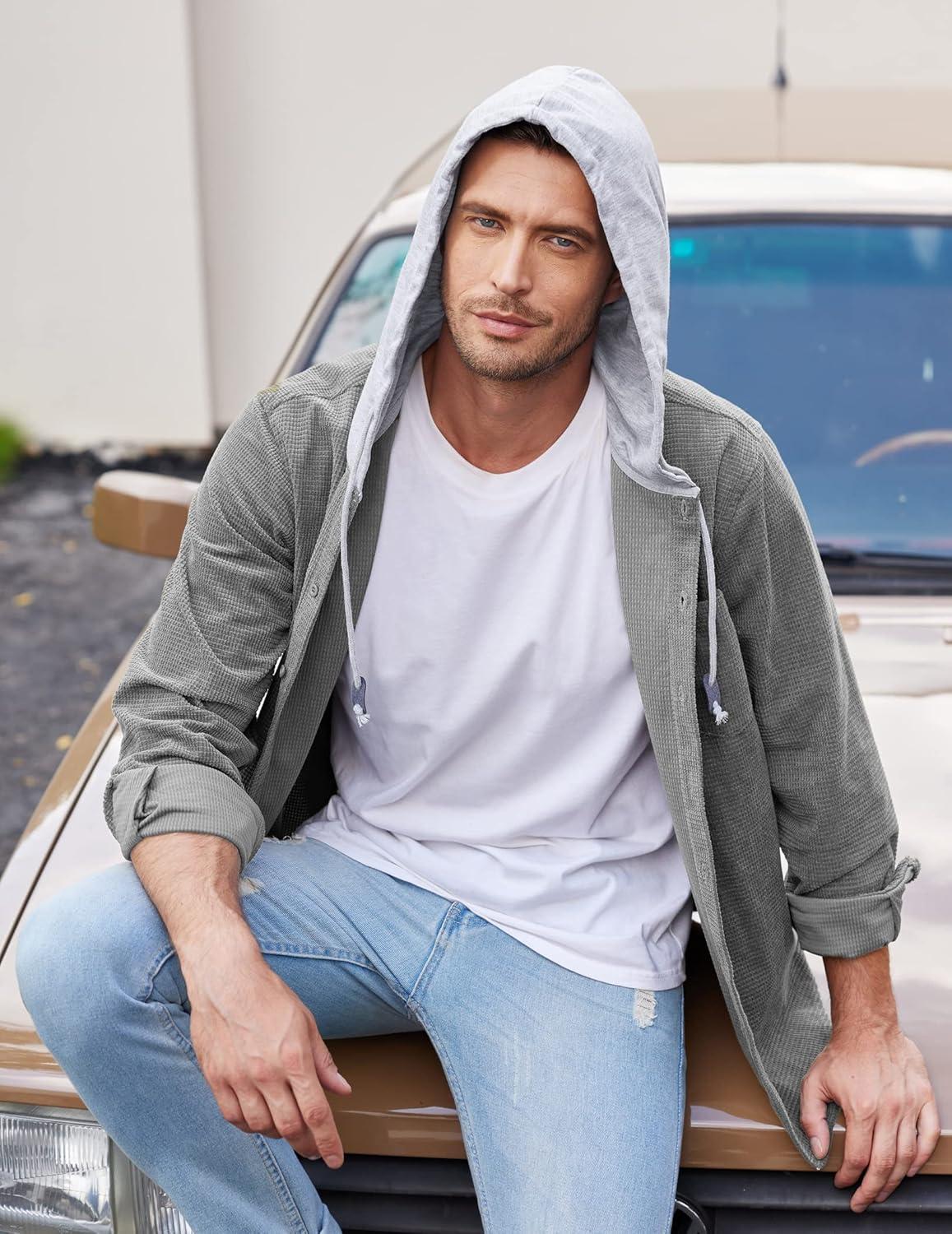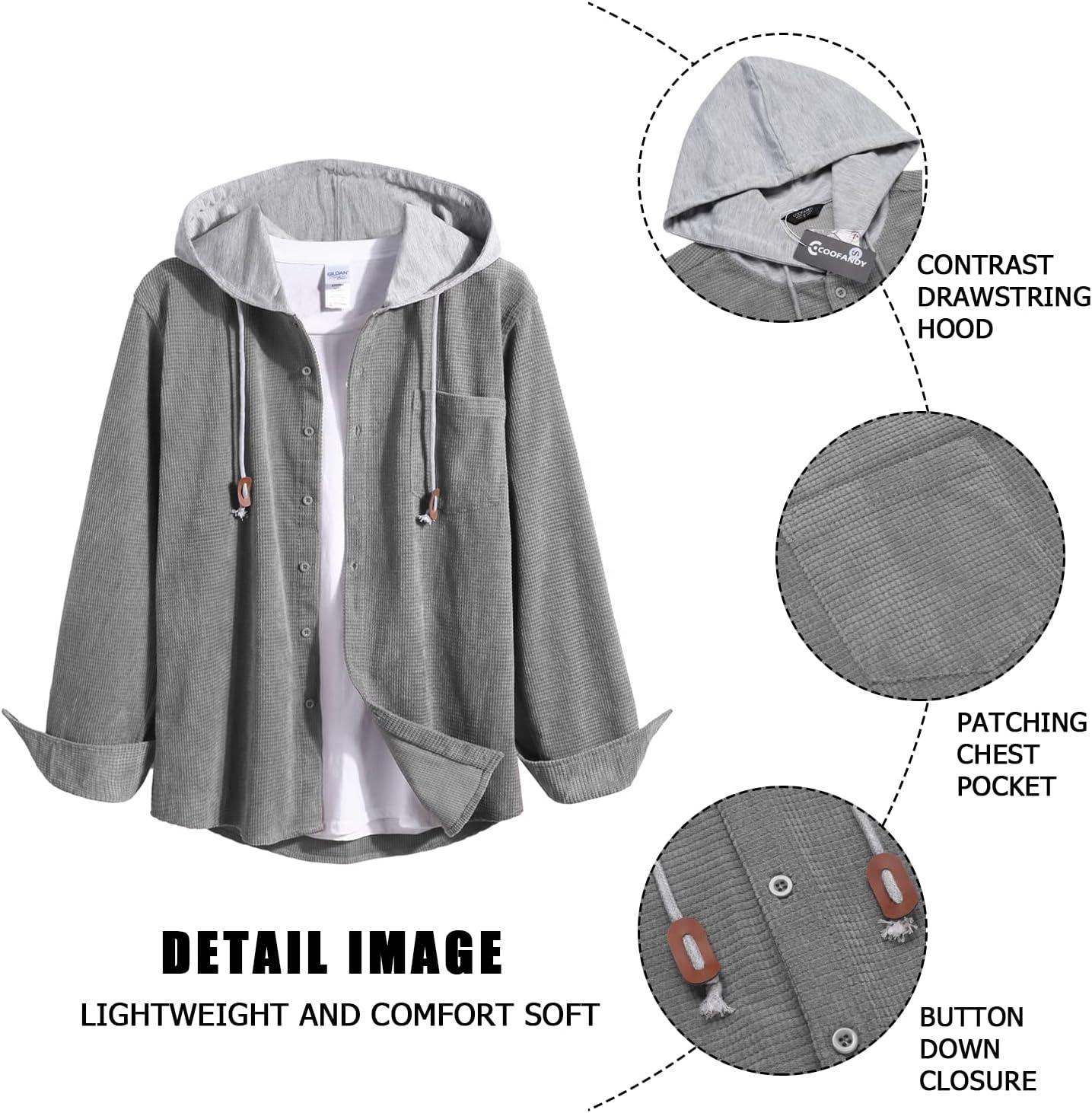 COOFANDY Men’s Corduroy Shirt Jackets Long Sleeve Button Down Casual Stylish Hooded Shacket Jacket with Pocket(Grey)