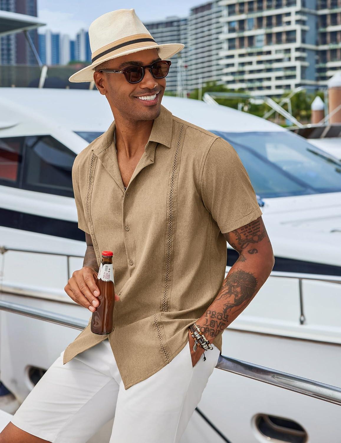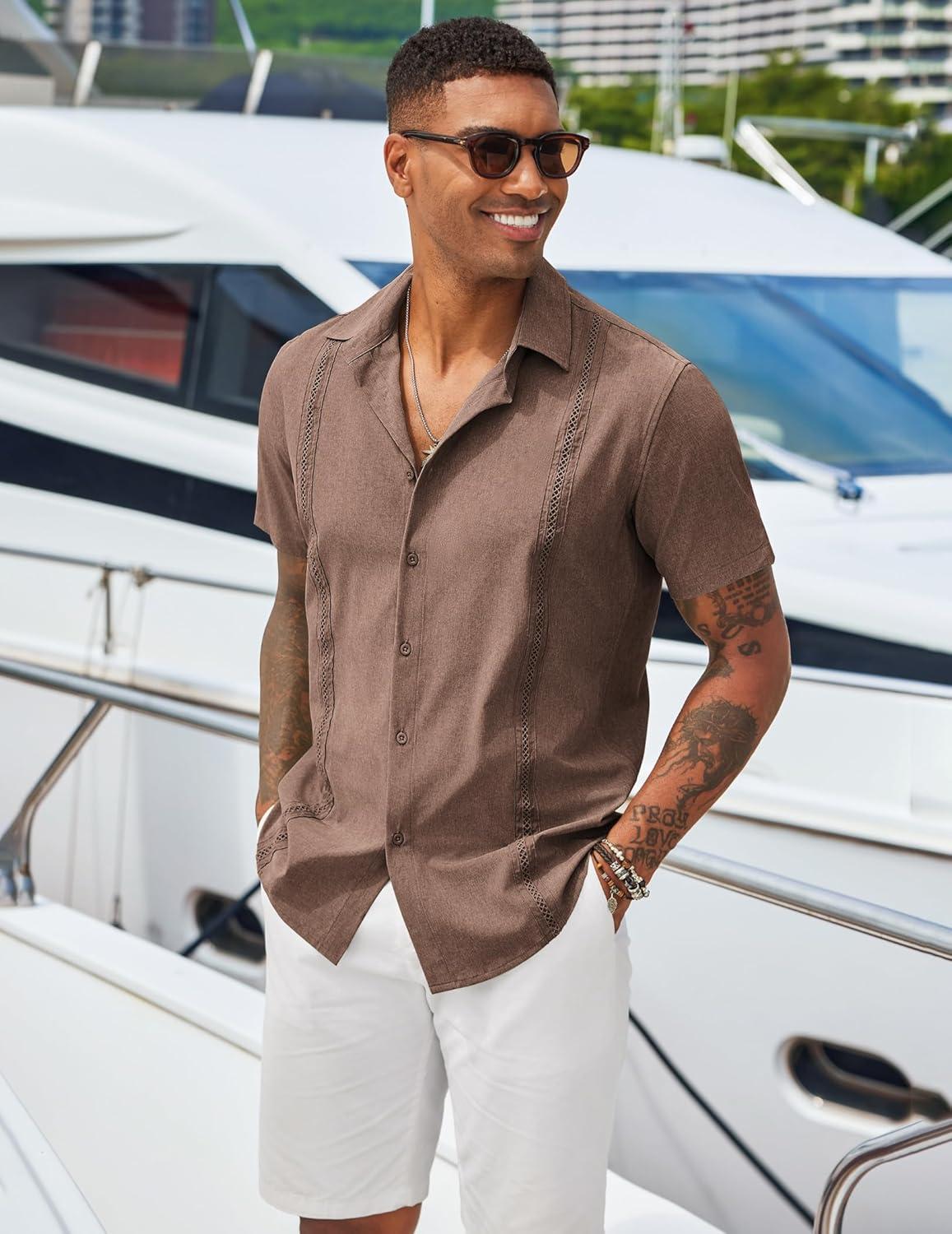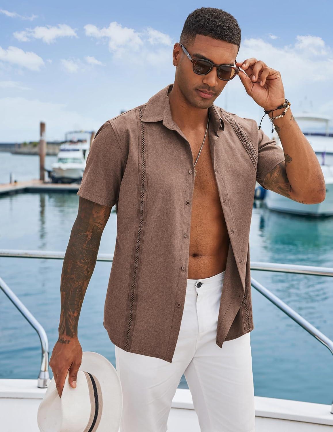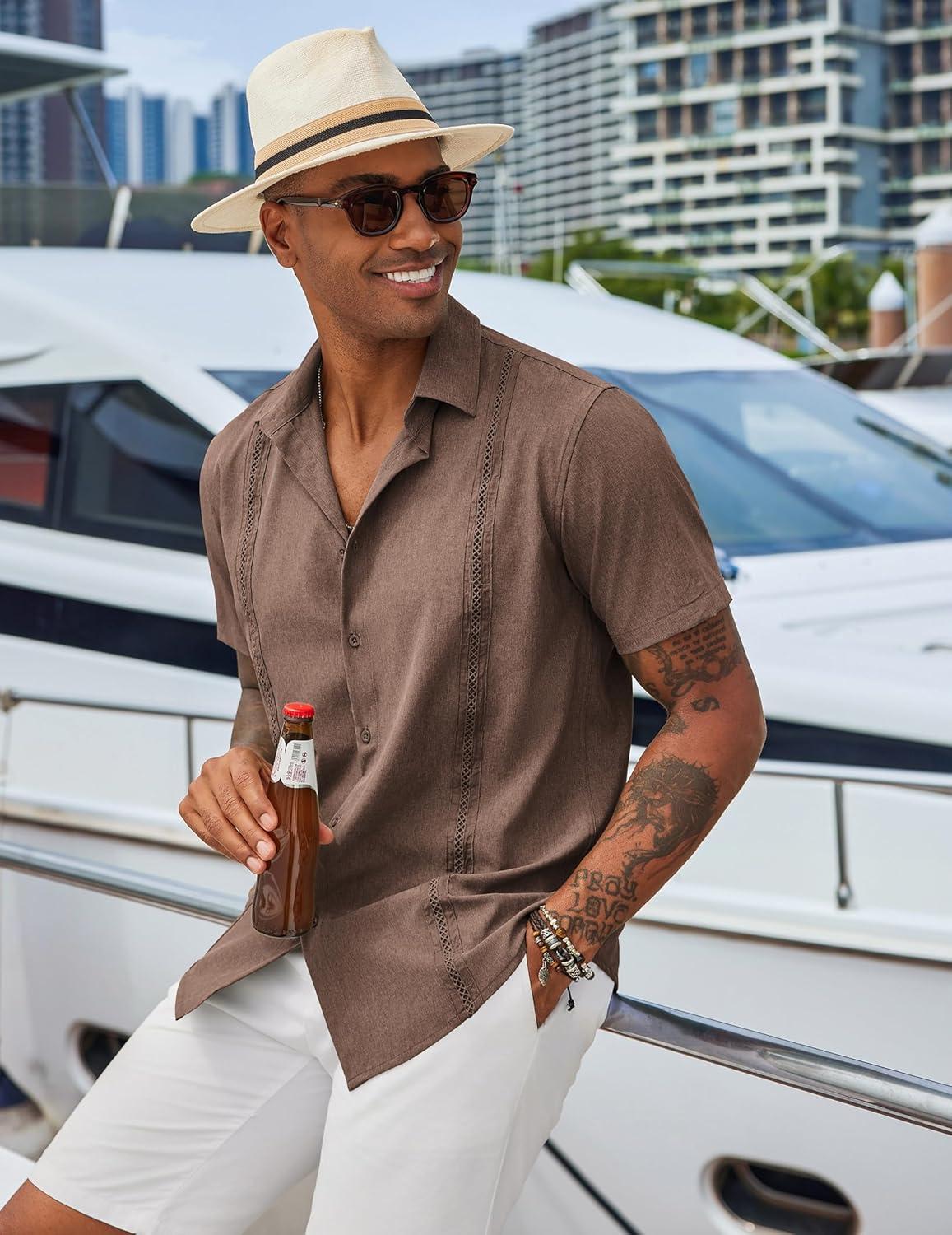 COOFANDY Men’s Cuban Guayabera Shirts Casual Short Sleeve Button Down Shirt Summer Beach Vacation Shirt(Brown)