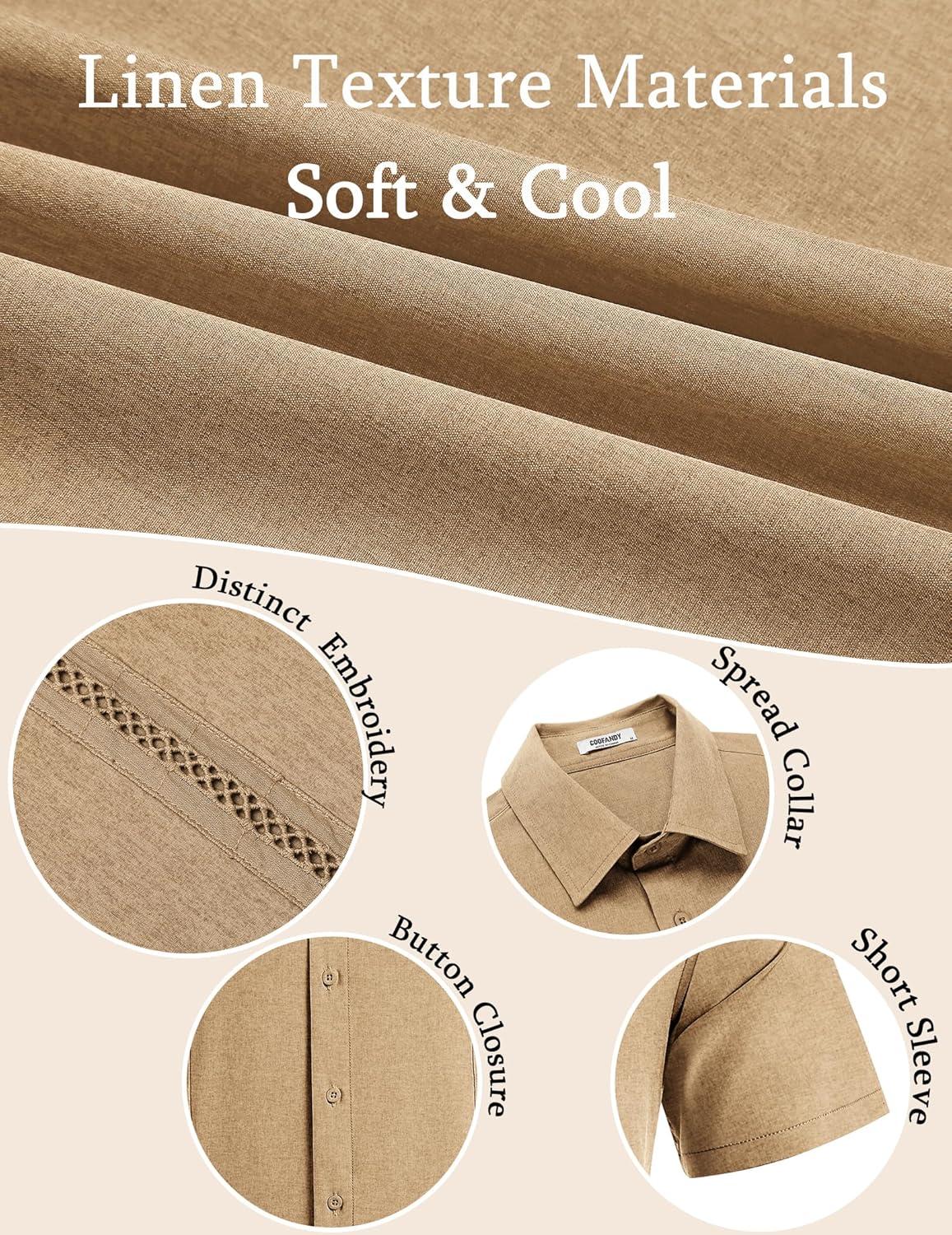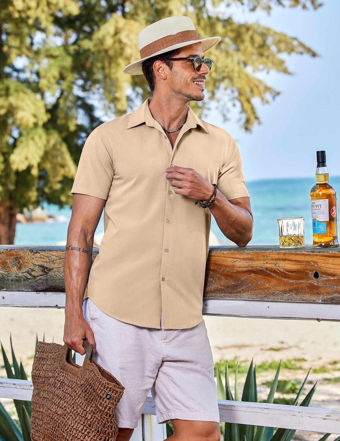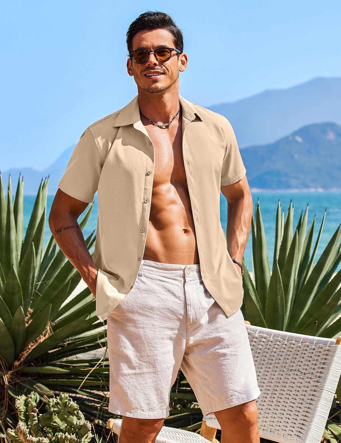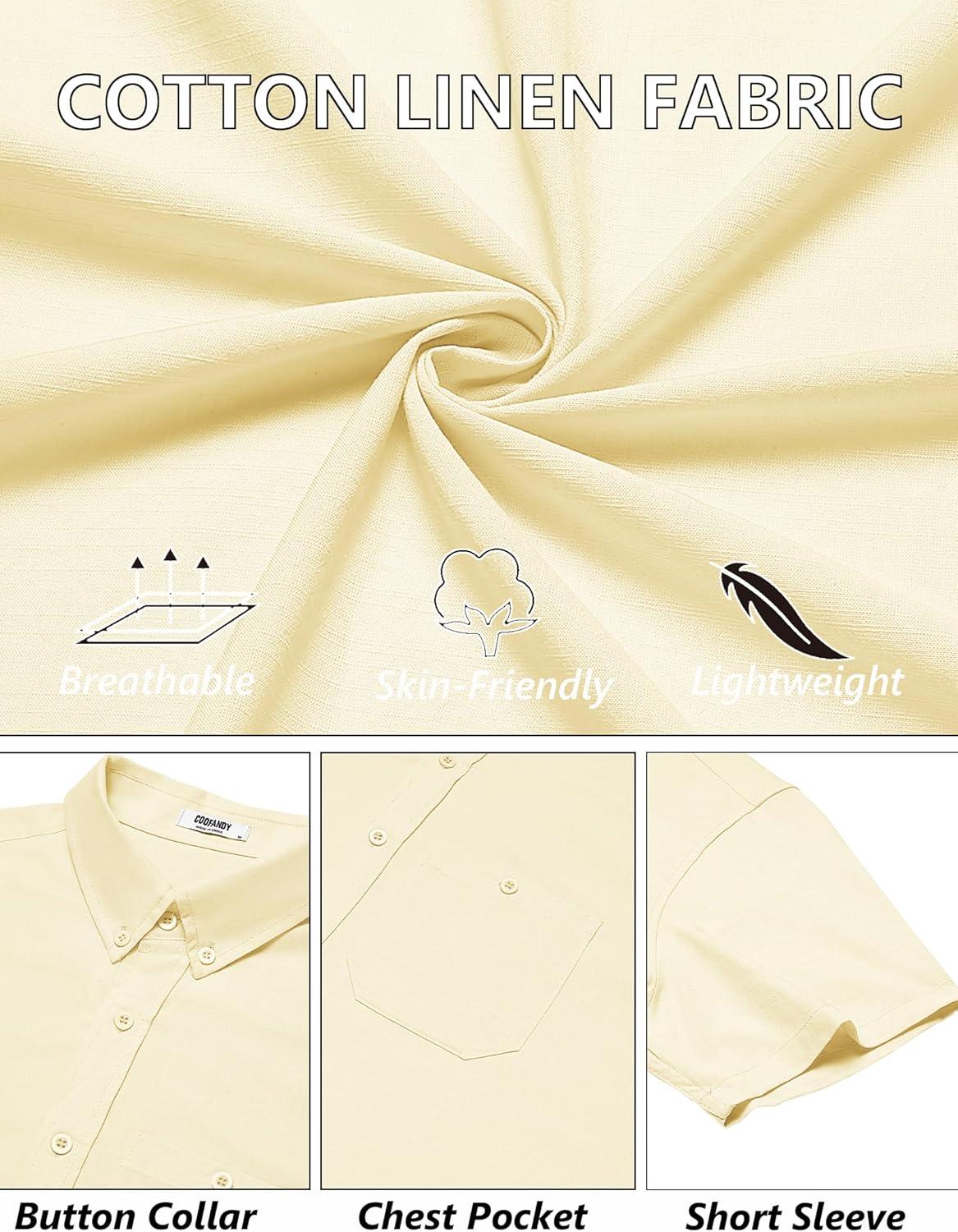 COOFANDY Men’s Cotton Linen Shirts Short Sleeve Casual Shirts Summer Button Down Shirt Linen Beach Vacation Shirt(Beige)