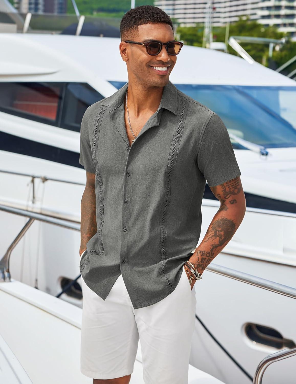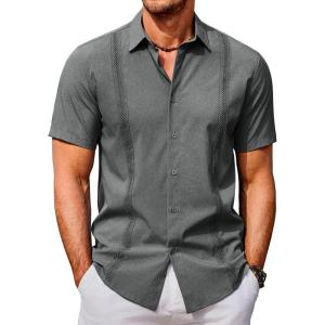 COOFANDY Men’s Cuban Guayabera Shirts Casual Short Sleeve Button Down Shirt Summer Beach Vacation Shirt(Dark Grey)