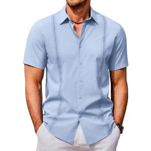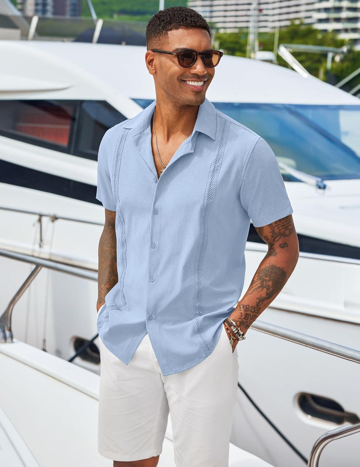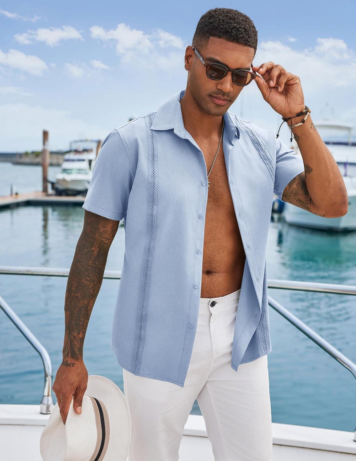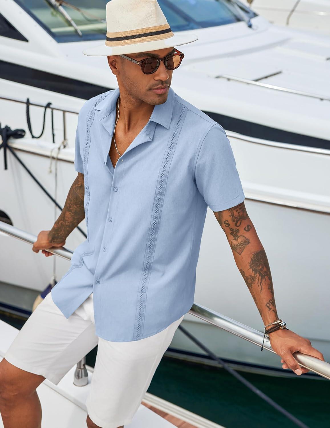 COOFANDY Men’s Cuban Guayabera Shirts Casual Short Sleeve Button Down Shirt Summer Beach Vacation Shirt(Light Blue)