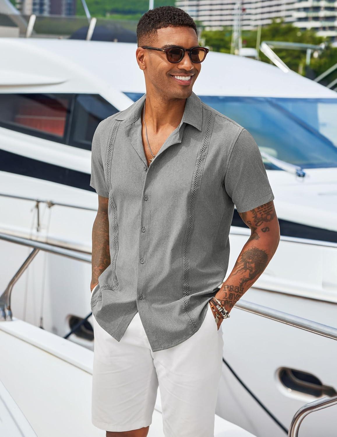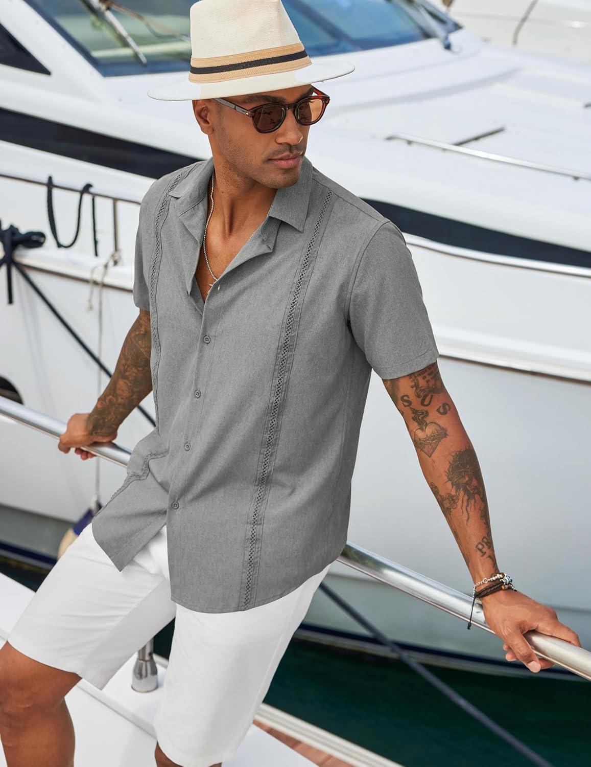 COOFANDY Men’s Cuban Guayabera Shirts Casual Short Sleeve Button Down Shirt Summer Beach Vacation Shirt(Light Grey)