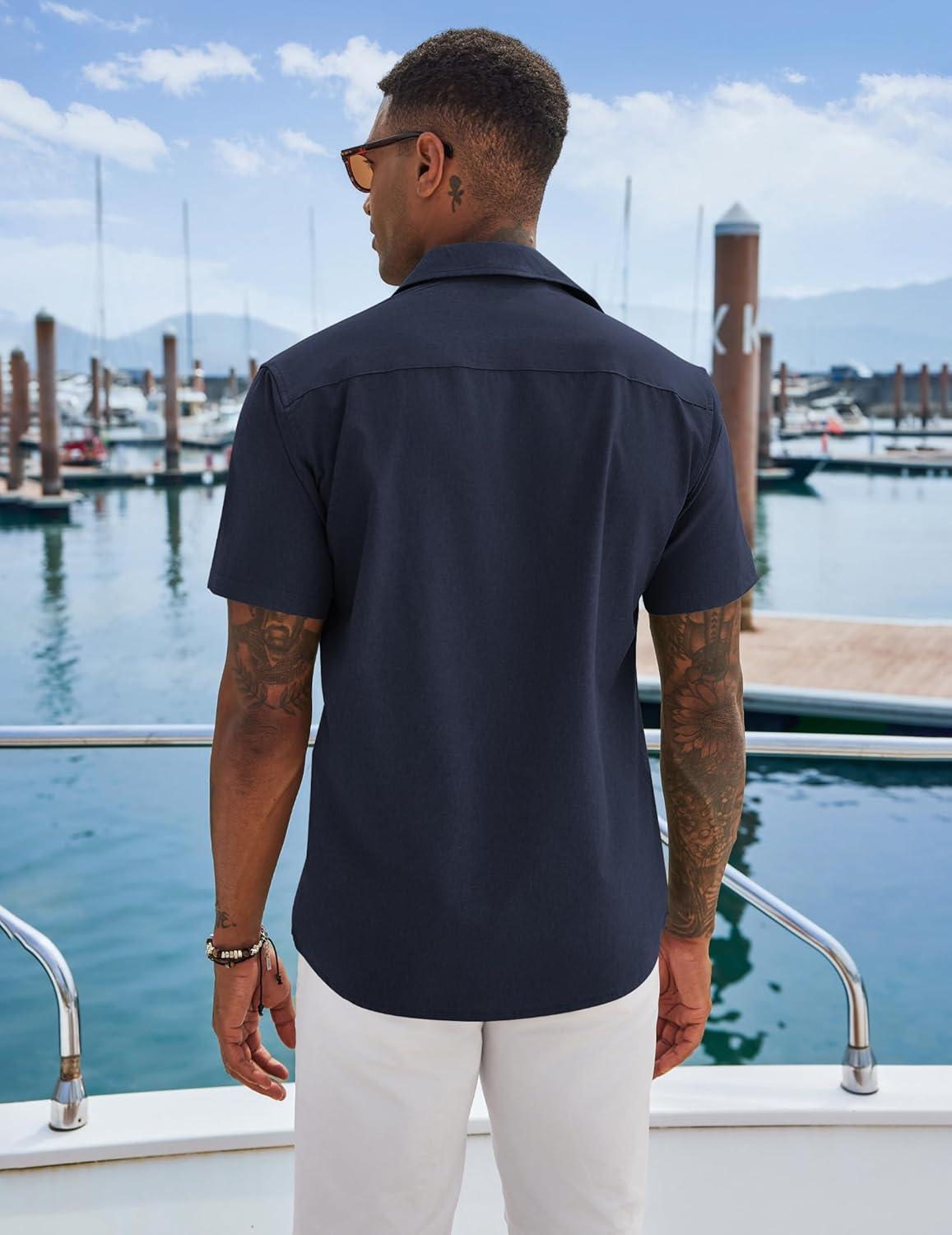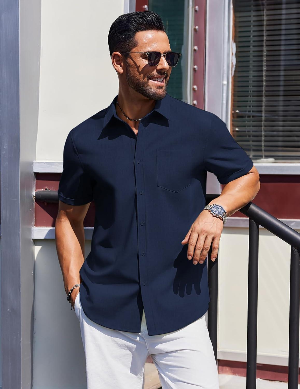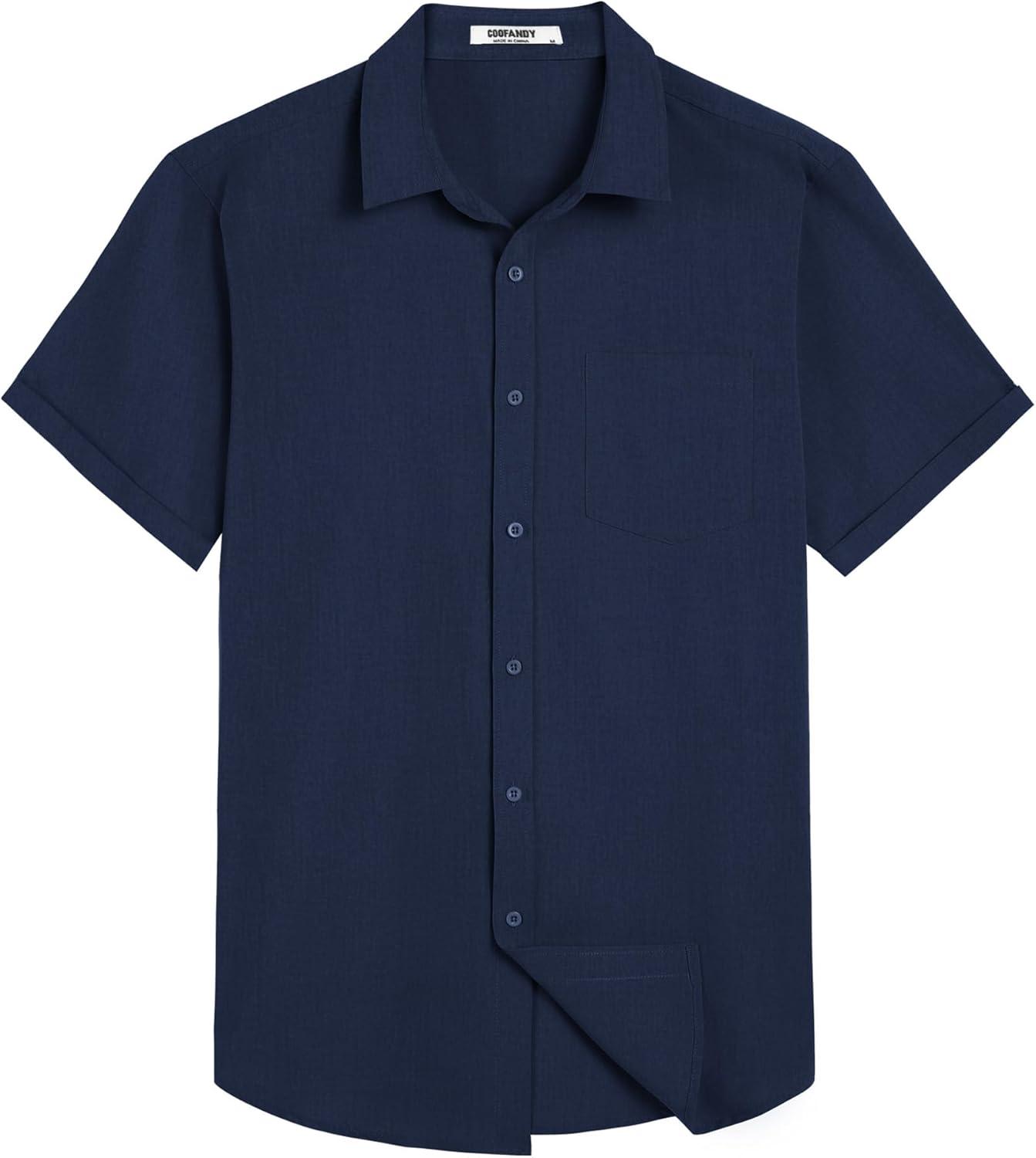 COOFANDY Men’s Linen Shirts Short Sleeve Casual Shirts Summer Beach Button Down Shirts with Pocket(Navy Blue)