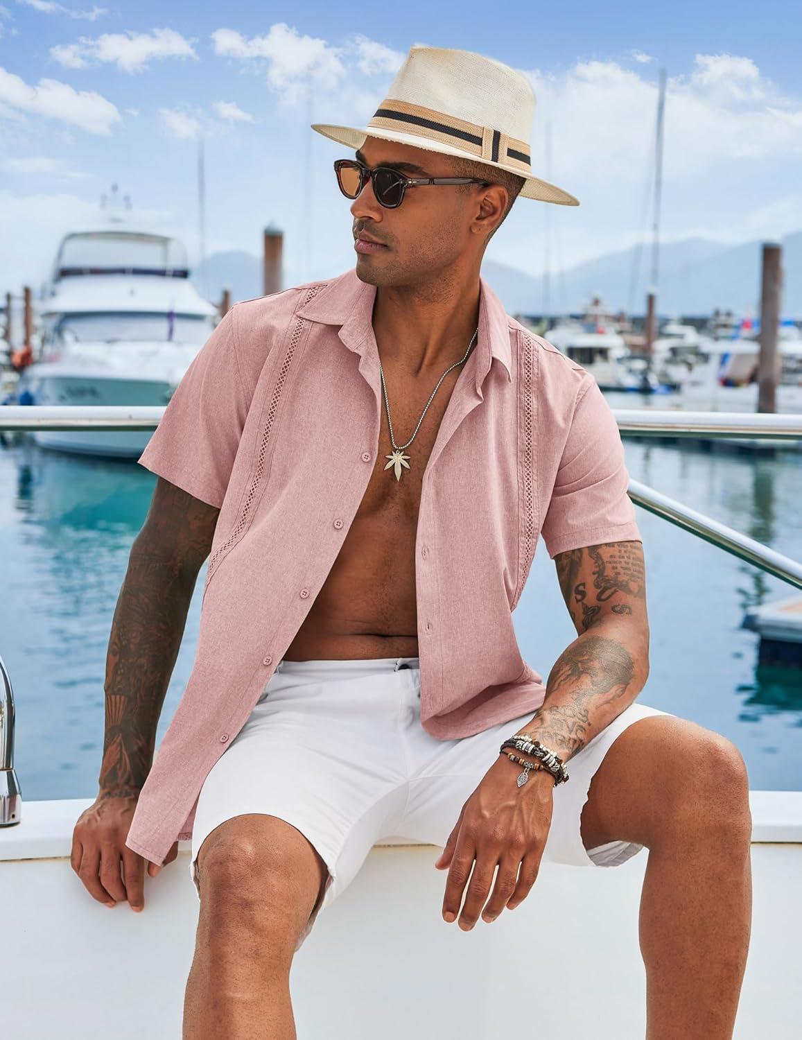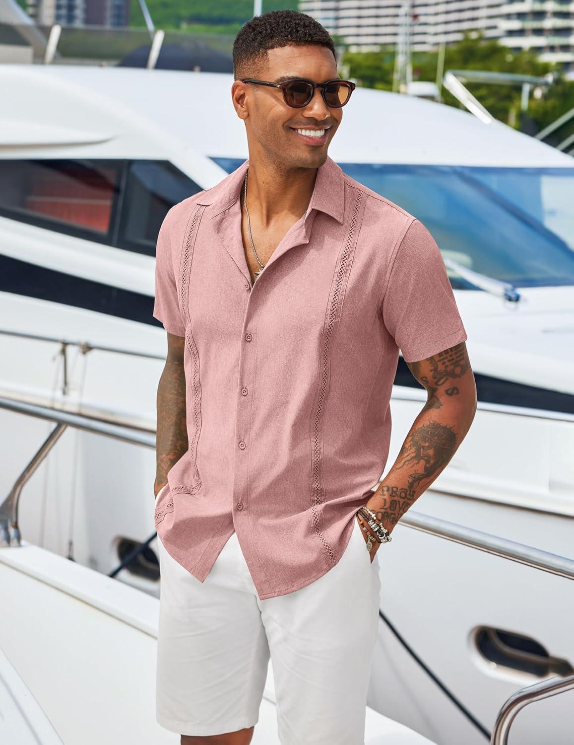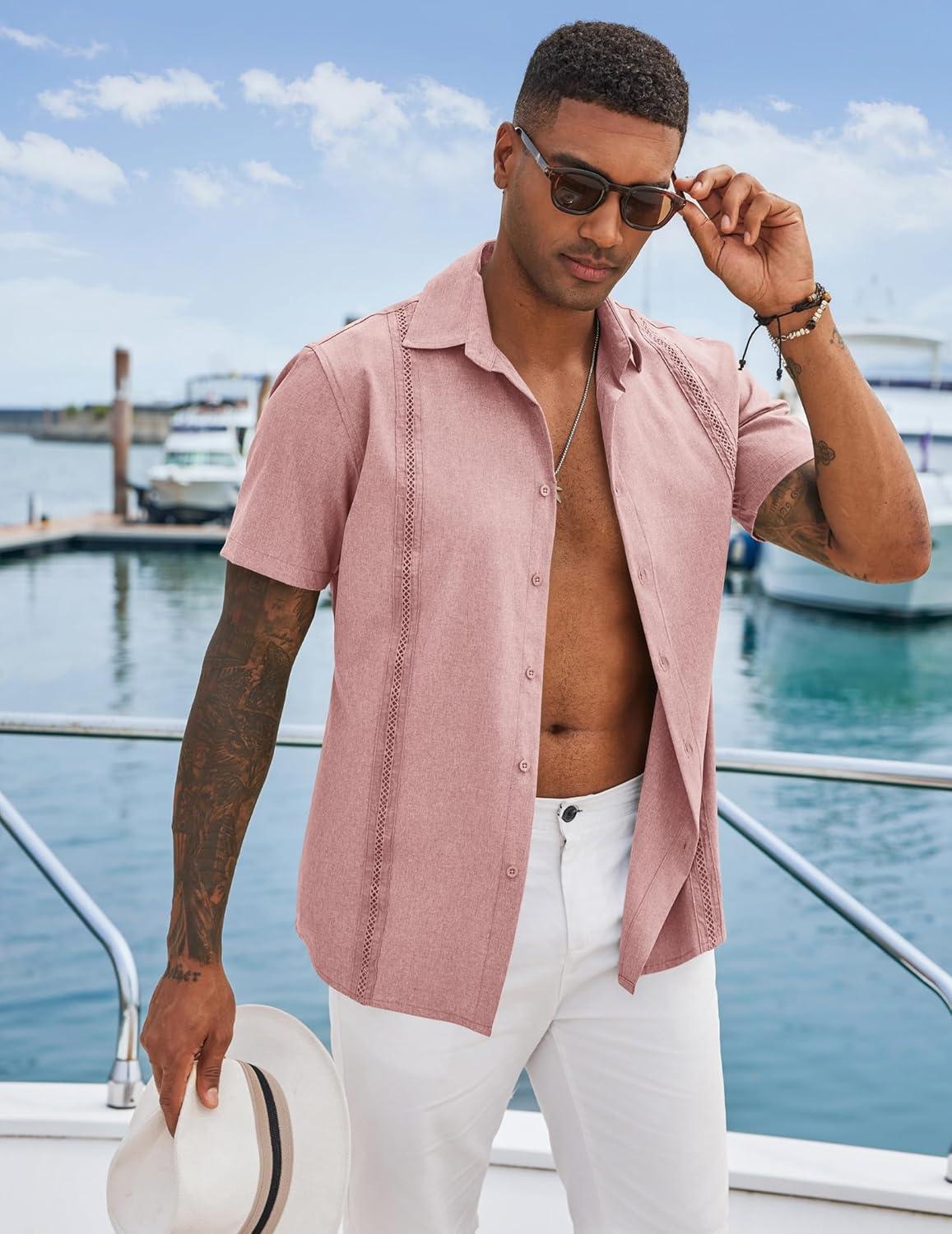 COOFANDY Men’s Cuban Guayabera Shirts Casual Short Sleeve Button Down Shirt Summer Beach Vacation Shirt(Pink)