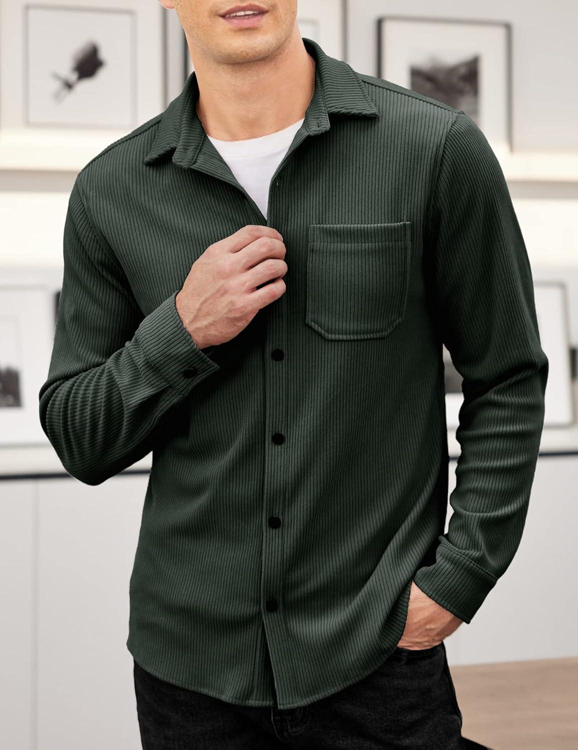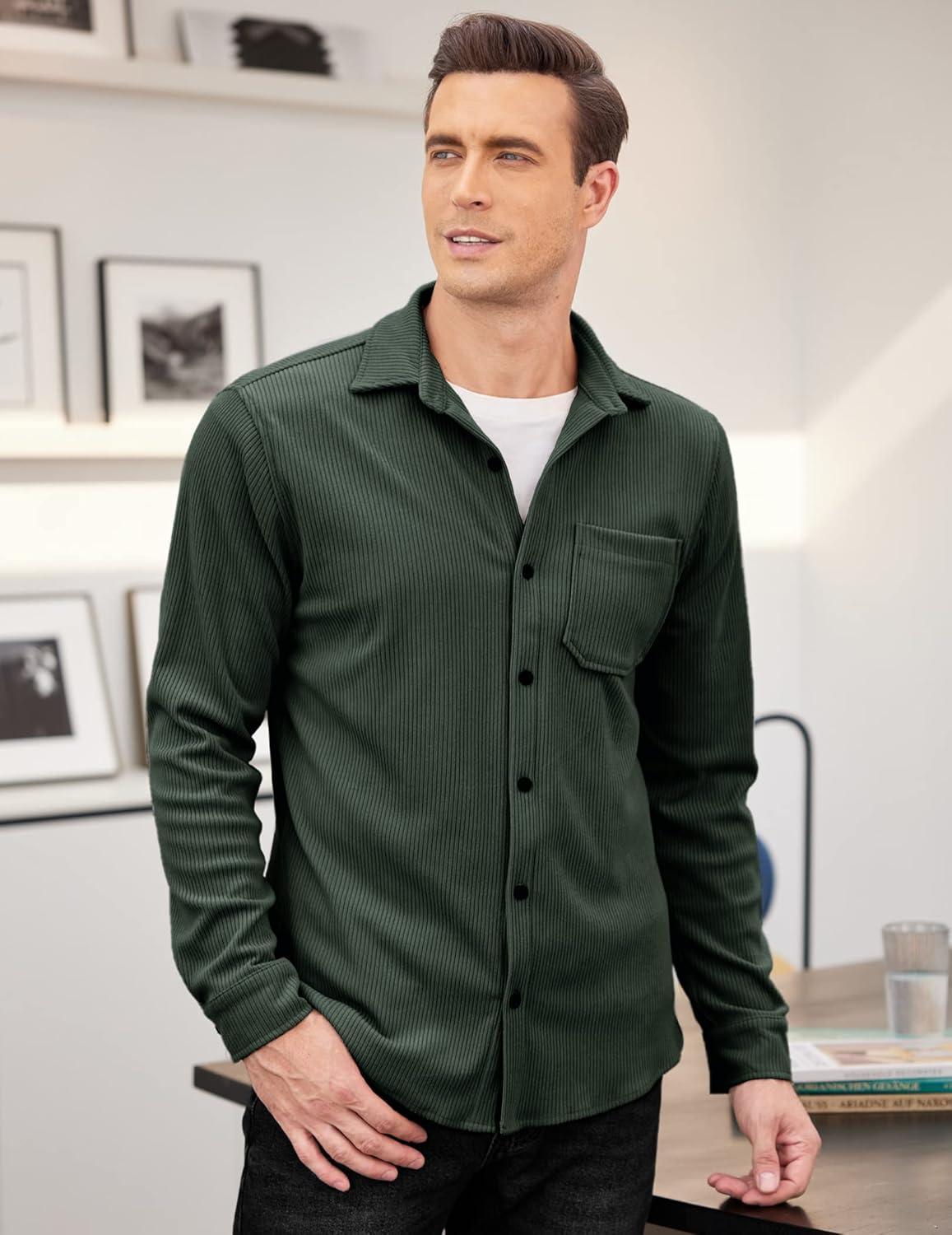 COOFANDY Men’s Corduroy Shirt Casual Shacket Long Sleeve Button Down Lightweight Jacket(Dark Green)