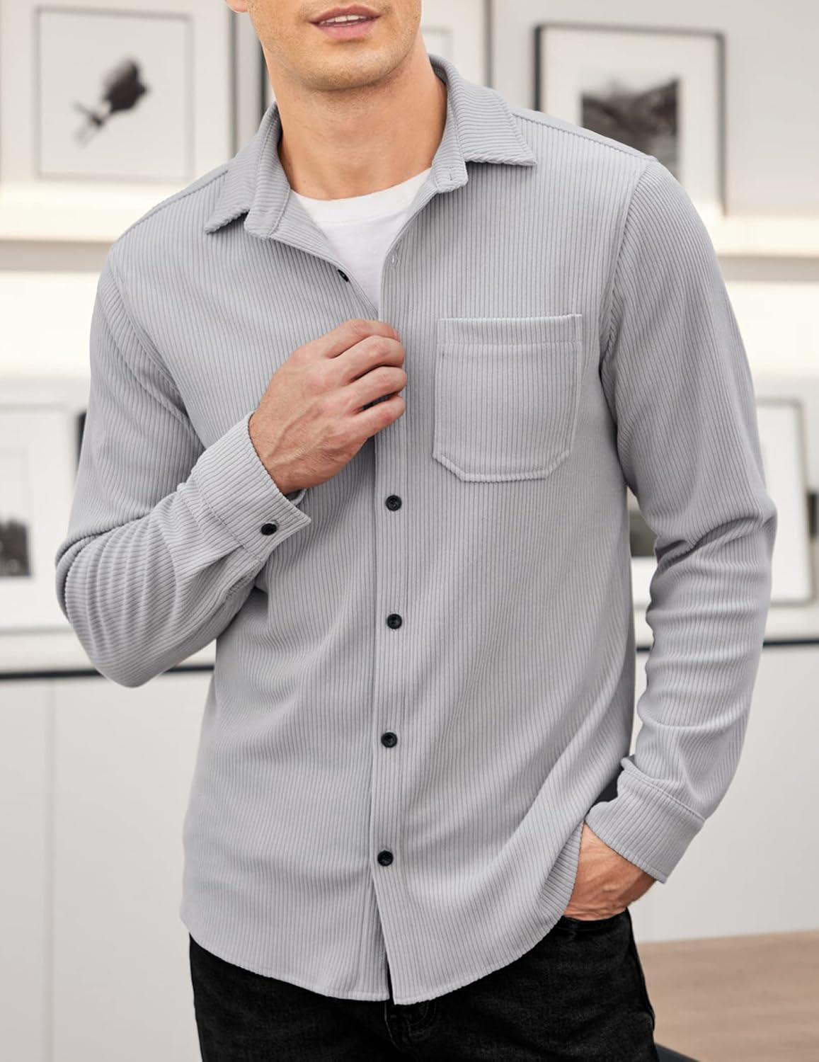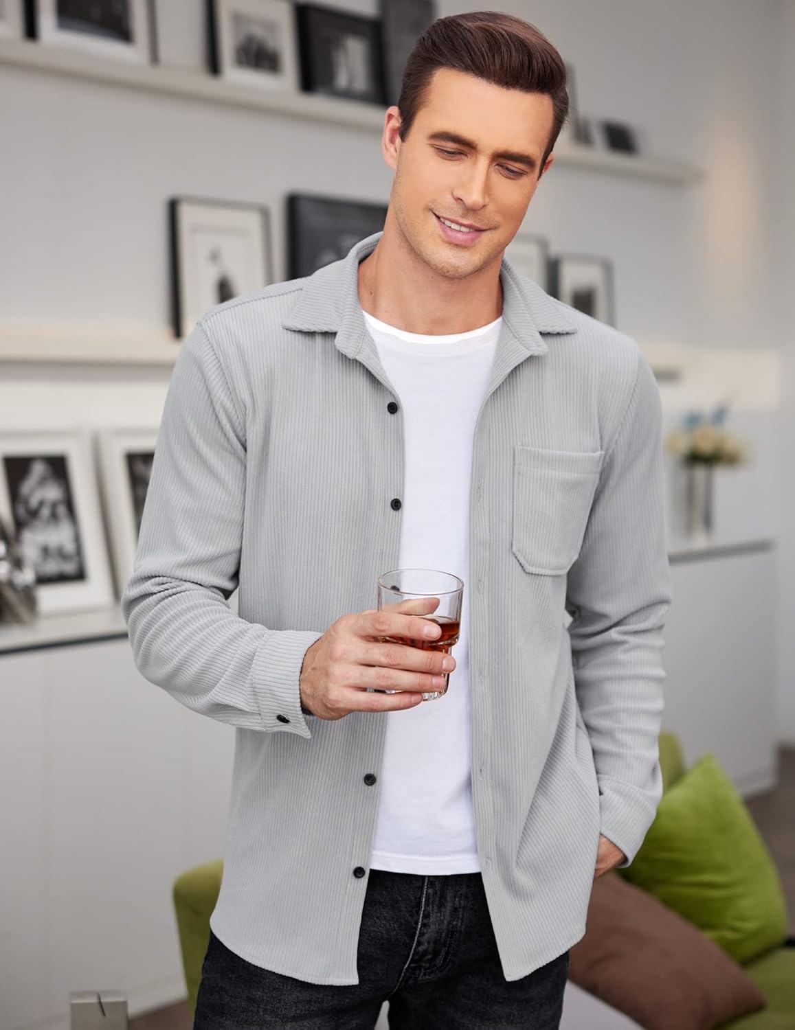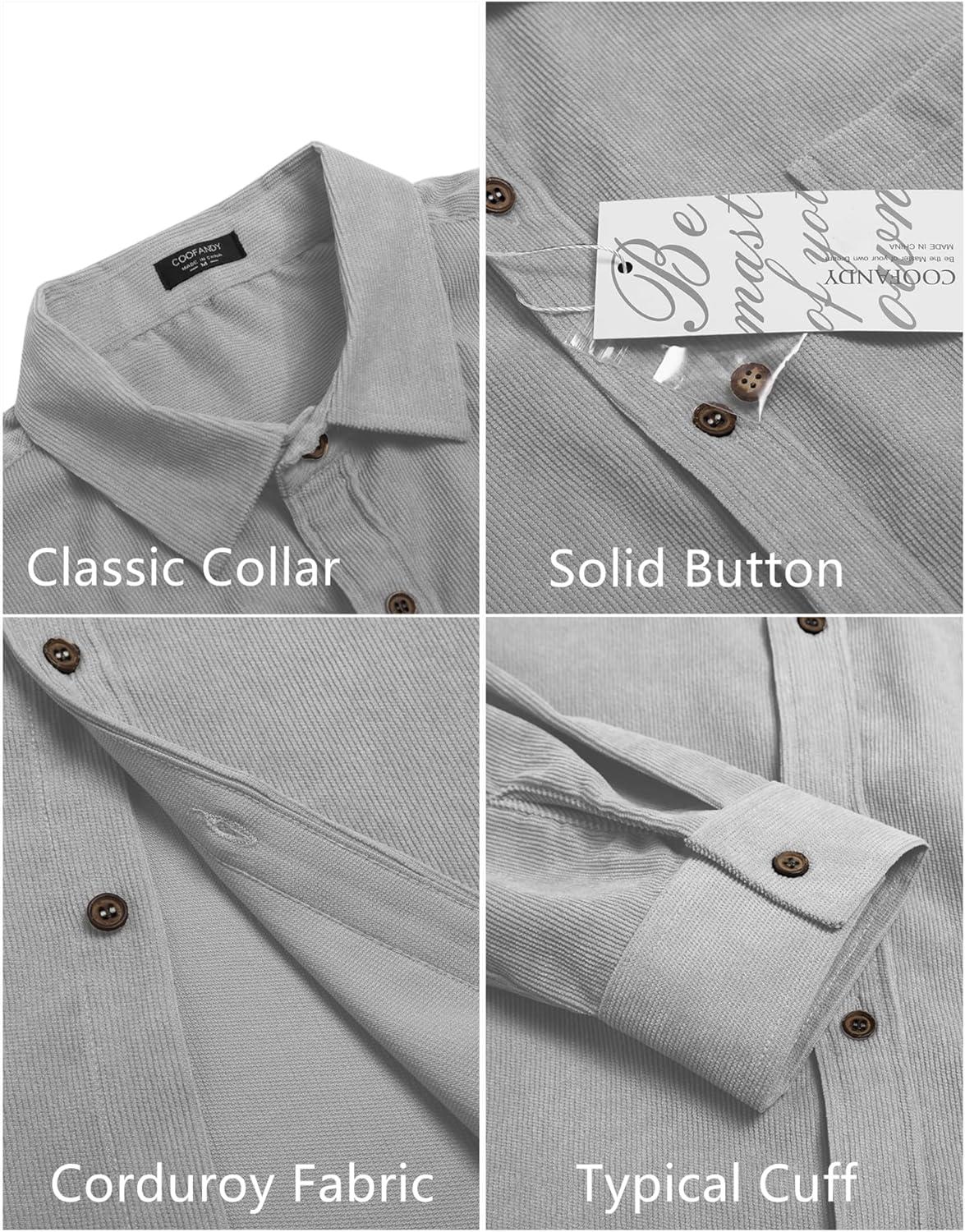 COOFANDY Men’s Corduroy Shirt Casual Shacket Long Sleeve Button Down Lightweight Jacket(Grey)