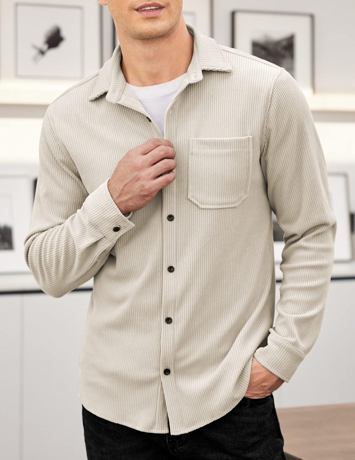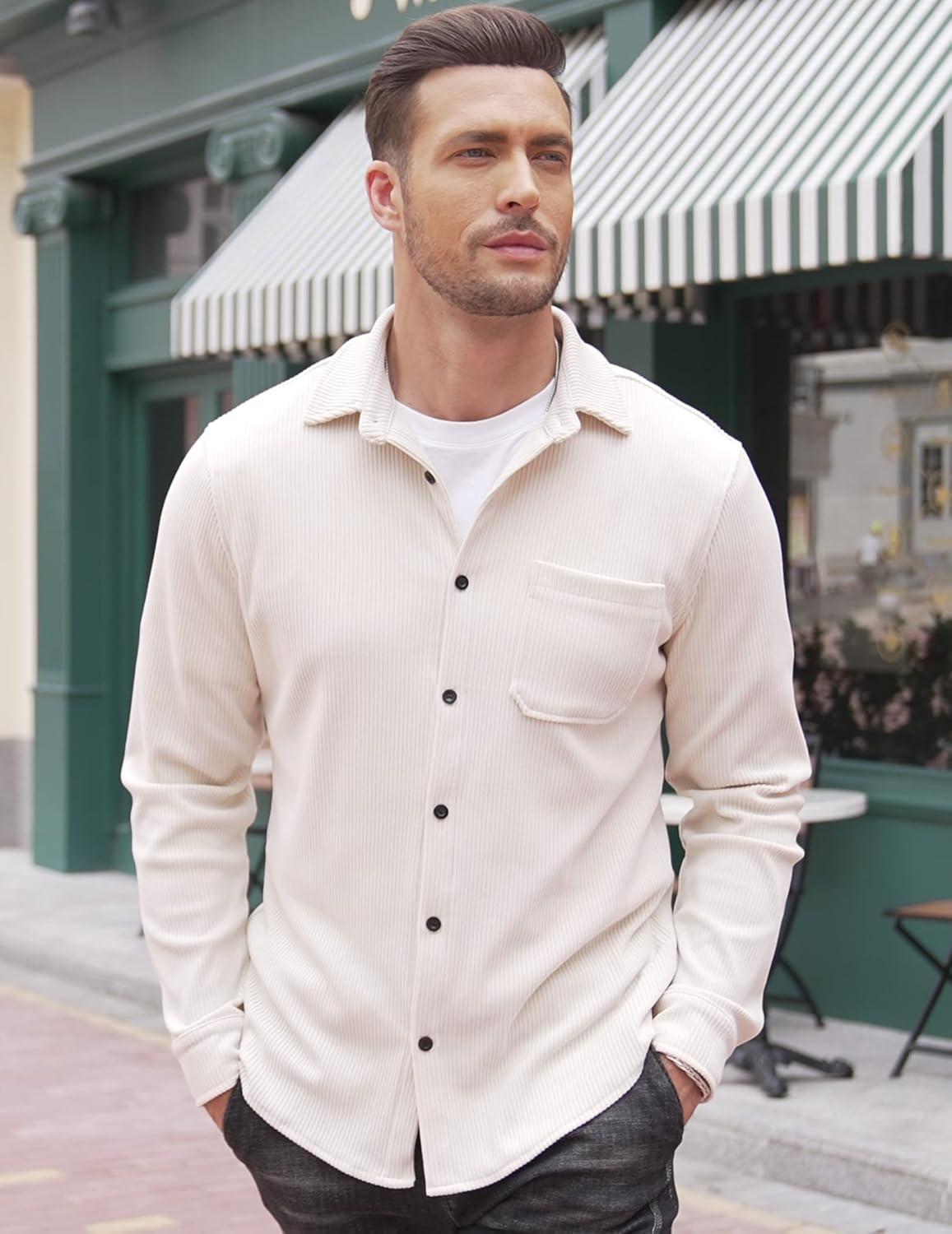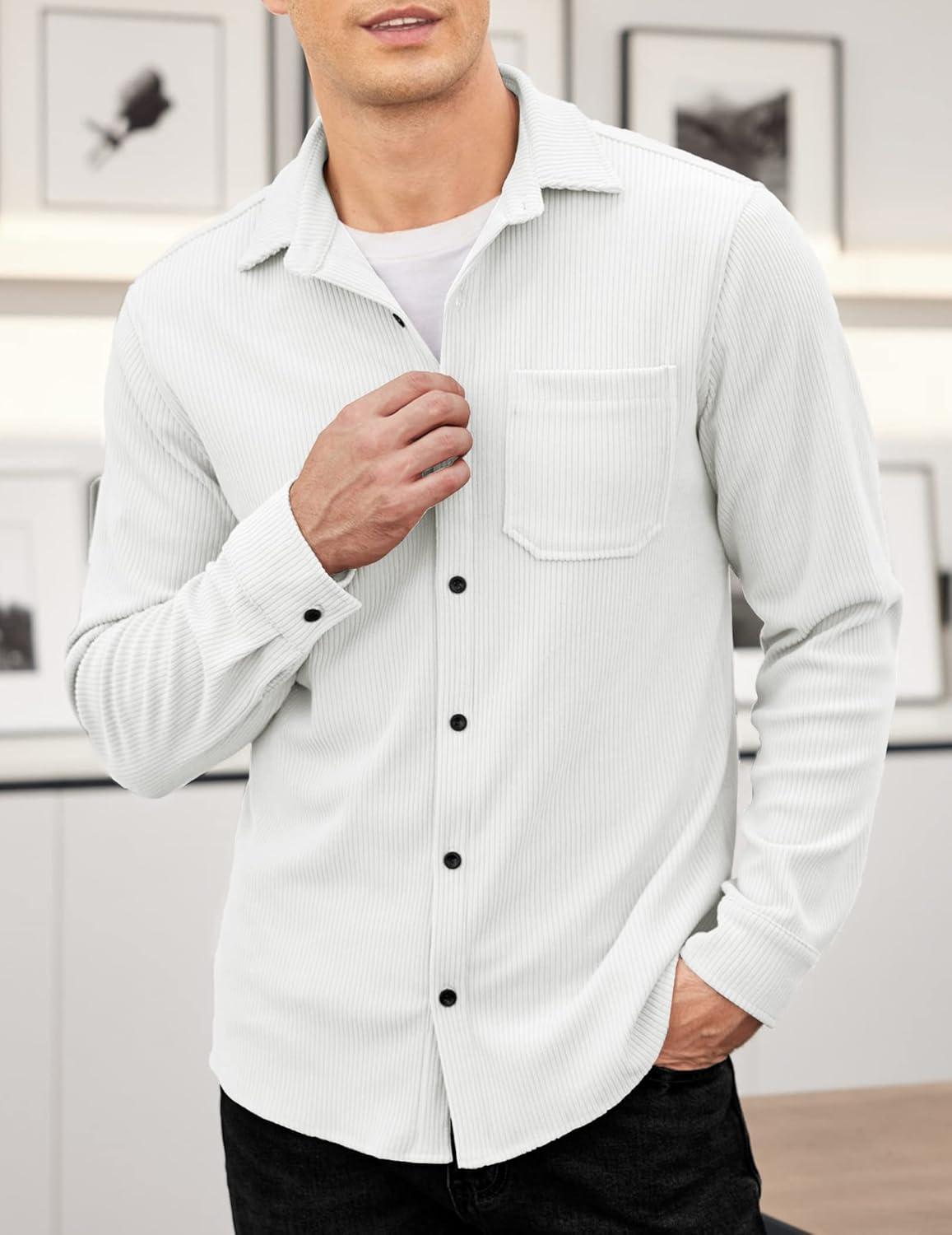 COOFANDY Men’s Corduroy Shirt Casual Shacket Long Sleeve Button Down Lightweight Jacket(White)