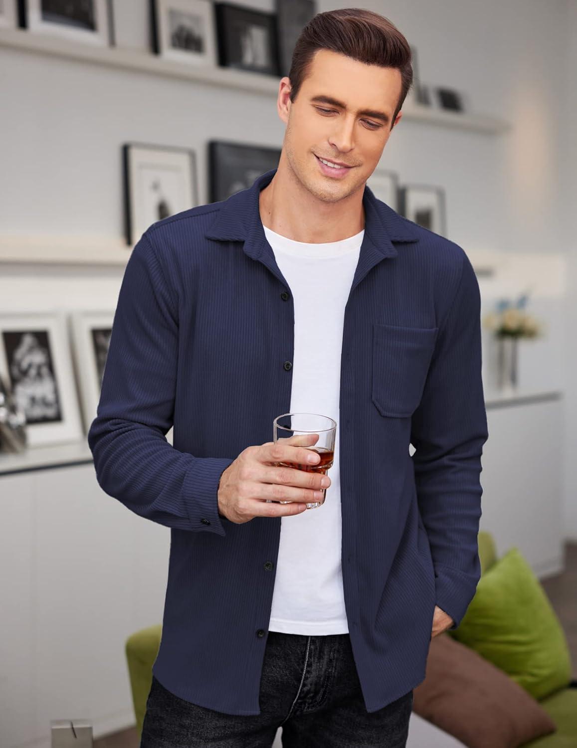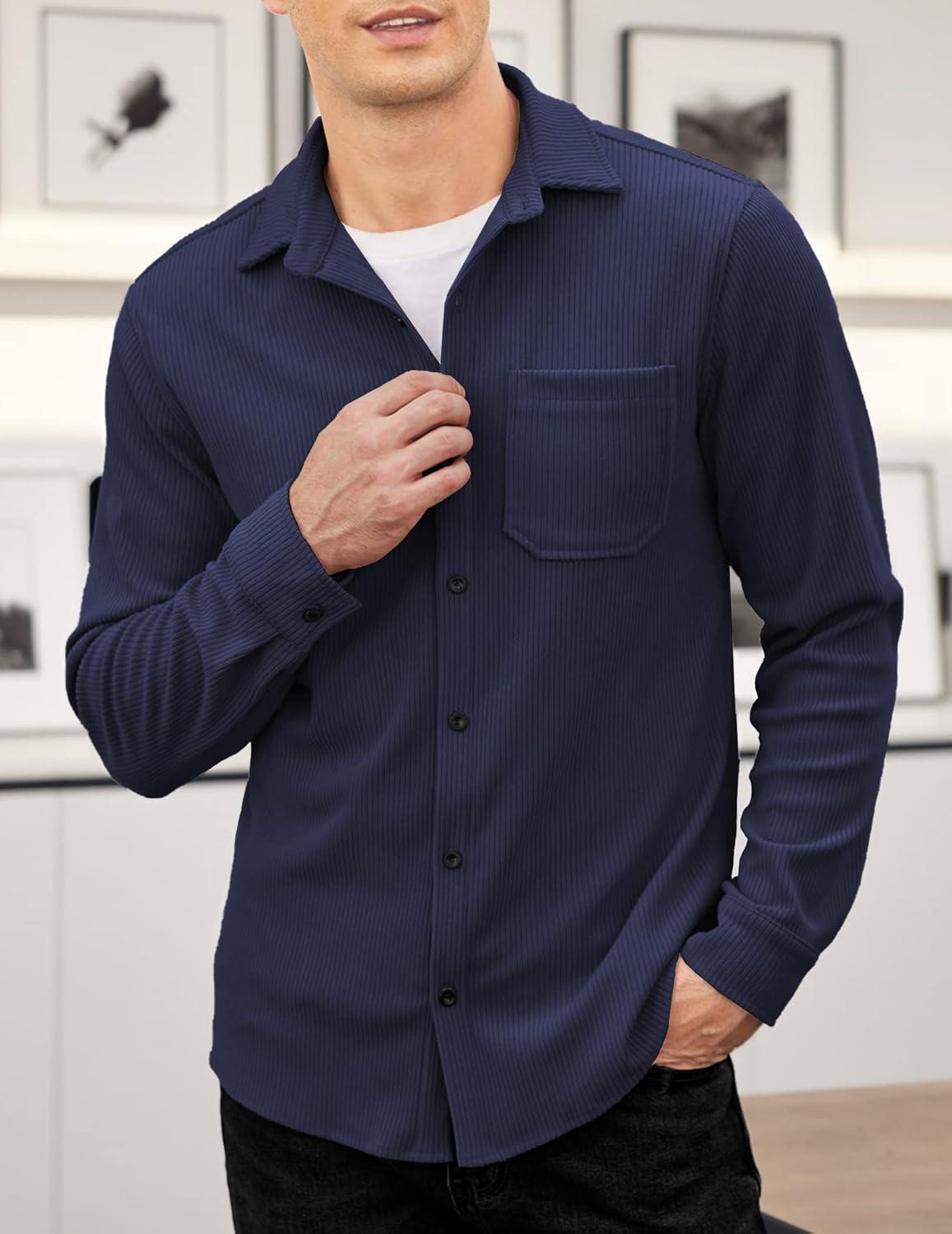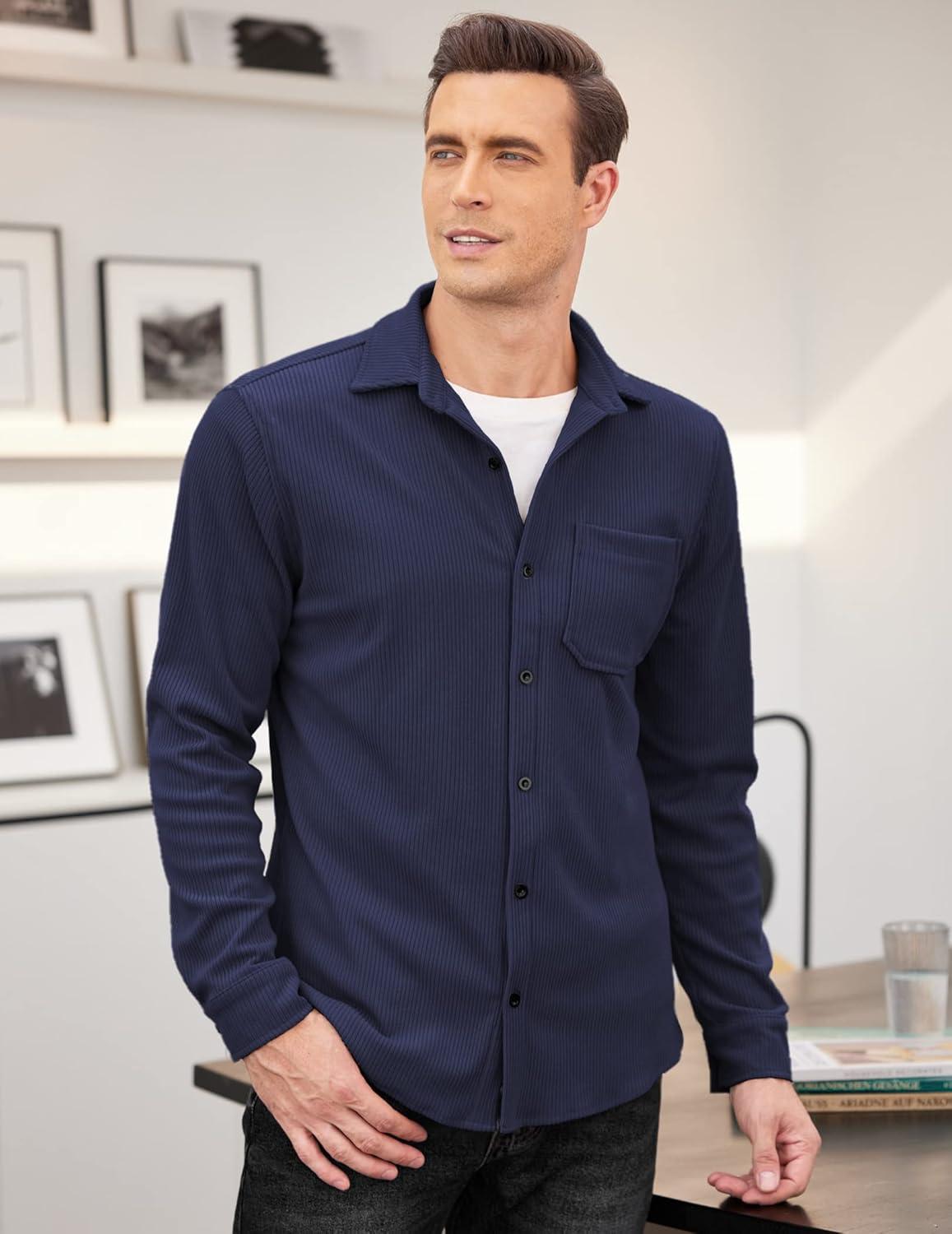 COOFANDY Men’s Corduroy Shirt Casual Shacket Long Sleeve Button Down Lightweight Jacket(Navy Blue)