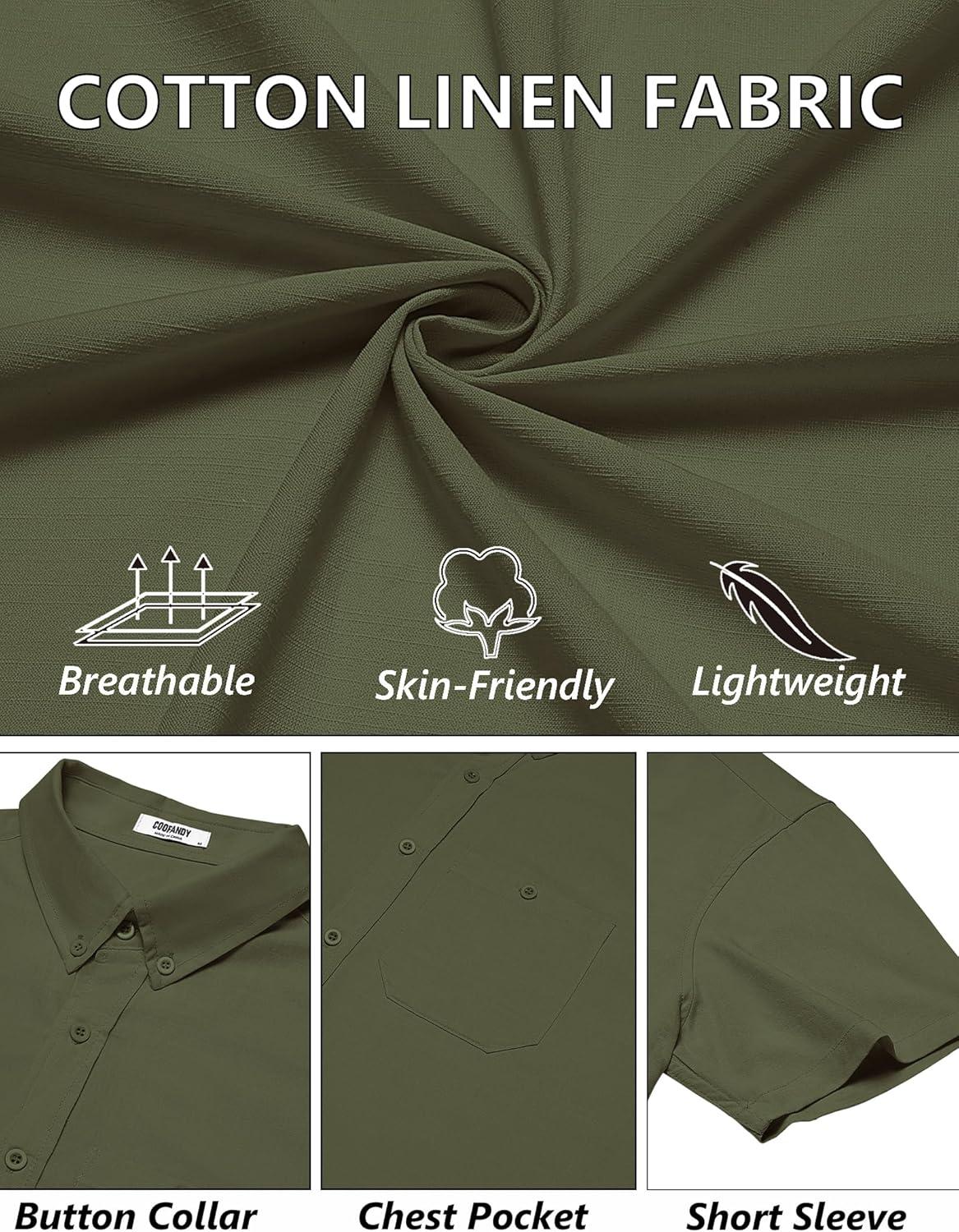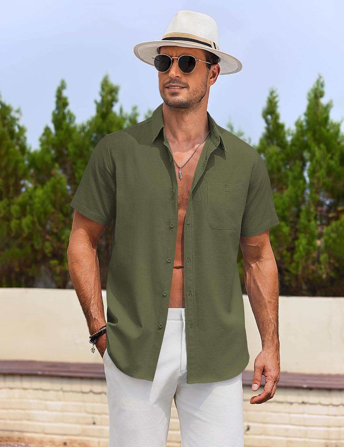 COOFANDY Men’s Cotton Linen Shirts Short Sleeve Casual Shirts Summer Button Down Shirt Linen Beach Vacation Shirt(Army Green)