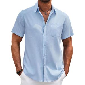 COOFANDY Men’s Linen Shirts Short Sleeve Casual Shirts Summer Beach Button Down Shirts with Pocket(Clear Blue)