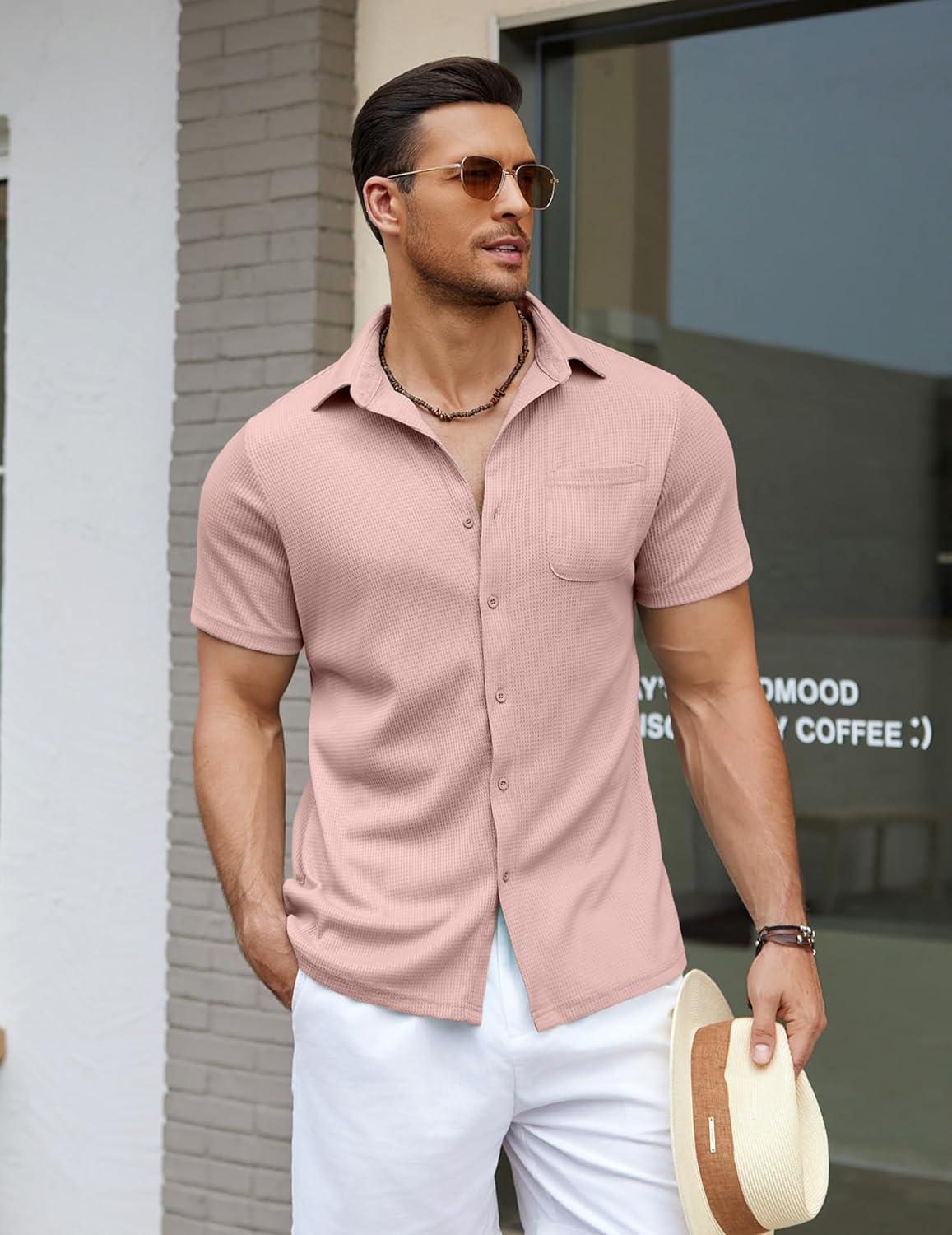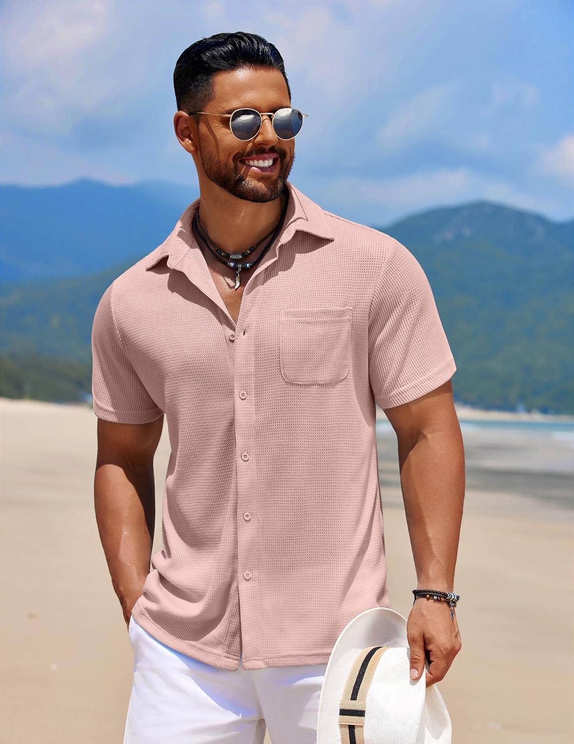COOFANDY Mens 2025 Fashion Textured Shirts Short Sleeve Summer Beach Shirt Casual Button Down Shirts(Pink)
