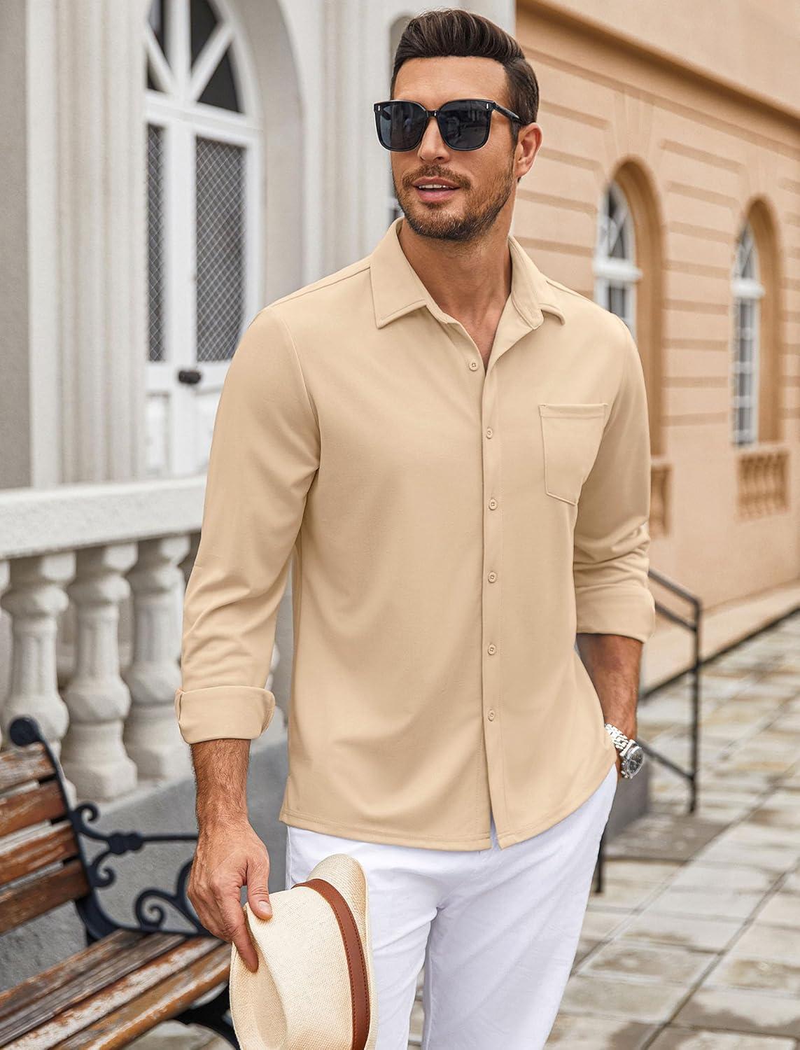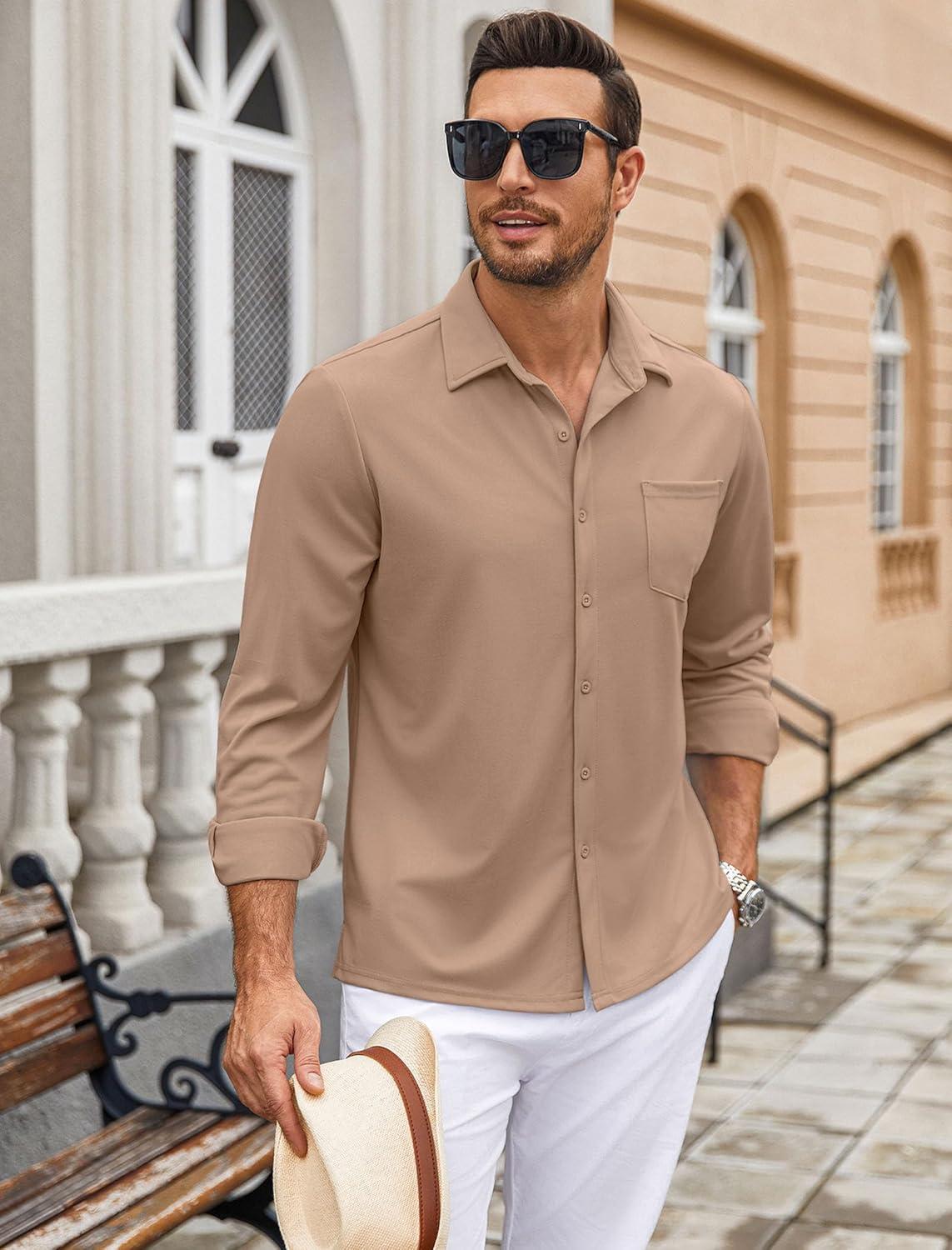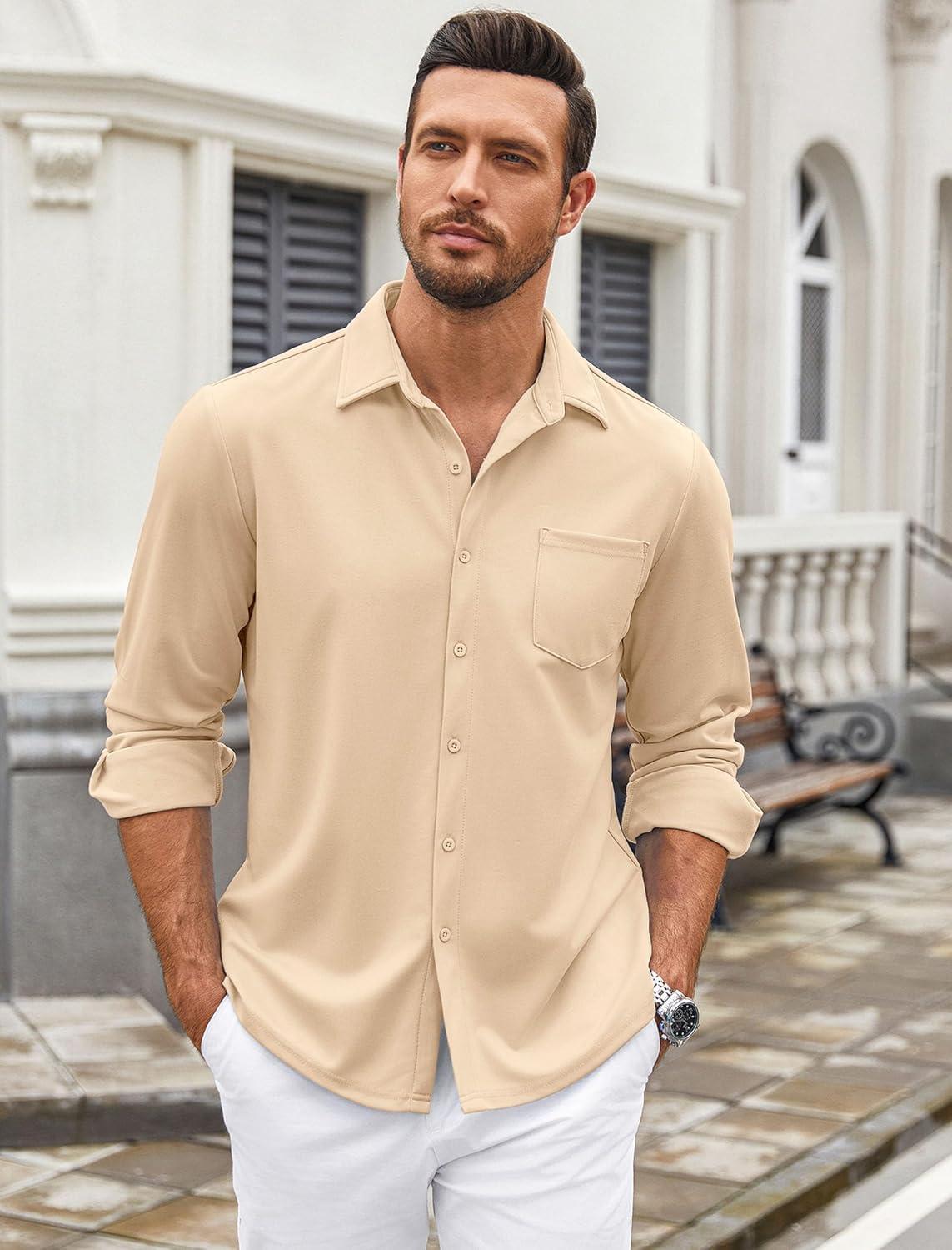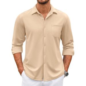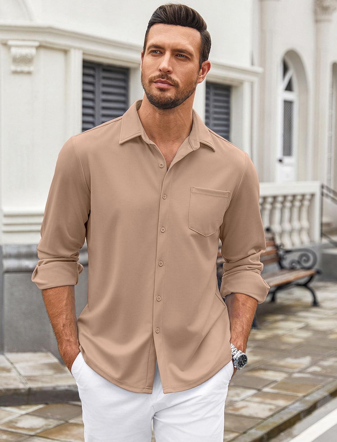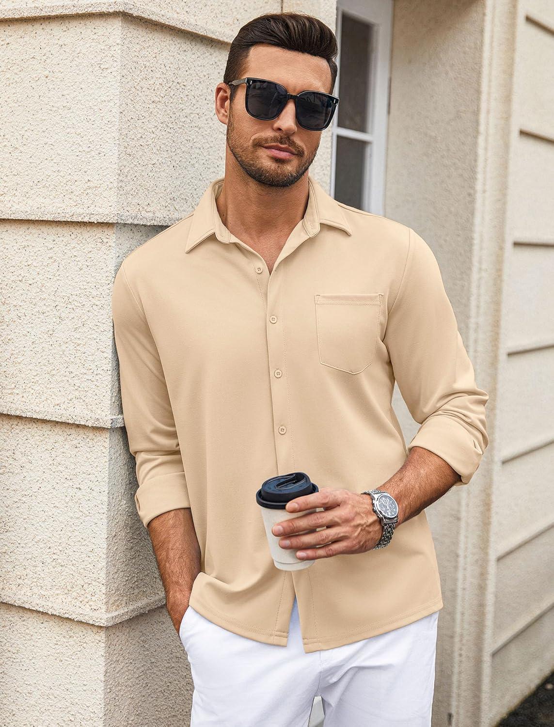 COOFANDY Mens Wrinkle Free Dress Shirts Long Sleeve Untucked Shirts Casual Button Down Shirts(Light Khaki)