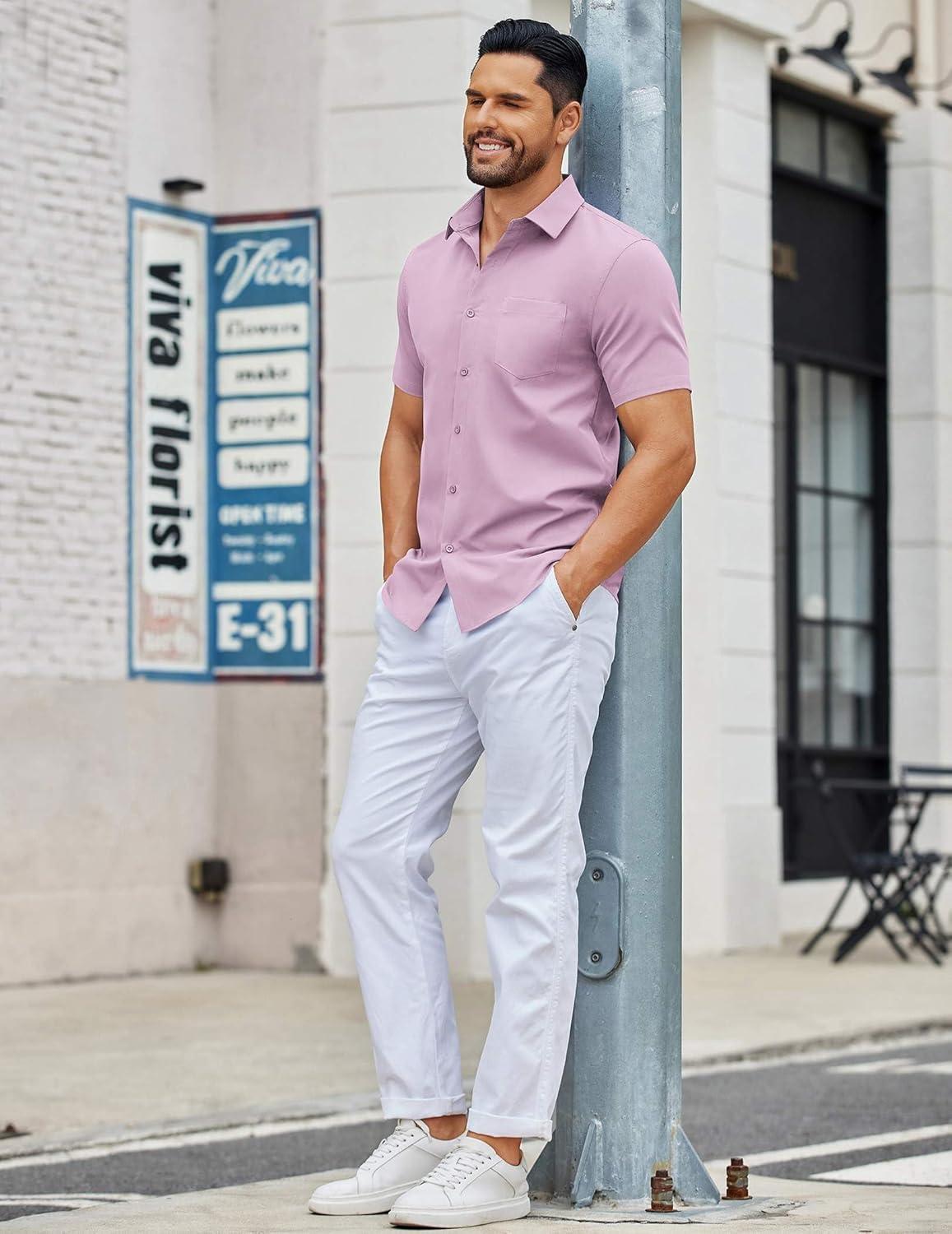 COOFANDY Men’s Button Down Shirts Short Sleeve Casual Dress Shirts Untucked Summer Shirt with Pocket(Light Pink)
