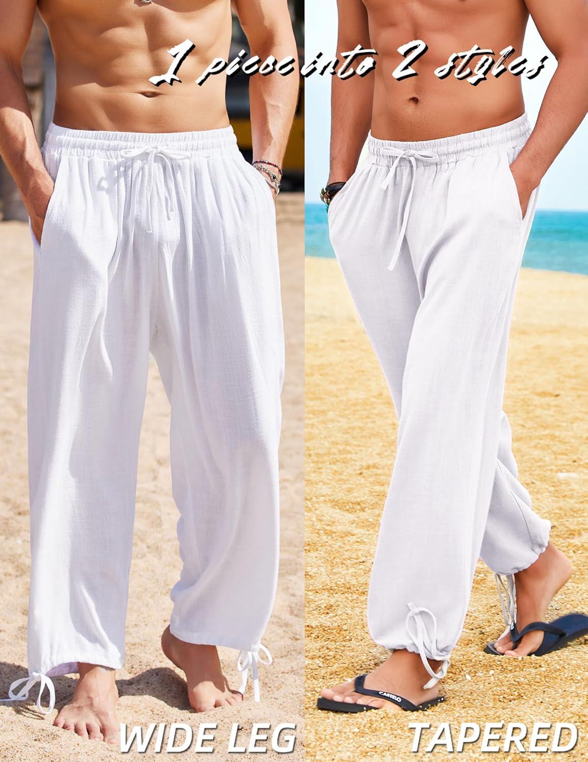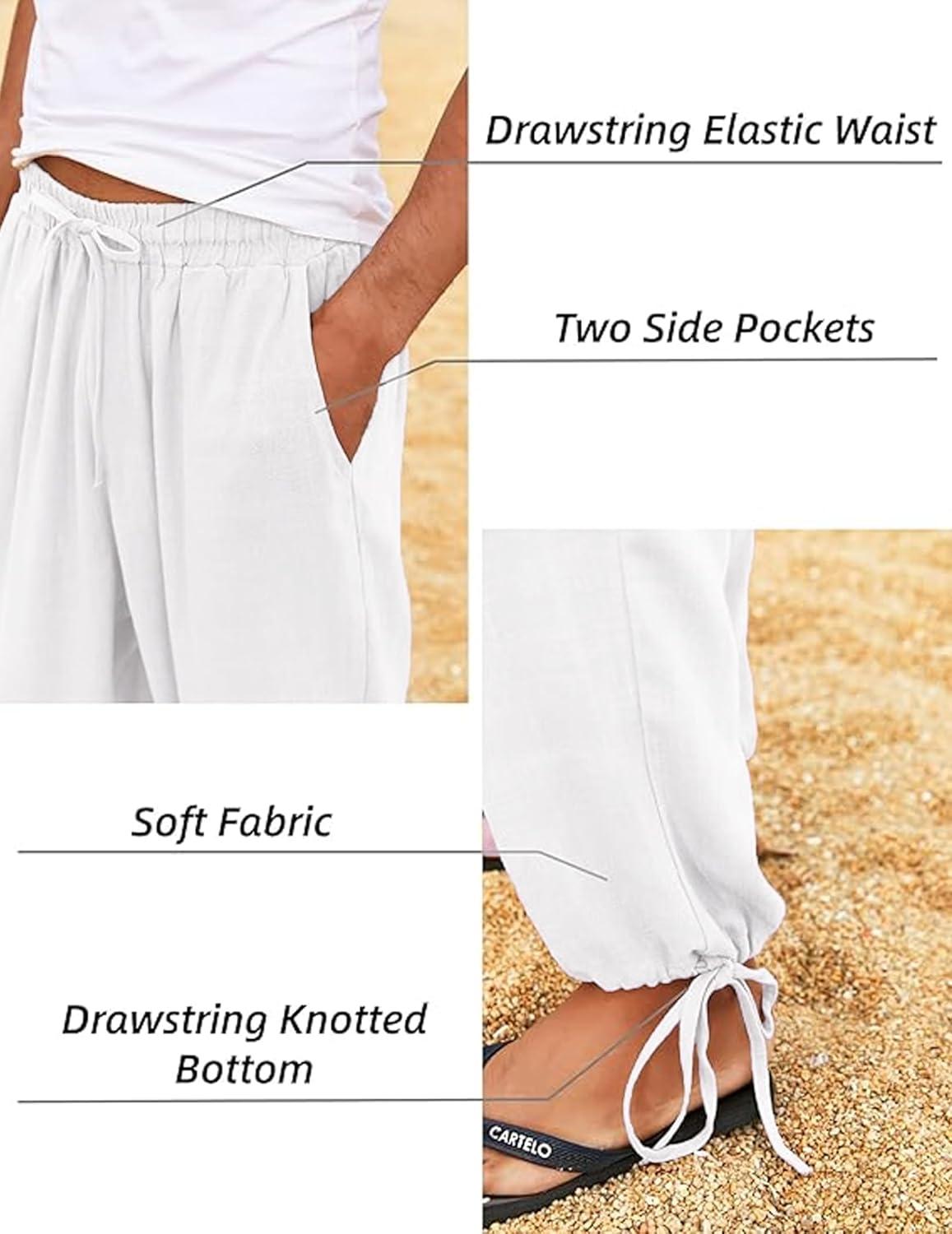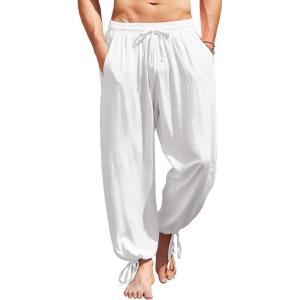 COOFANDY Men’s Cotton Linen Pants Casual Harem Pants Elastic Waist Beach Boho Yoga Trousers(1-white)
