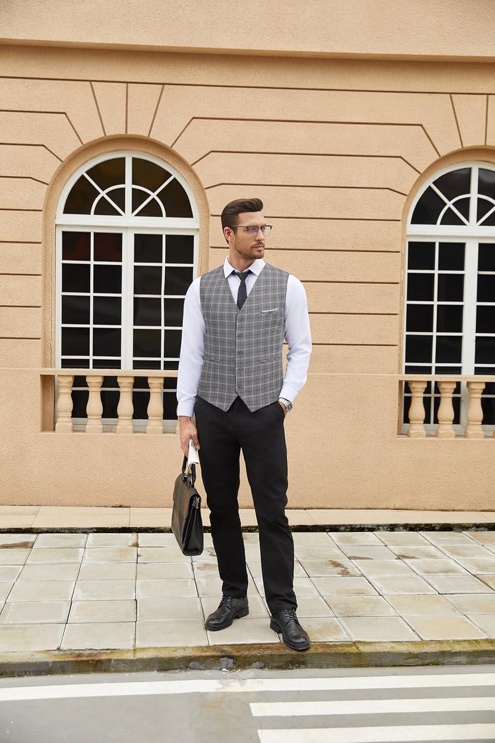 COOFANDY Men’s Suit Vest Slim Fit Formal Dress Waistcoat Casual Business Vests for Suit or Tuxedo(Plaid Grey)