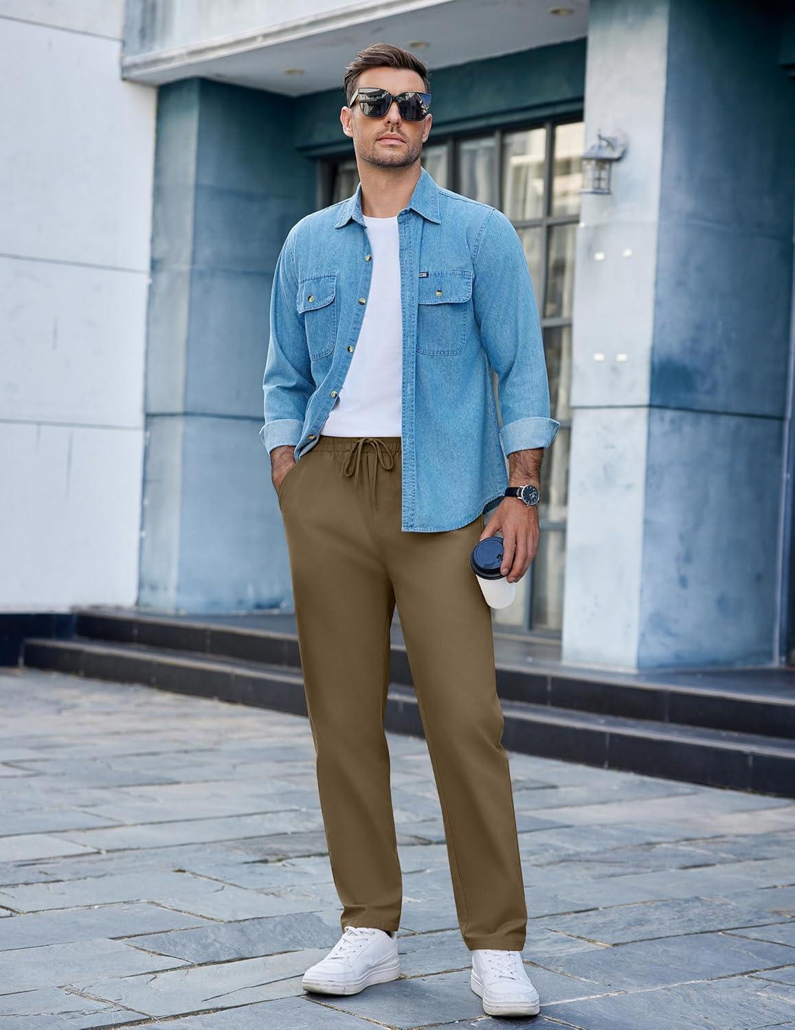 COOFANDY Men’s Casual Cotton Pants Regular Fit Elastic Waist Drawstring Twill Pants Straight Leg Chino Pants(Brown)