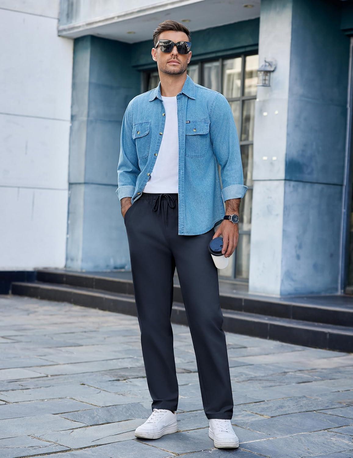 COOFANDY Men’s Casual Cotton Pants Regular Fit Elastic Waist Drawstring Twill Pants Straight Leg Chino Pants(Black)