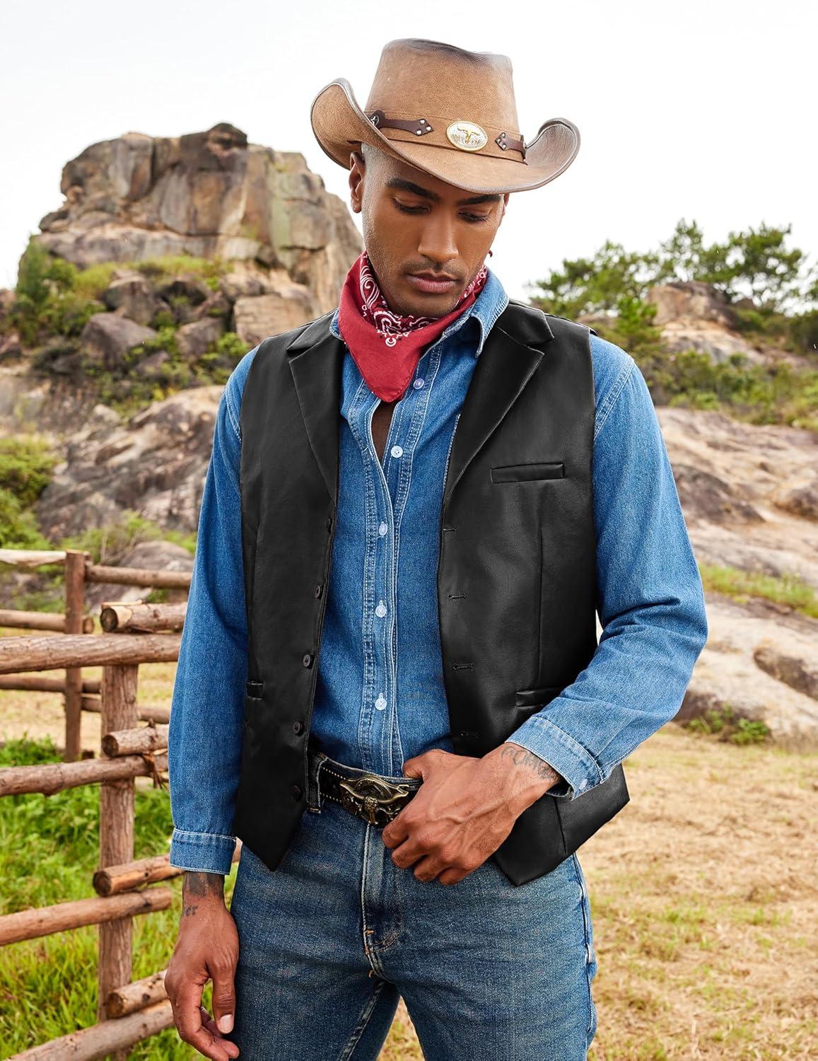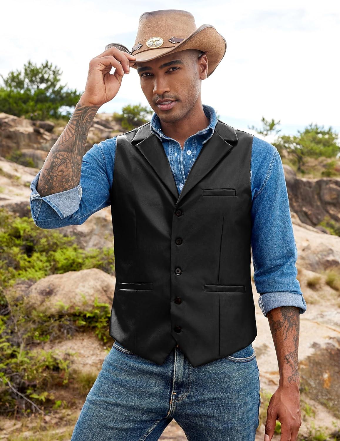 COOFANDY Men’s Leather Suit Vest Slim Fit Casual Western Vest Jacket Lightweight V-Neck Dress Waistcoats(Black)