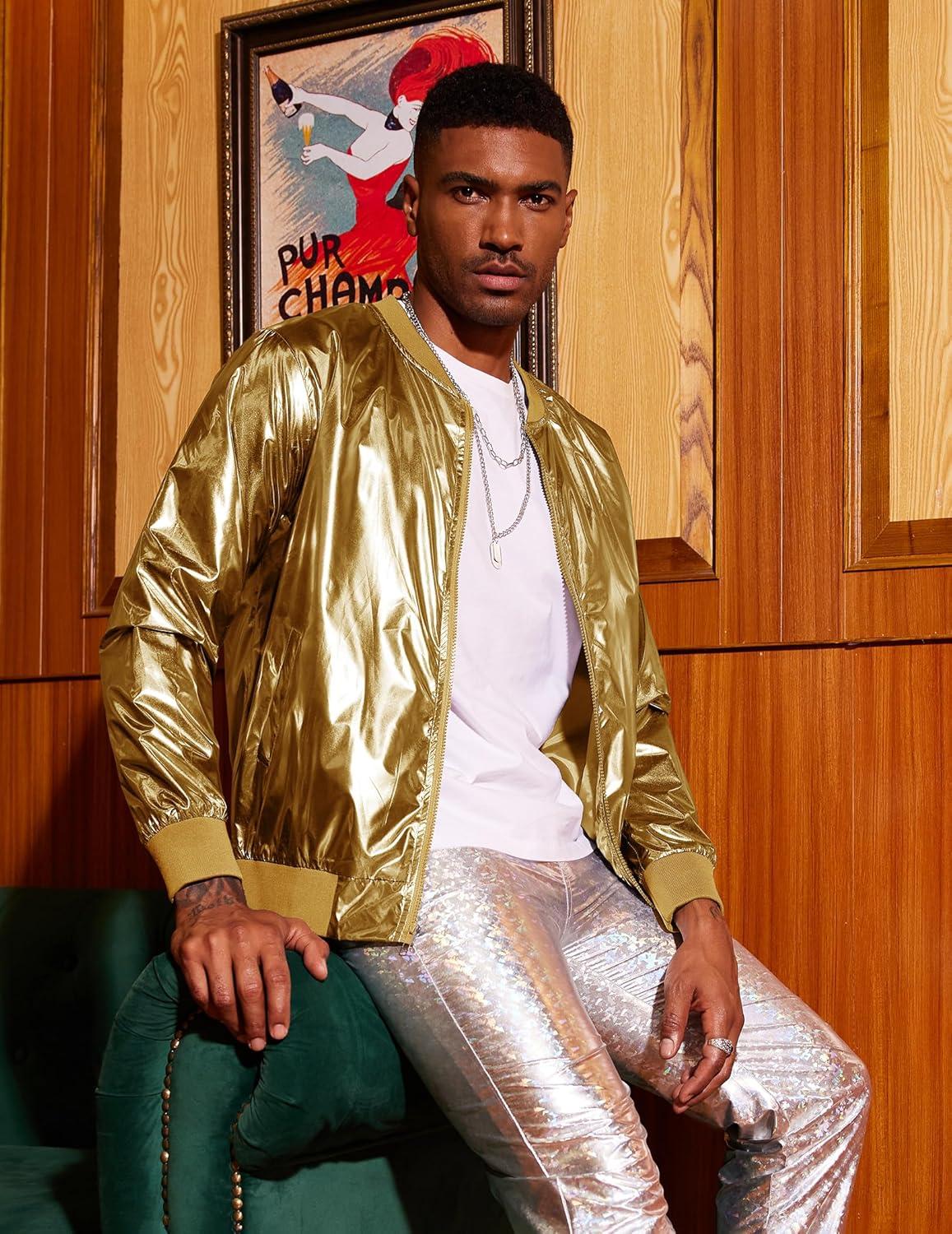 COOFANDY Men’s Metallic Jacket 70s Disco Dance Party Costume Shiny Varsity Zipper Baseball Bomber Jacket(Laser Gold)