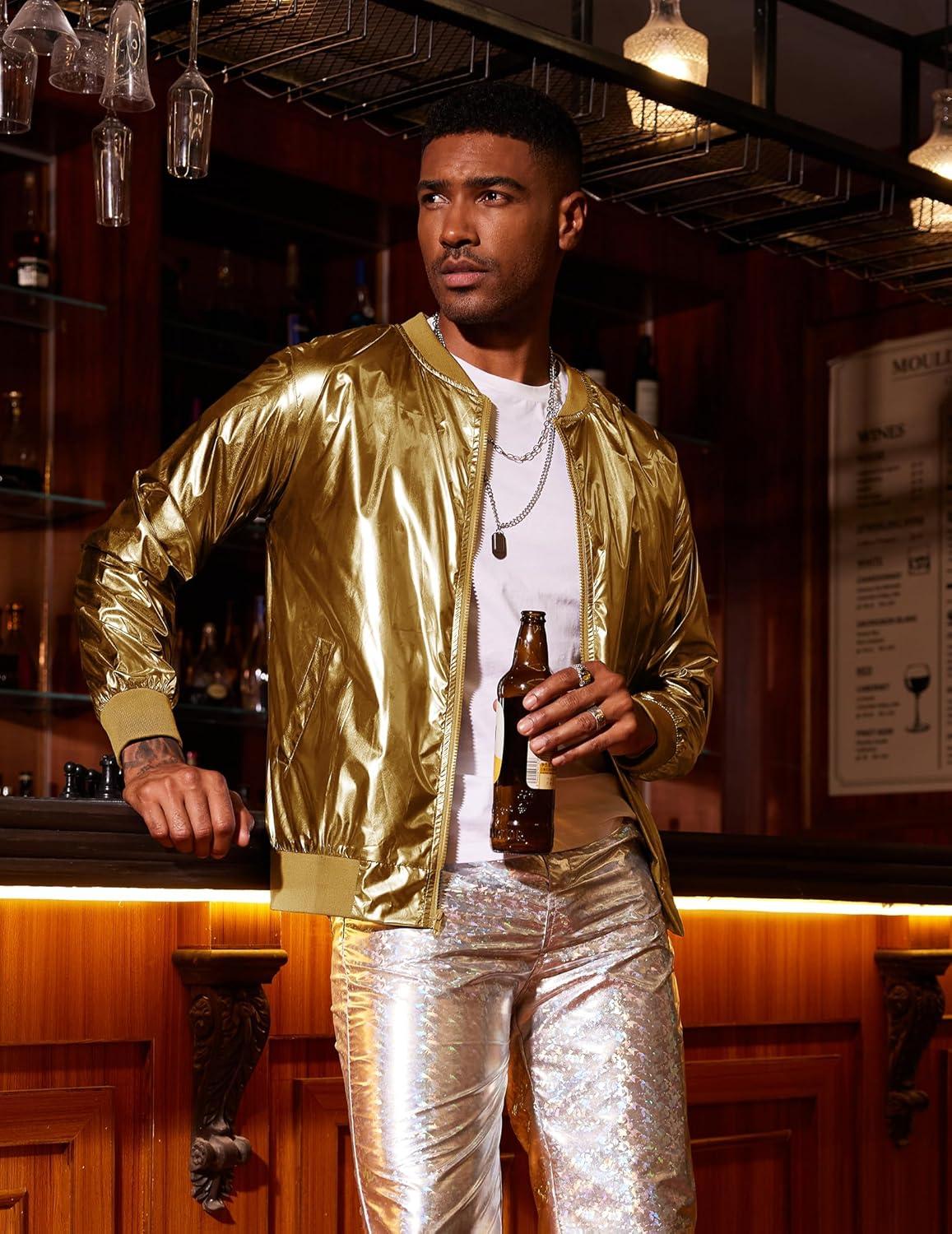 COOFANDY Men’s Metallic Jacket 70s Disco Dance Party Costume Shiny Varsity Zipper Baseball Bomber Jacket(01-gold)