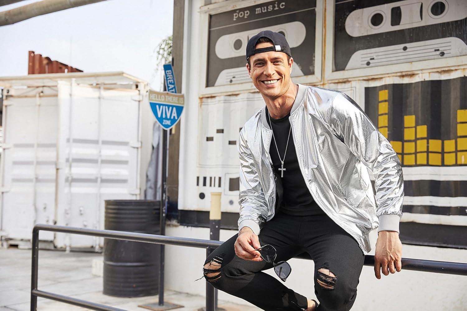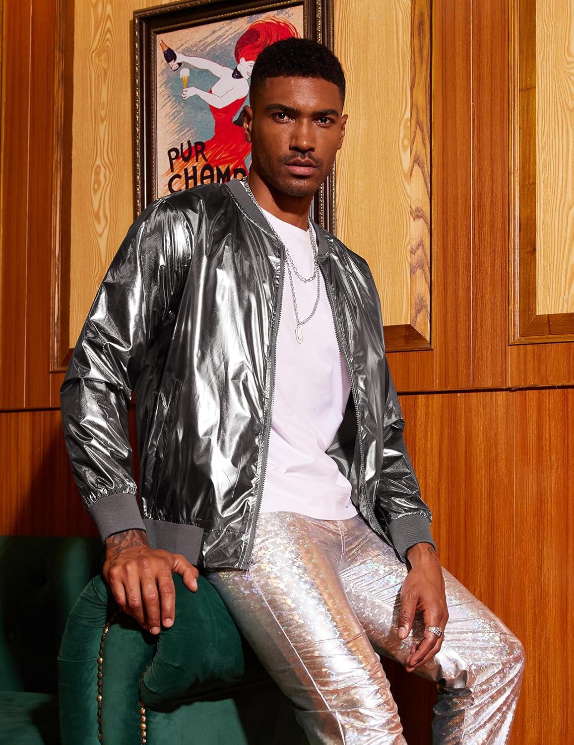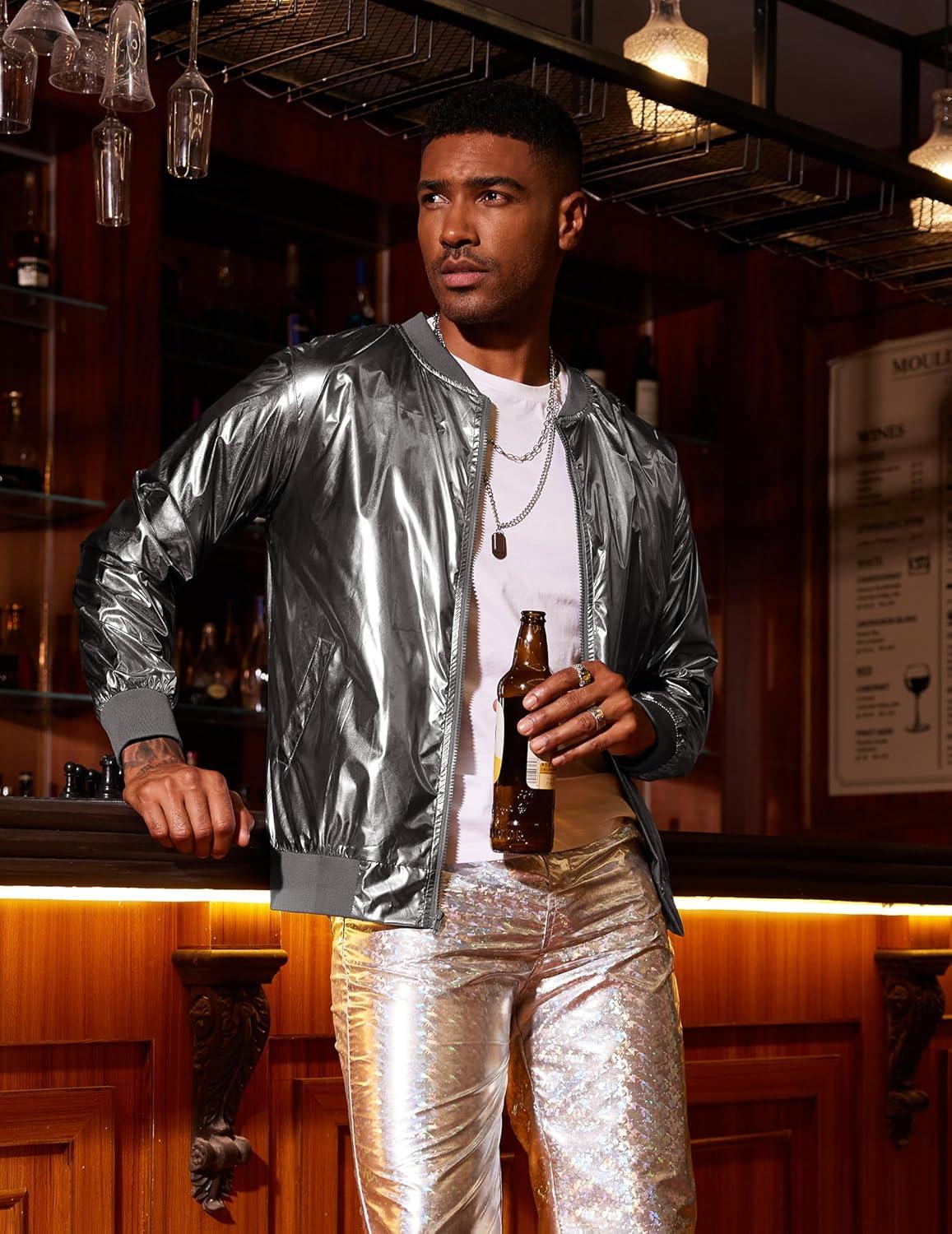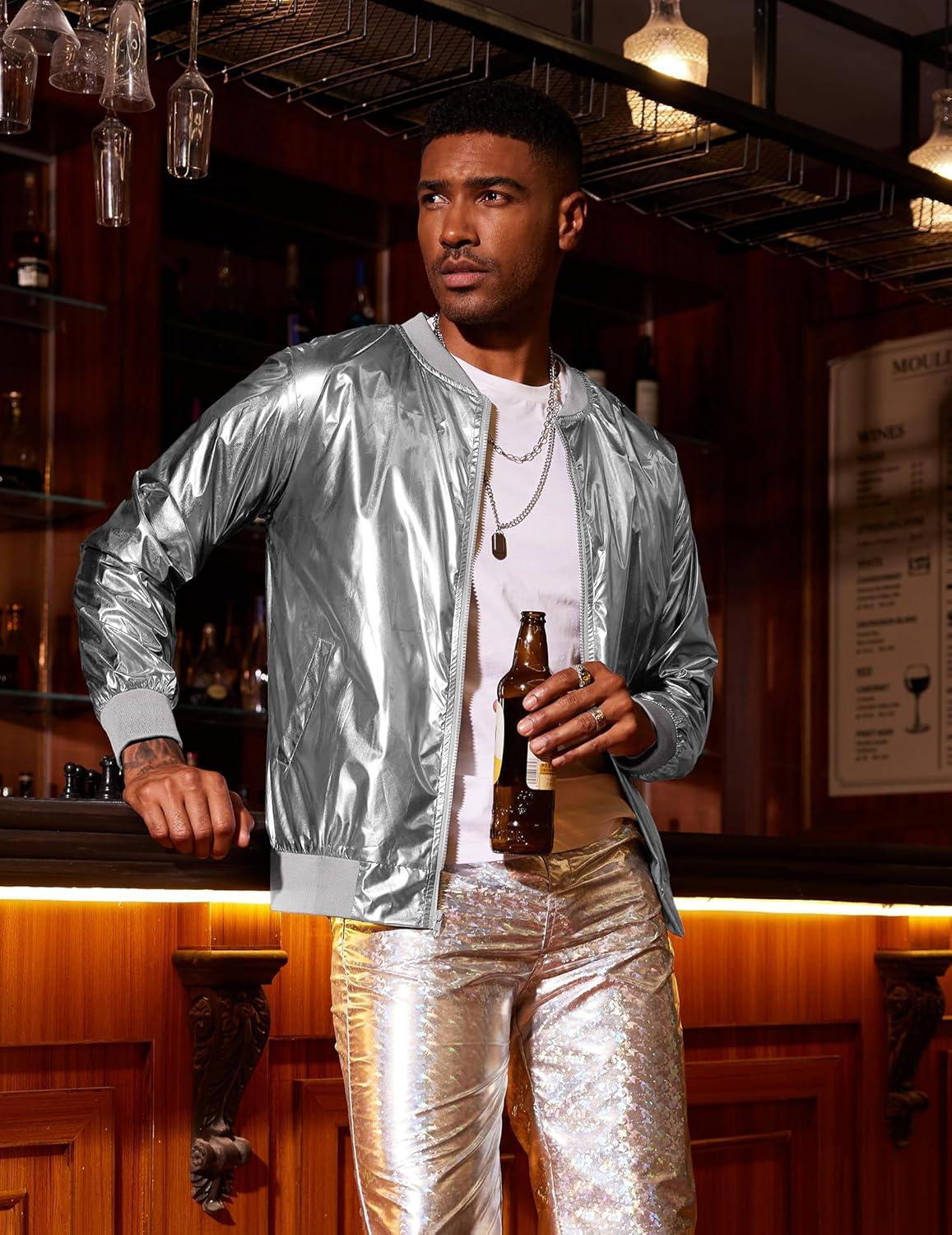 COOFANDY Men’s Metallic Jacket 70s Disco Dance Party Costume Shiny Varsity Zipper Baseball Bomber Jacket(02-silver)