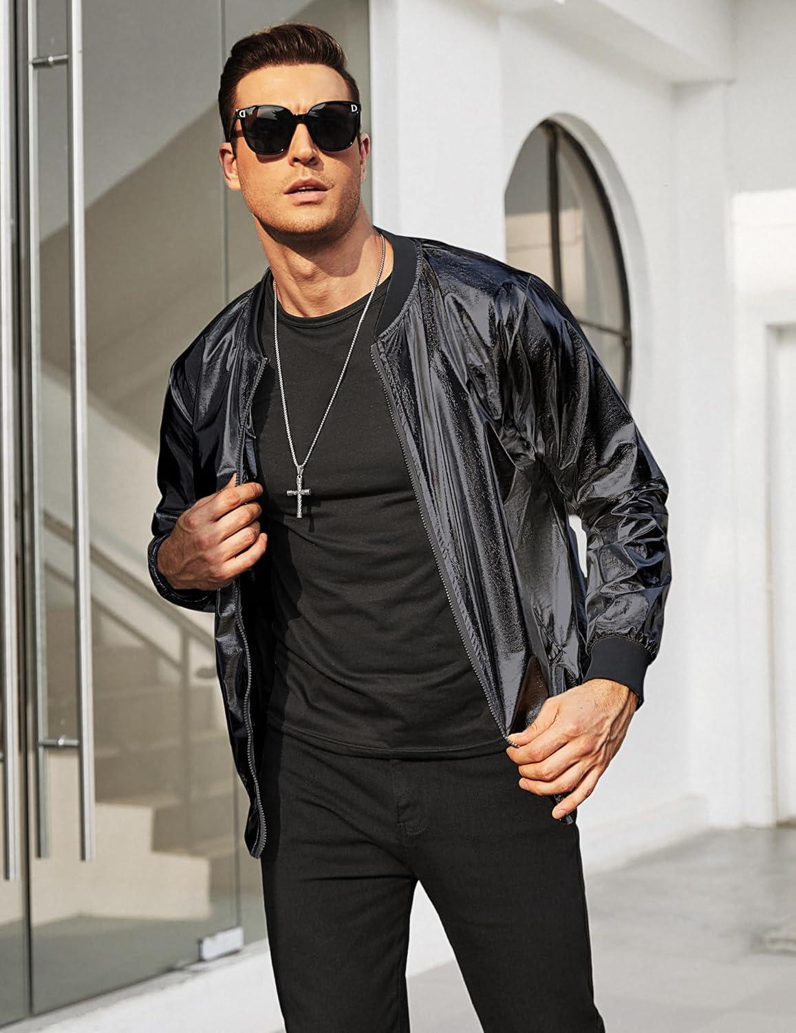 COOFANDY Men’s Metallic Jacket 70s Disco Dance Party Costume Shiny Varsity Zipper Baseball Bomber Jacket(Black)