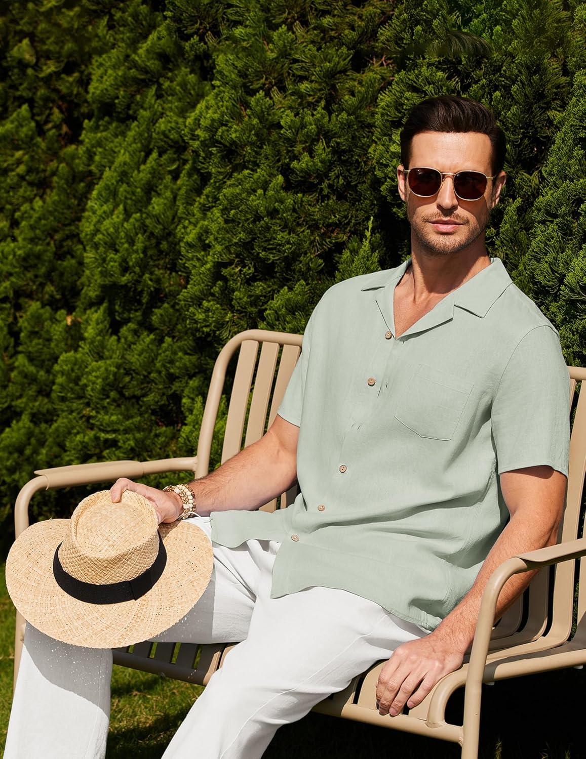COOFANDY Men 2 Piece Linen Outfit Beach Button Down Shirt Casual Loose Pant Sets(Light Green)