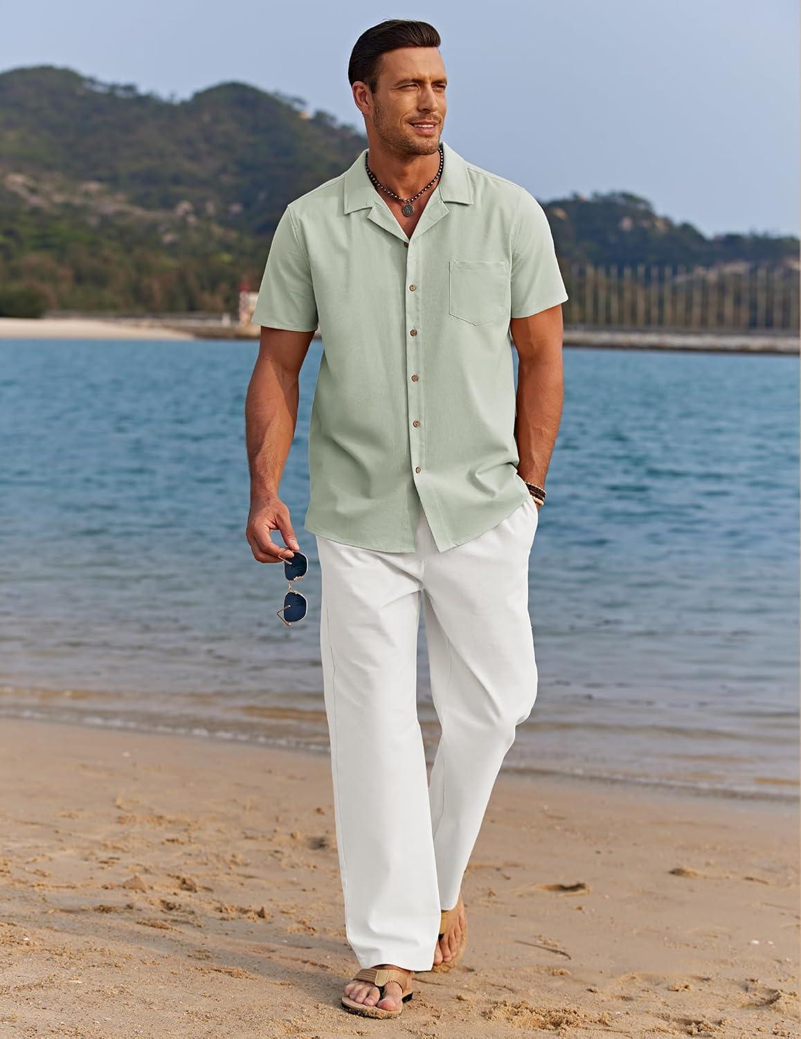 COOFANDY Men 2 Piece Linen Outfit Beach Button Down Shirt Casual Loose Pant Sets(Sage Green Shirt/White Pants)