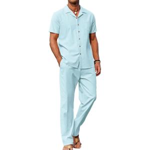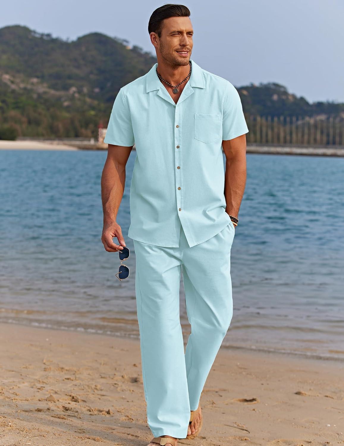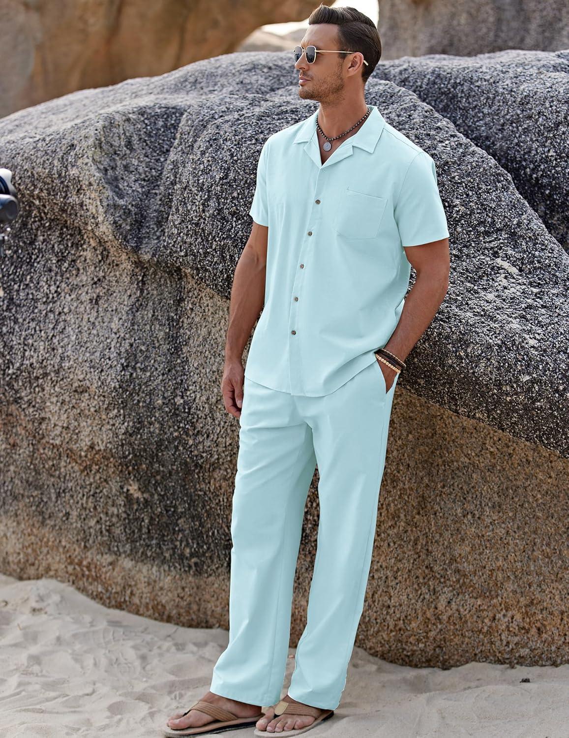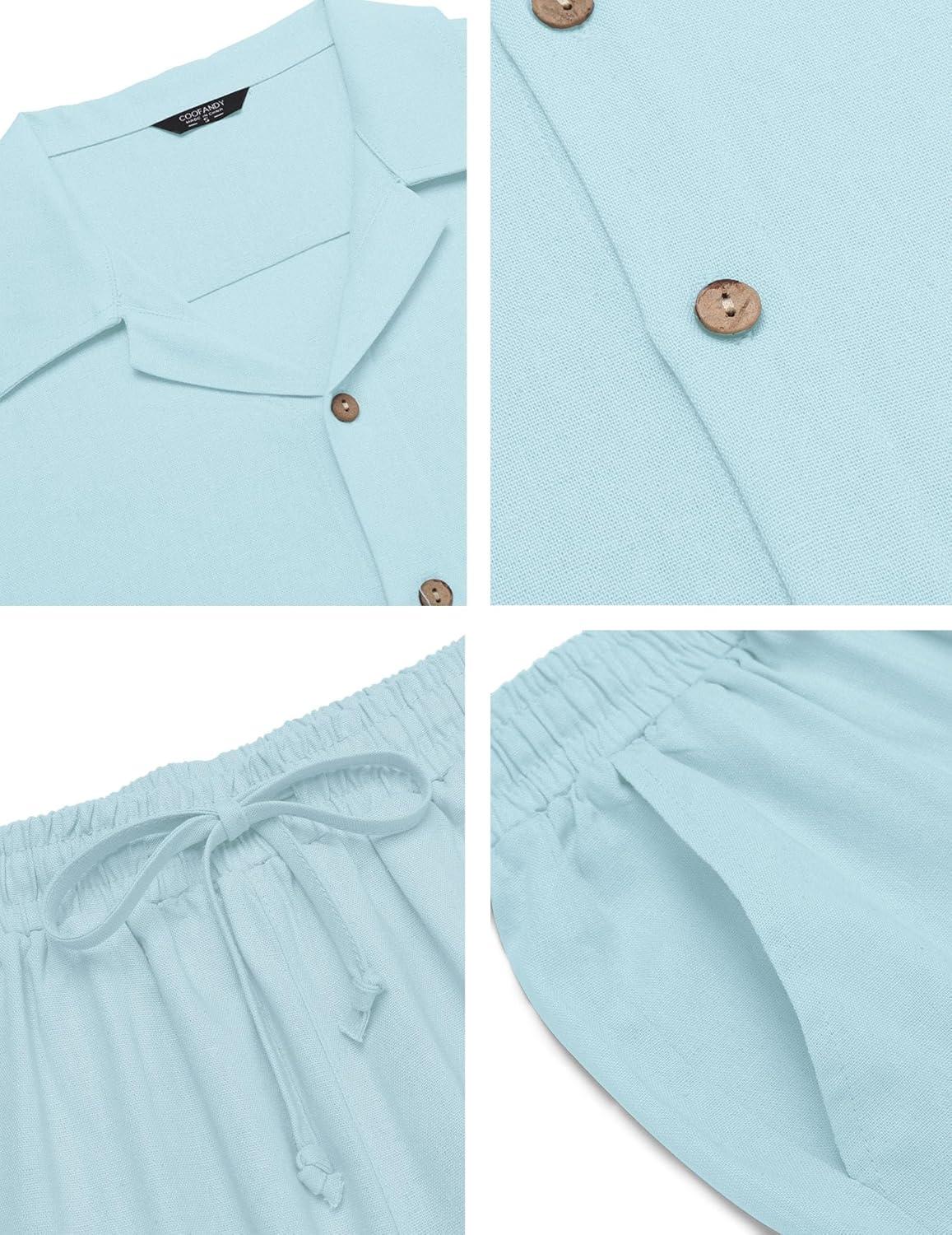 COOFANDY Men 2 Piece Linen Outfit Beach Button Down Shirt Casual Loose Pant Sets(Clear Blue)