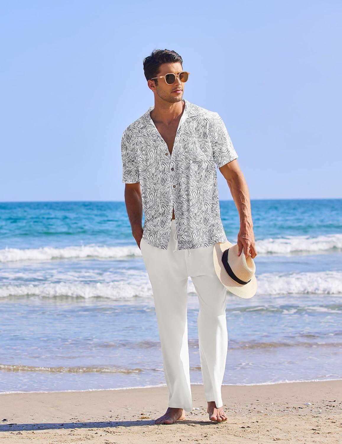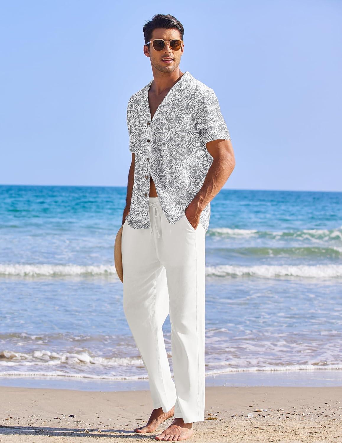 COOFANDY Men 2 Piece Linen Outfit Beach Button Down Shirt Casual Loose Pant Sets(White Floral Shirt/White Pants)