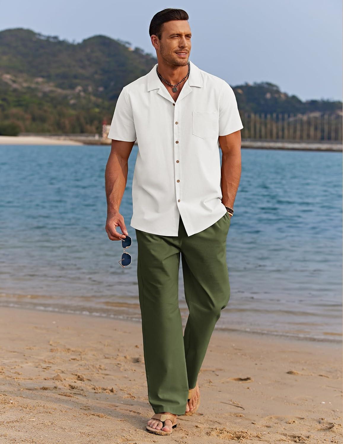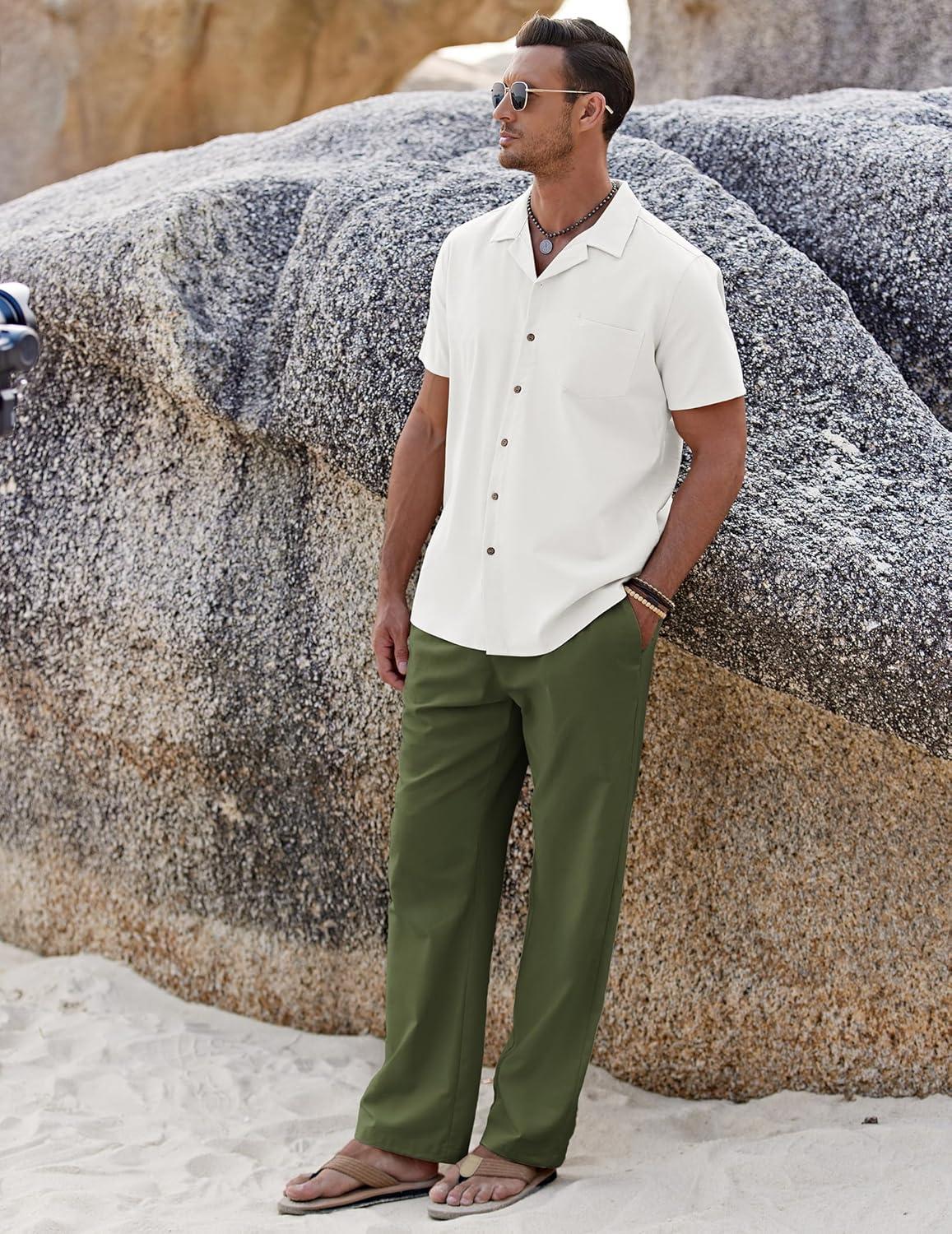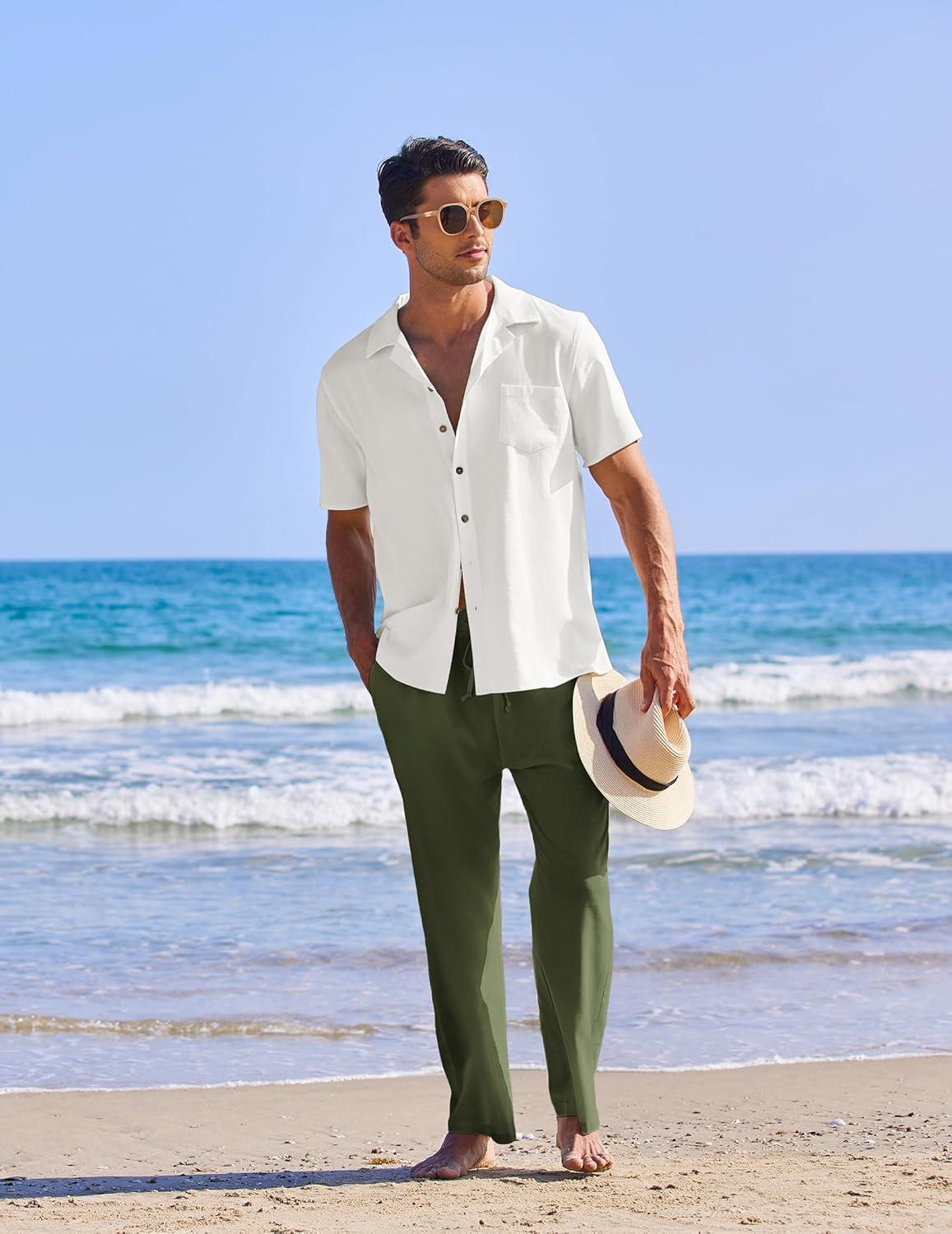 COOFANDY Men 2 Piece Linen Outfit Beach Button Down Shirt Casual Loose Pant Sets(White Shirt/Army Green Pants)