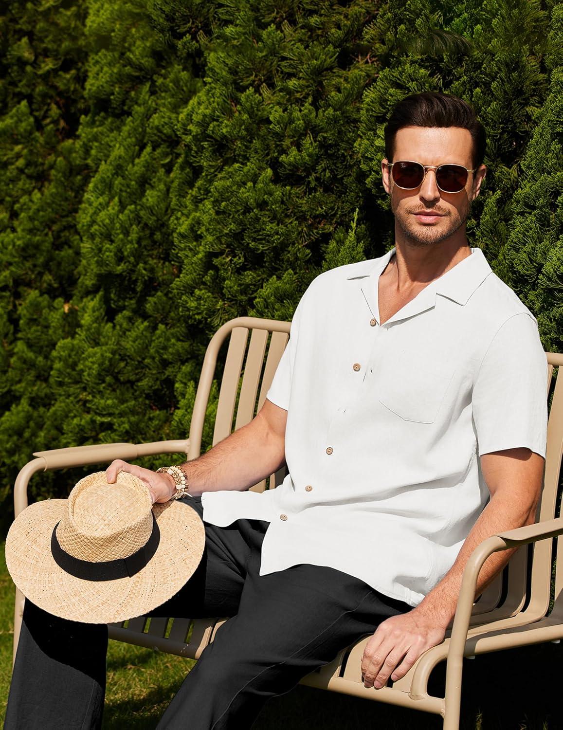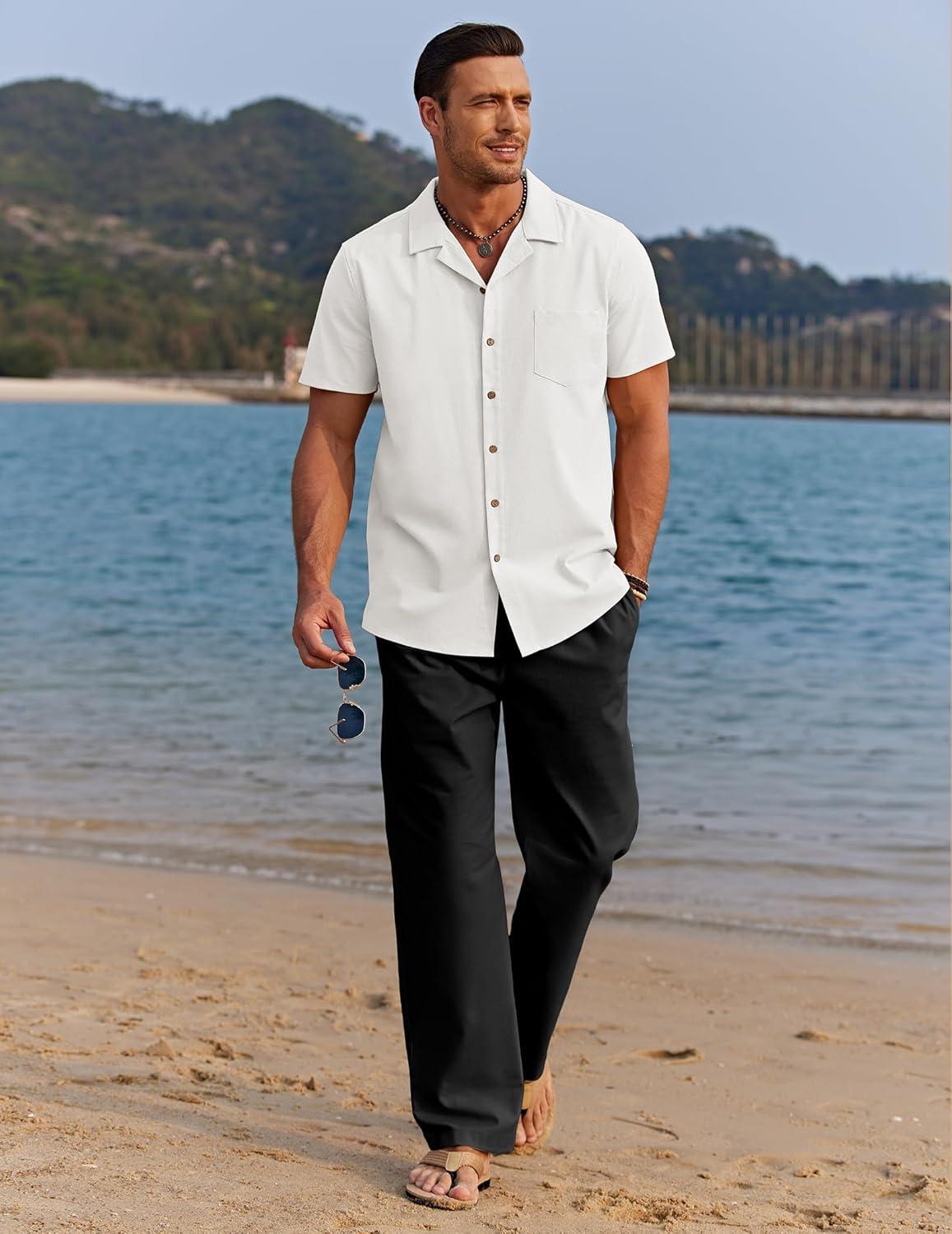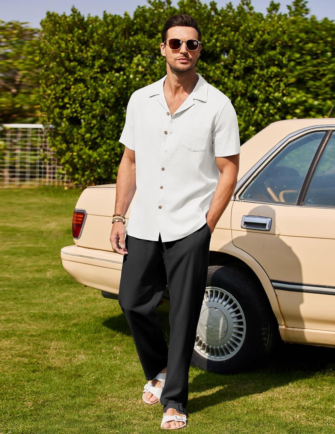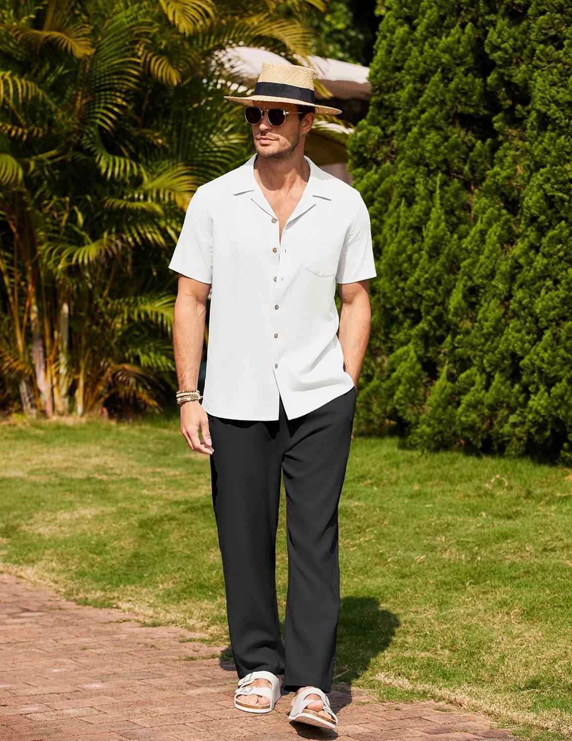 COOFANDY Men 2 Piece Linen Outfit Beach Button Down Shirt Casual Loose Pant Sets(White Shirt/Black Pants)