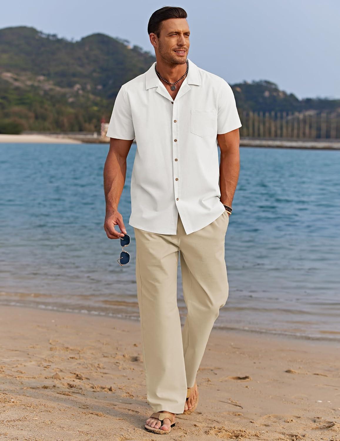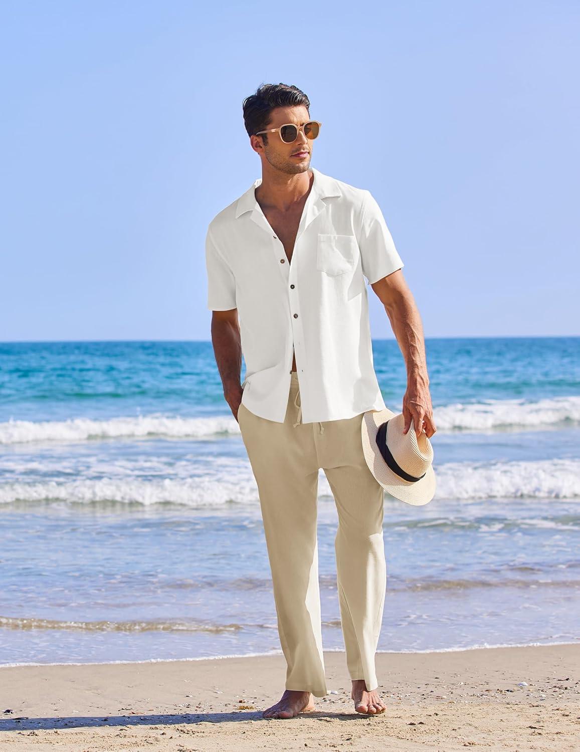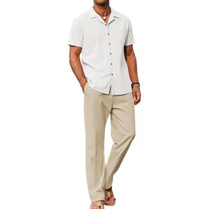 COOFANDY Men 2 Piece Linen Outfit Beach Button Down Shirt Casual Loose Pant Sets(White Shirt/Khaki Pants)