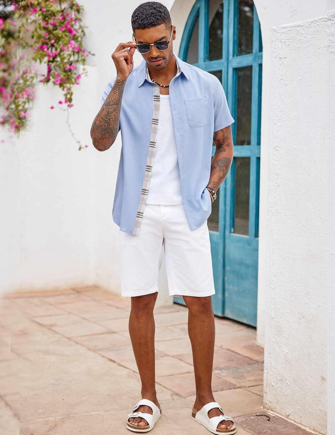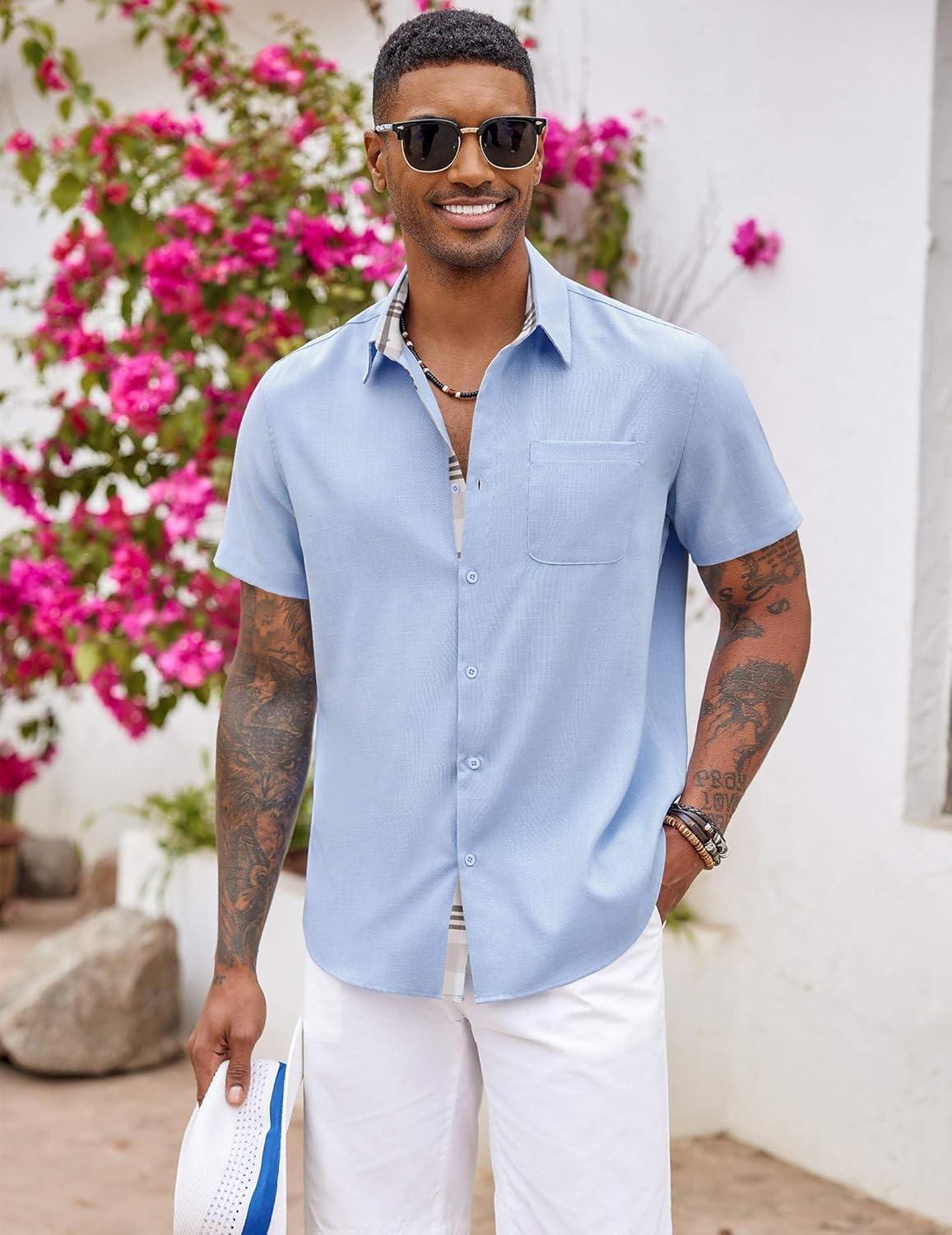 COOFANDY Men’s Button Down Shirts Short Sleeve Casual Shirts Summer Beach Shirts Vacation Wedding Shirts with Pocket(Clear Blue)