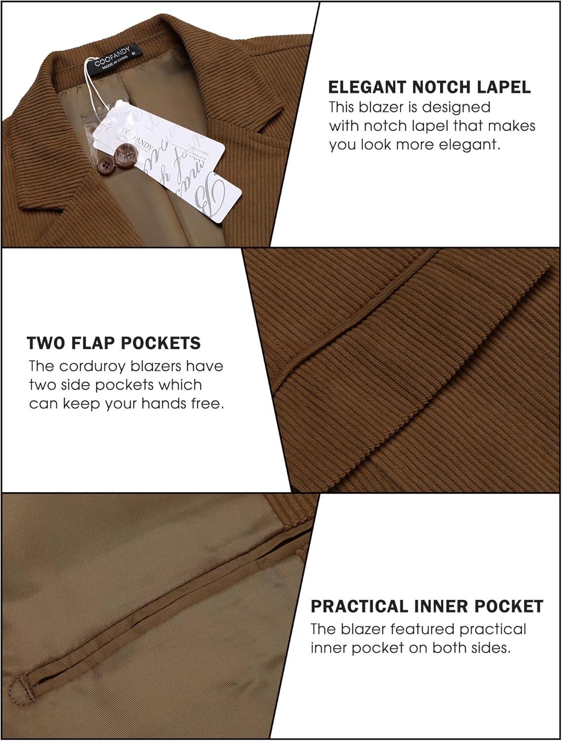 COOFADNY Men’s Casual Corduroy Blazer Classic Fit Two Button Sport Coat Fashion Notch Lapel Blazer Jacket(Coffee)