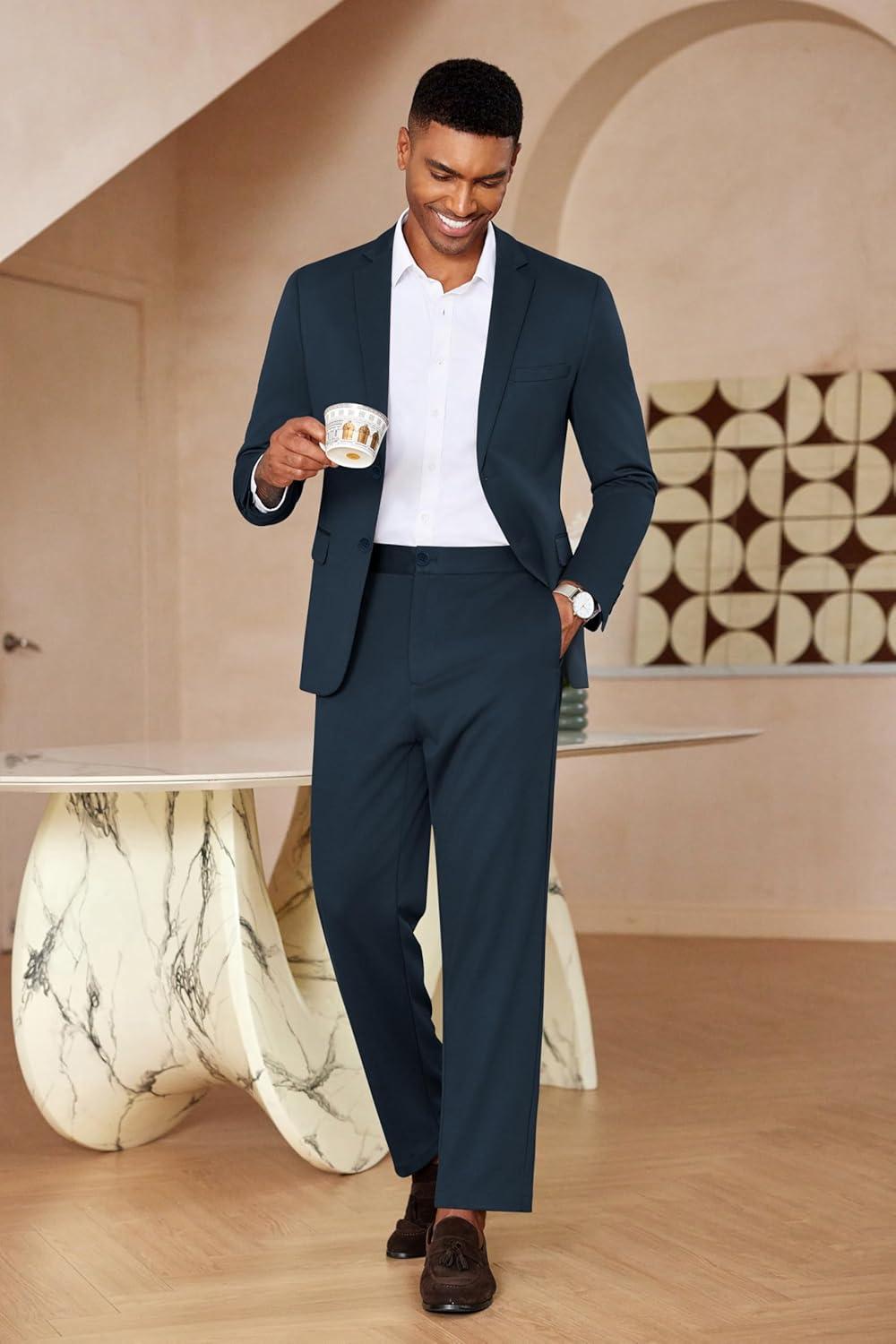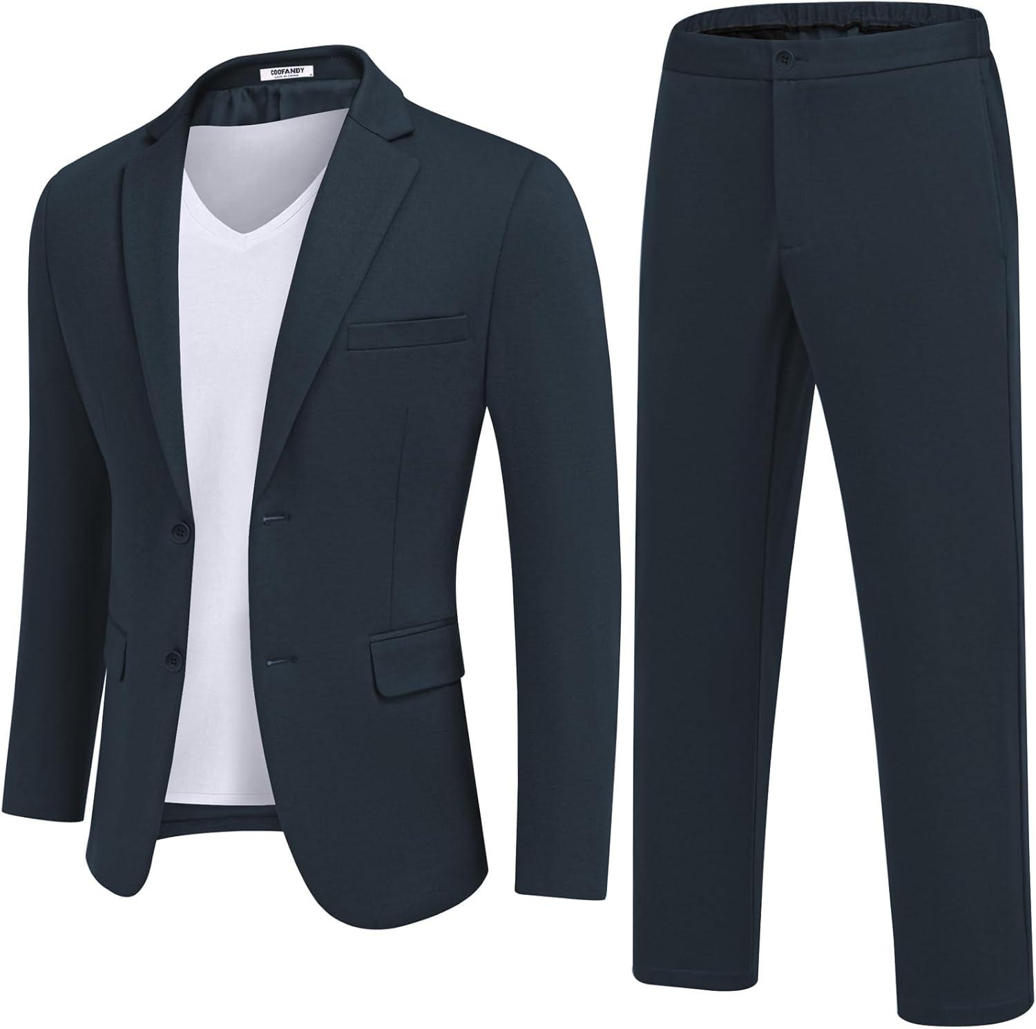 COOFANDY Men’s Suits 2 Piece Slim Fit Suit Set 2 Button Lightweight Casual Knit Blazer Suit Jacket Pants(Navy Blue)