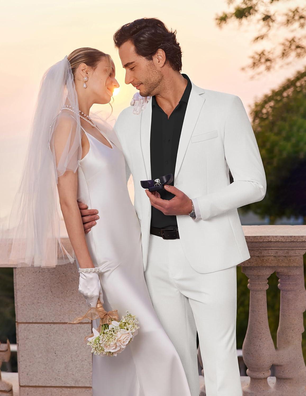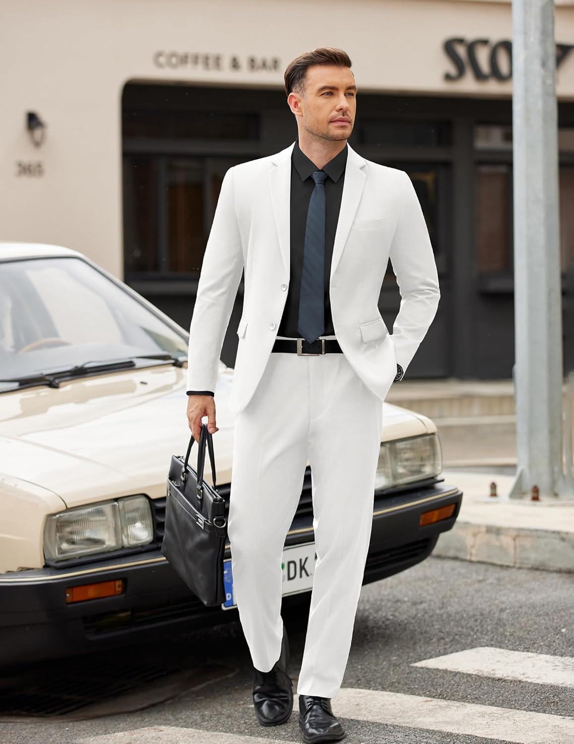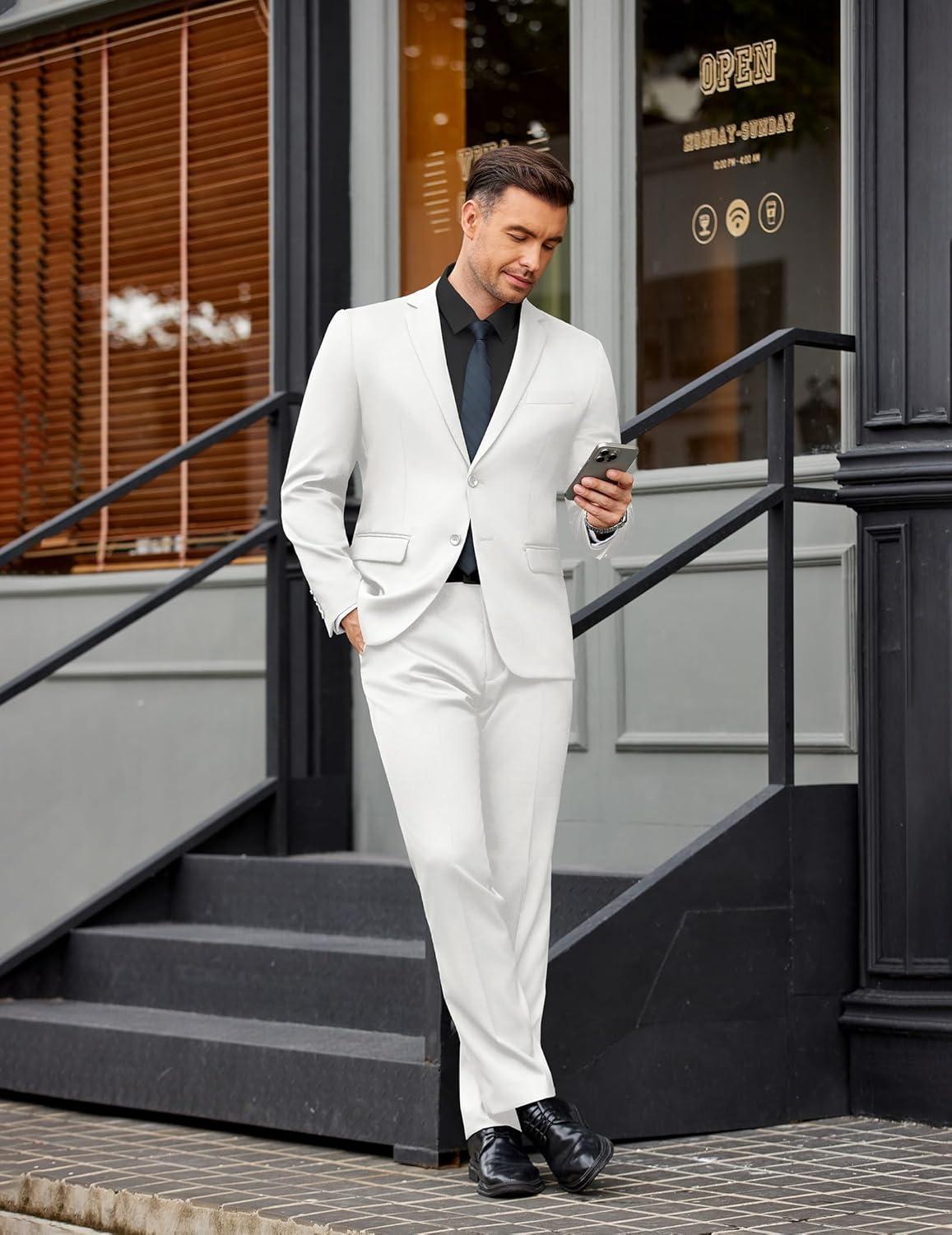 COOFANDY Men’s 2 Piece Suits Slim Fit Two Buttons Casual Blazer Jacket and Pants Set Tuxedo Suit for Wedding Prom Business(White)