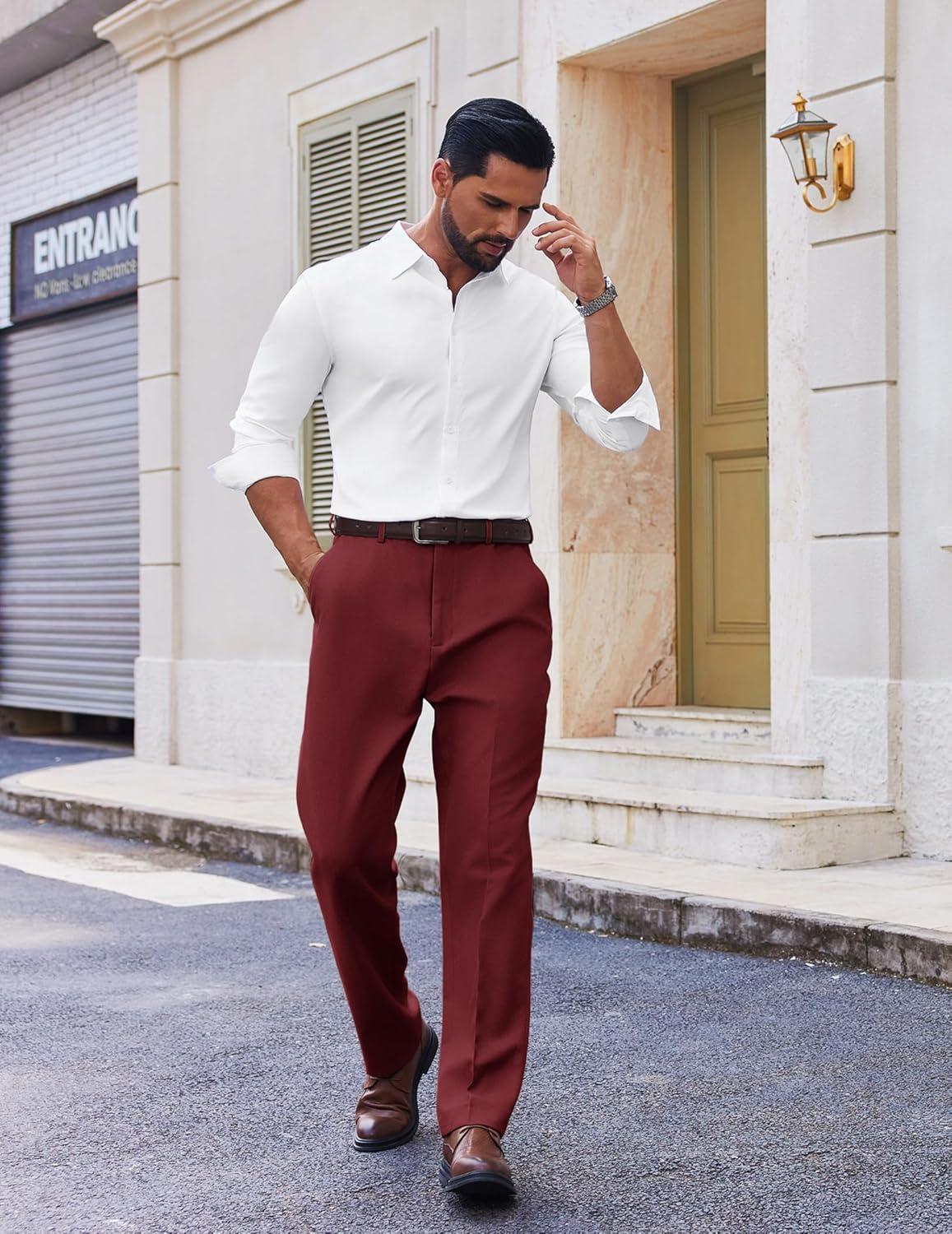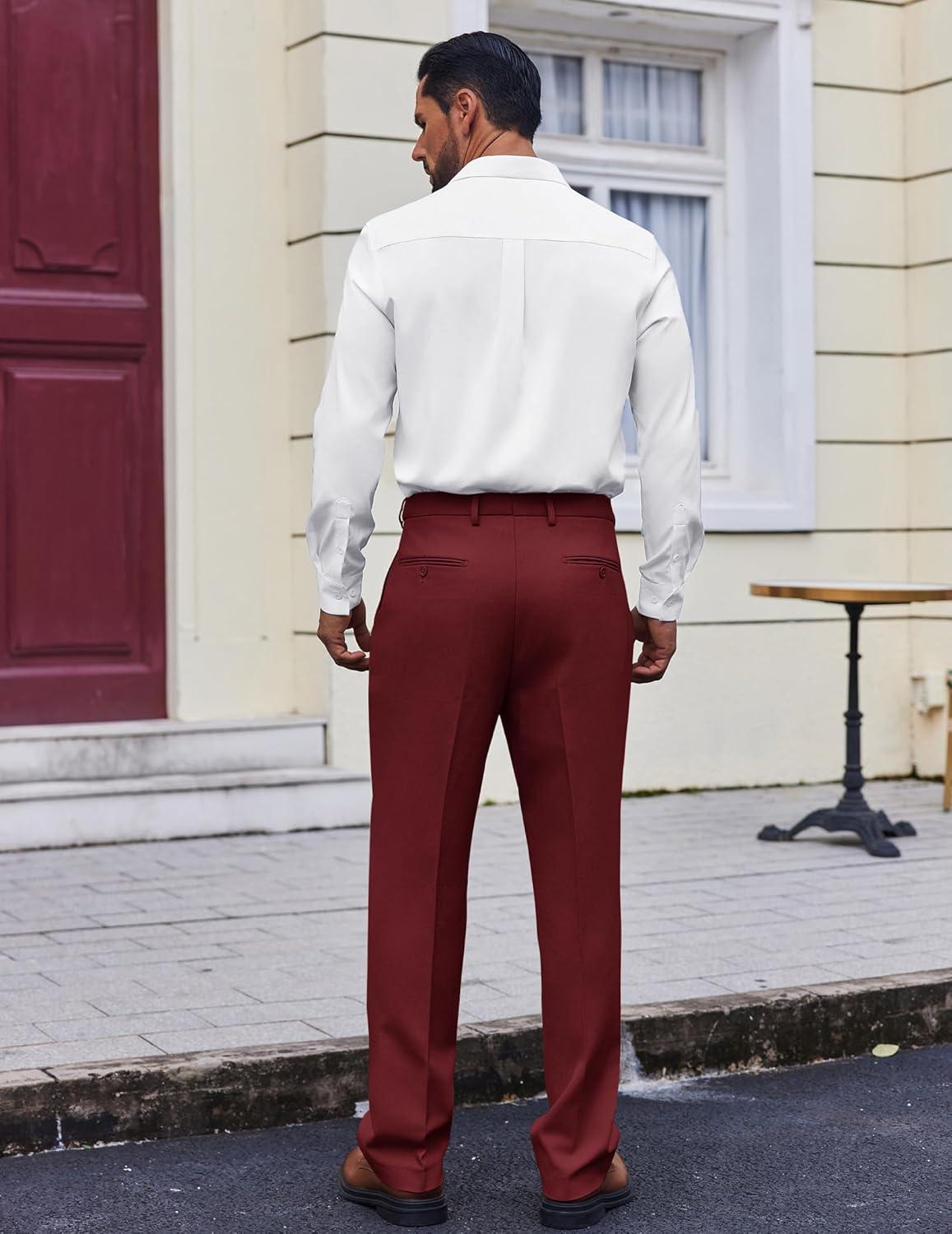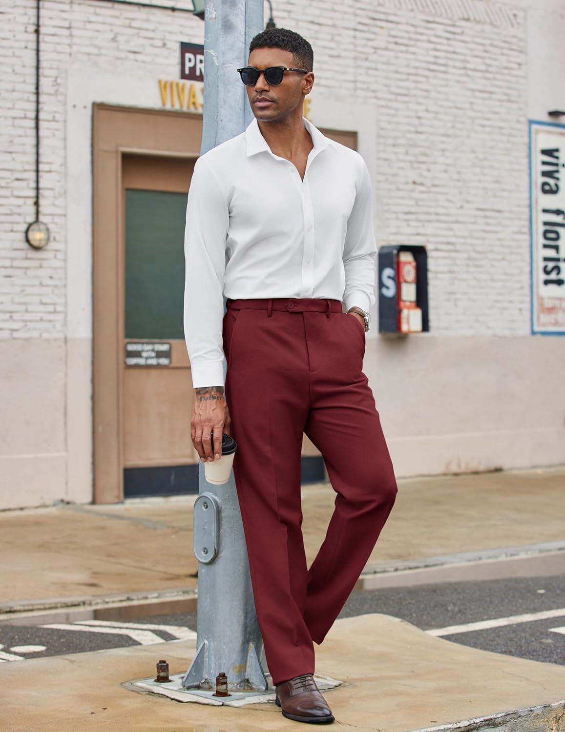 COOFANDY Mens Dress Pants Regular Fit Flat Front Pant Expandable Waist Casual Slacks(Burgundy Red)