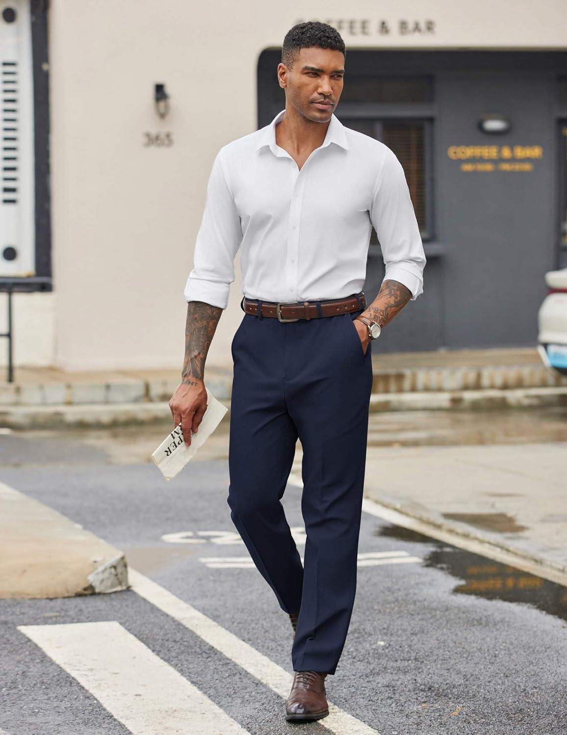 COOFANDY Mens Dress Pants Regular Fit Flat Front Pant Expandable Waist Casual Slacks(Navy Blue)