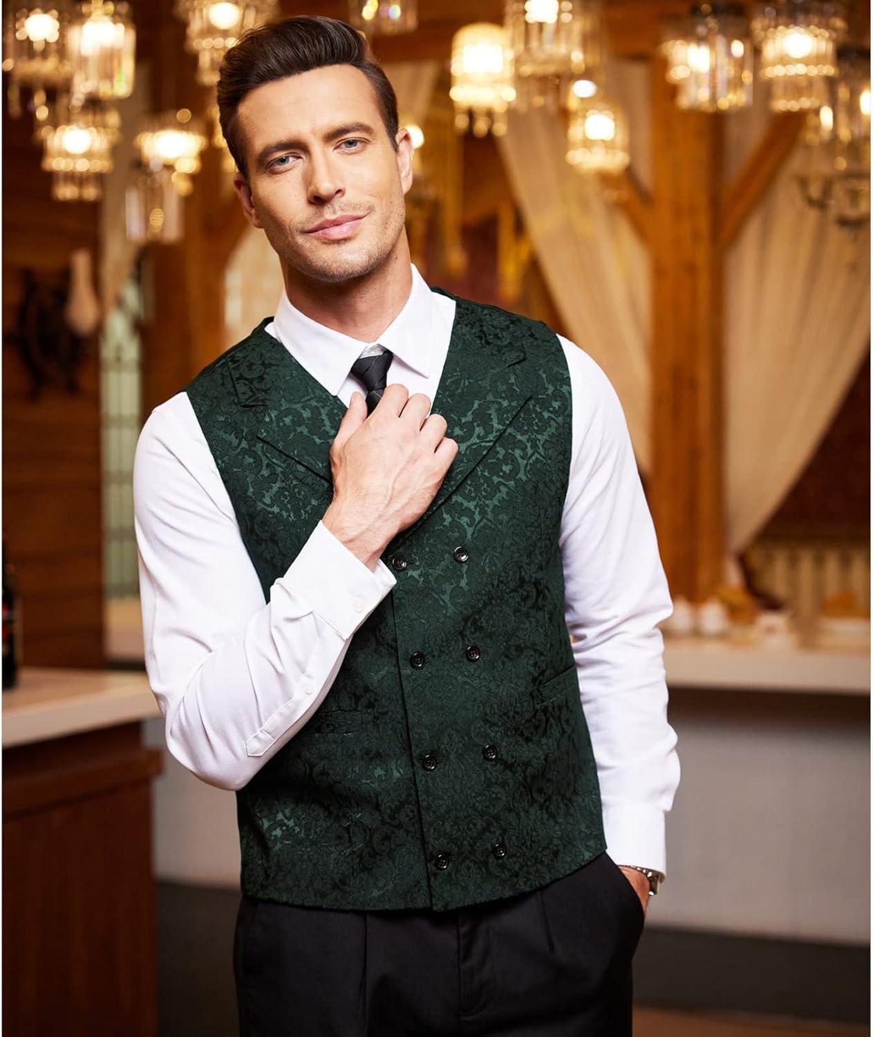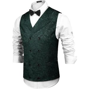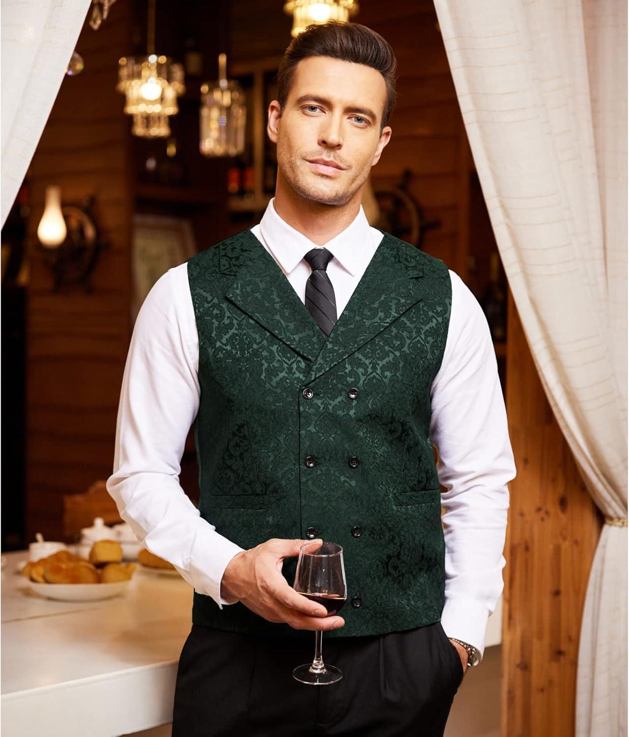 COOFANDY Mens Halloween Victorian Vest Steampunk Double Breasted Suit Vest Slim Fit Brocade Paisley Floral Waistcoat(Dark Green)