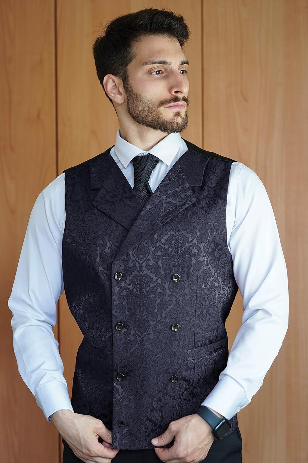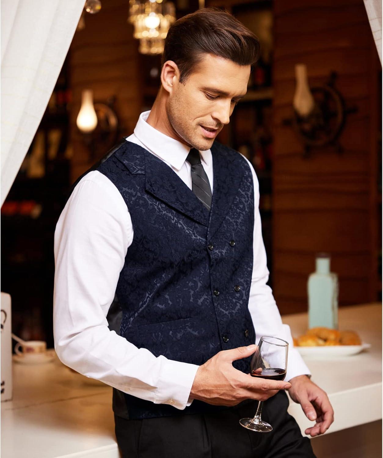 COOFANDY Mens Halloween Victorian Vest Steampunk Double Breasted Suit Vest Slim Fit Brocade Paisley Floral Waistcoat(Navy Blue)
