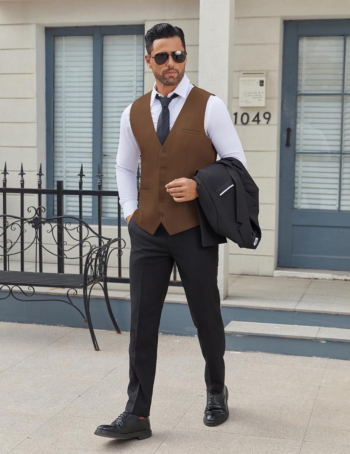 COOFANDY Men’s Business Suit Vests Slim Fit Formal Dress Waistcoat Groomsman Vest For Wedding(Brown)